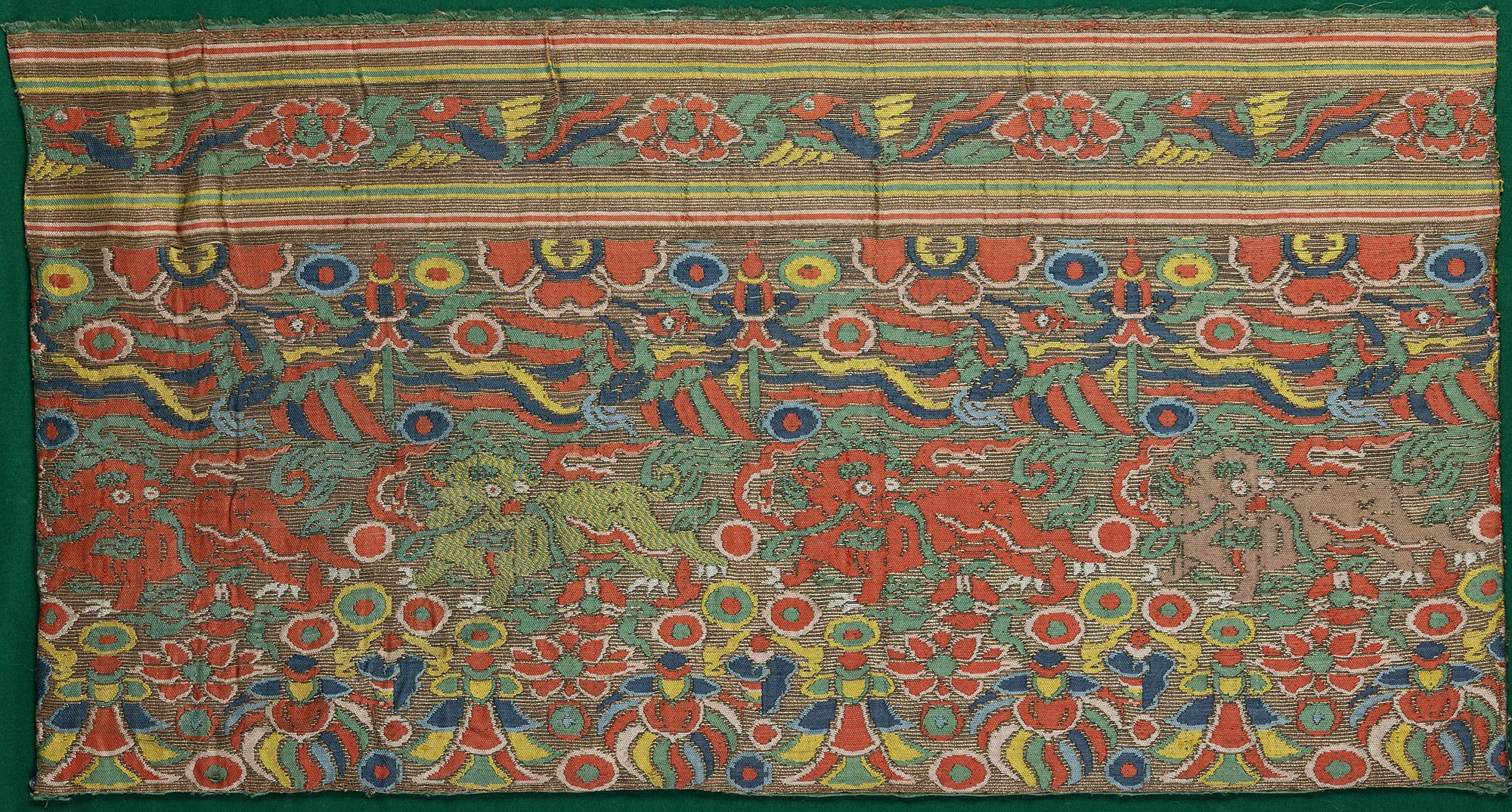 A section from a longer weaving, the fragment is woven various vibrant threads to depict an upper register of long-tailed phoenix alternating with a flower head. The main register depicts Buddhist lions clutching in its mouth the ribbon of a brocade ball, amongst cloud scrolls, all above a band of parasols. Mounted. Provenance: from a private Dutch collection. Catalogue notes: Compare an almost identical brocade section from the Myrna and Samuel Myers Collection published in J. Vollmer, Silks for Thrones and Altars, Paris, 2003, p. 87.