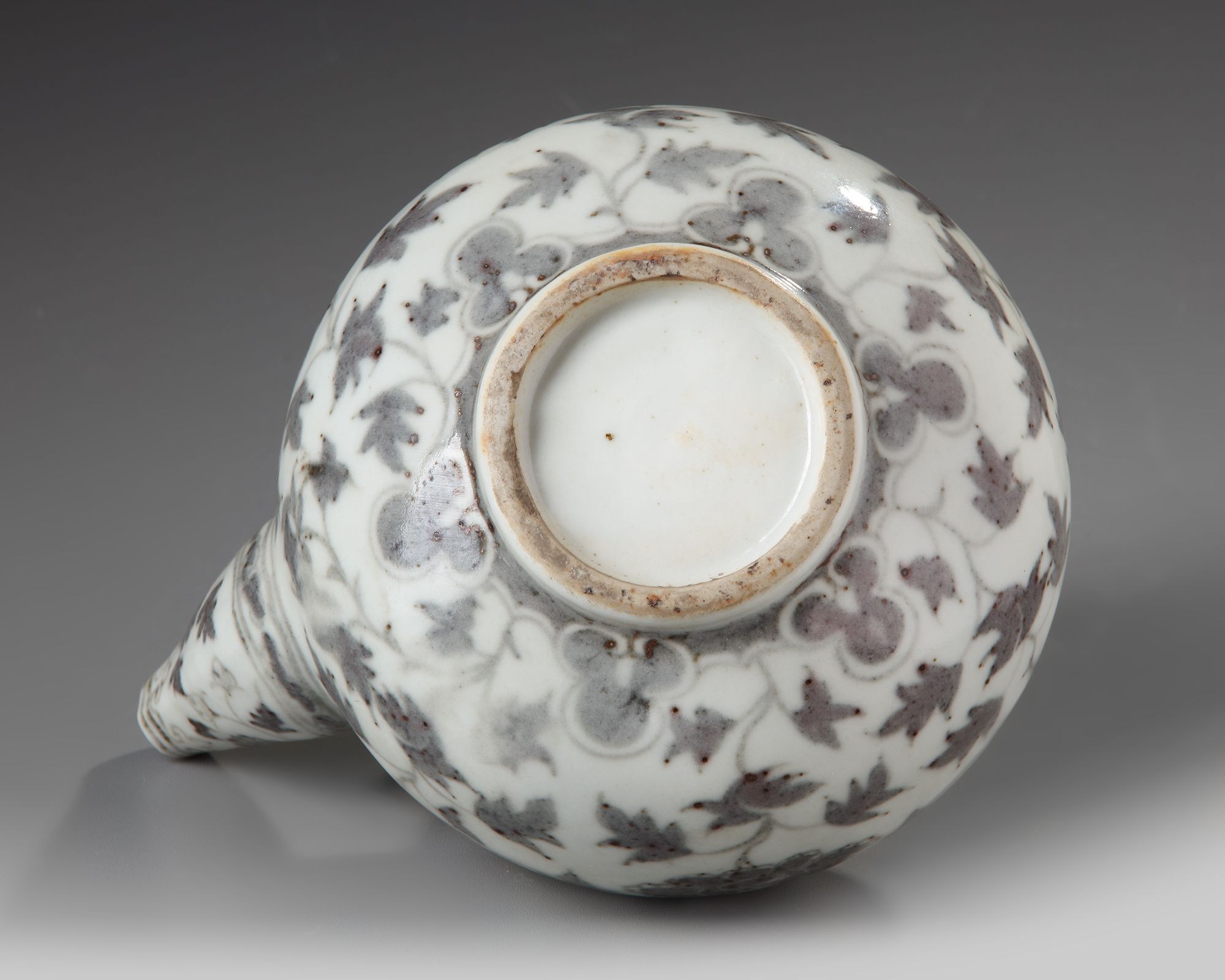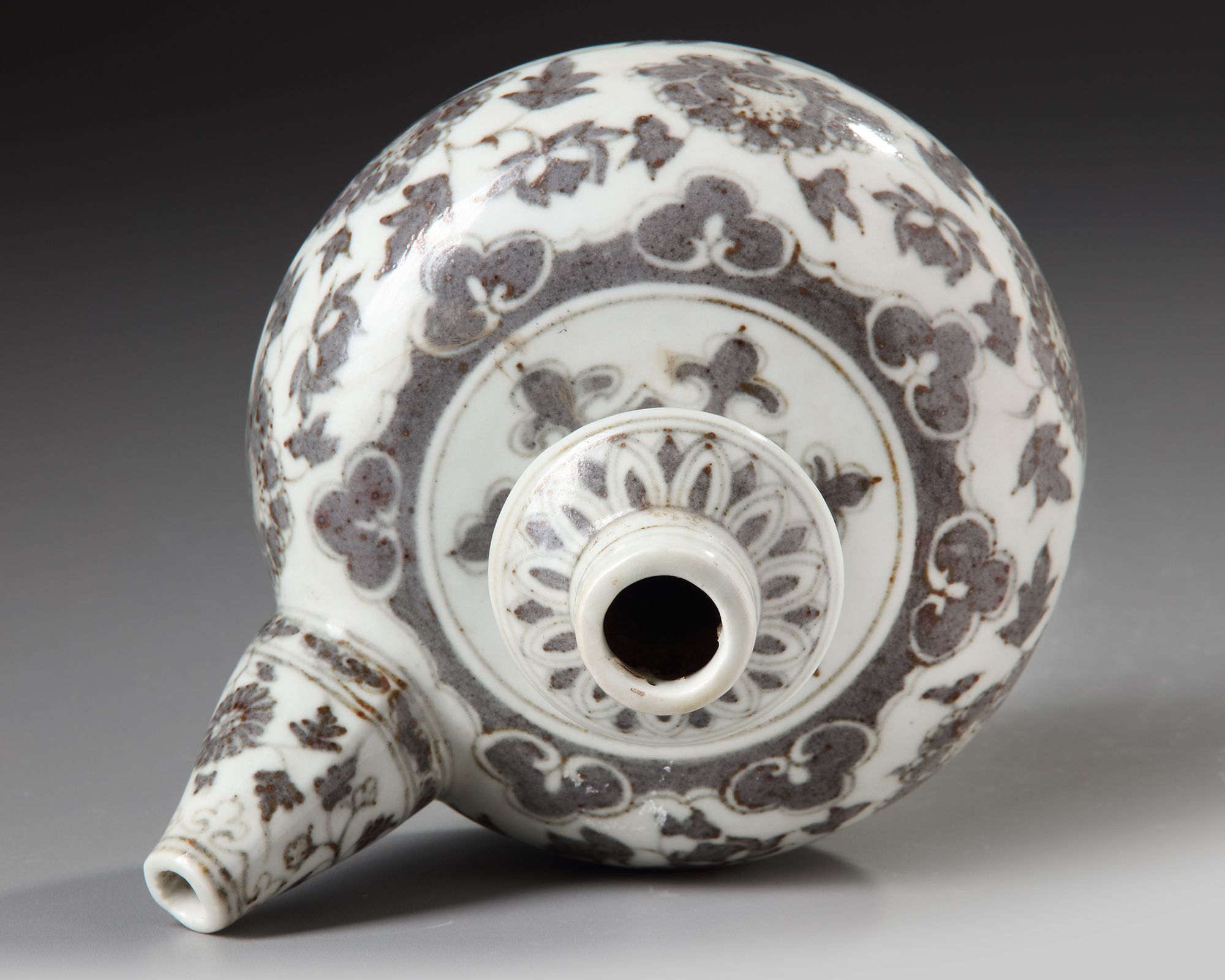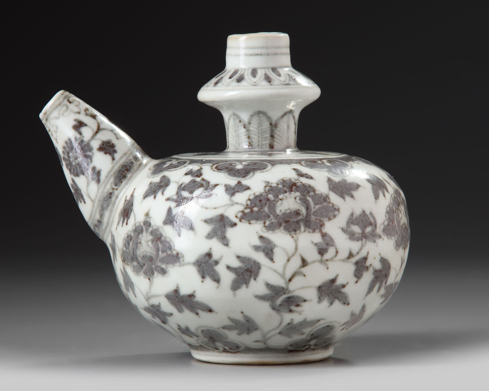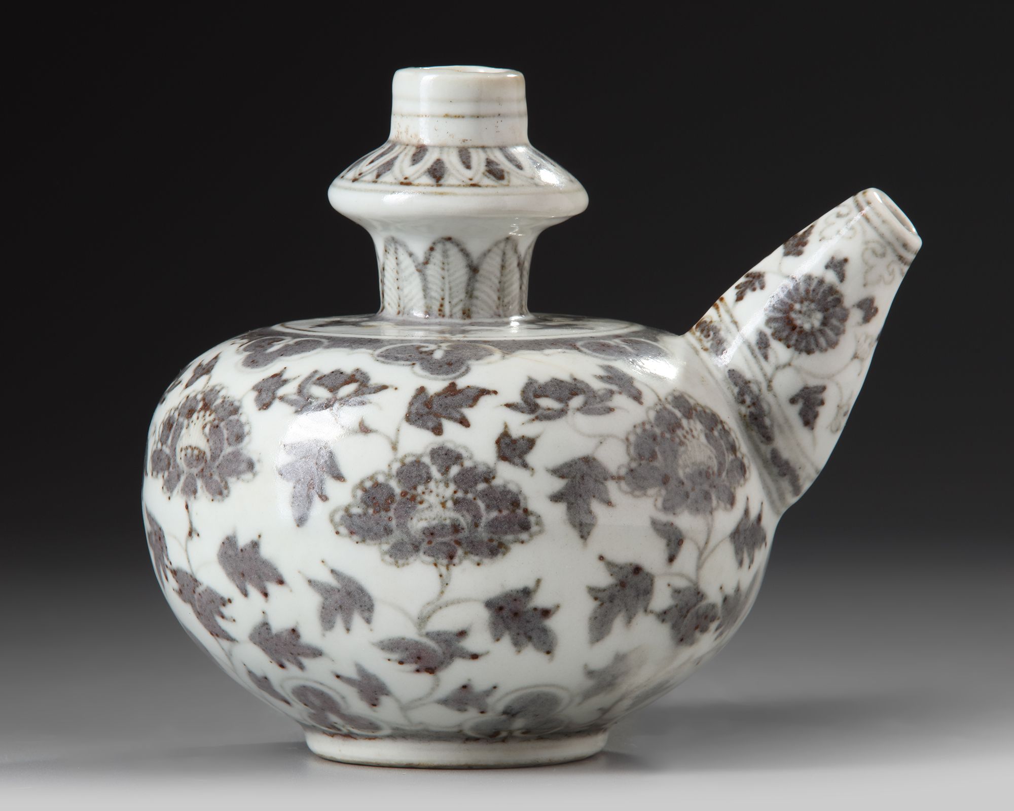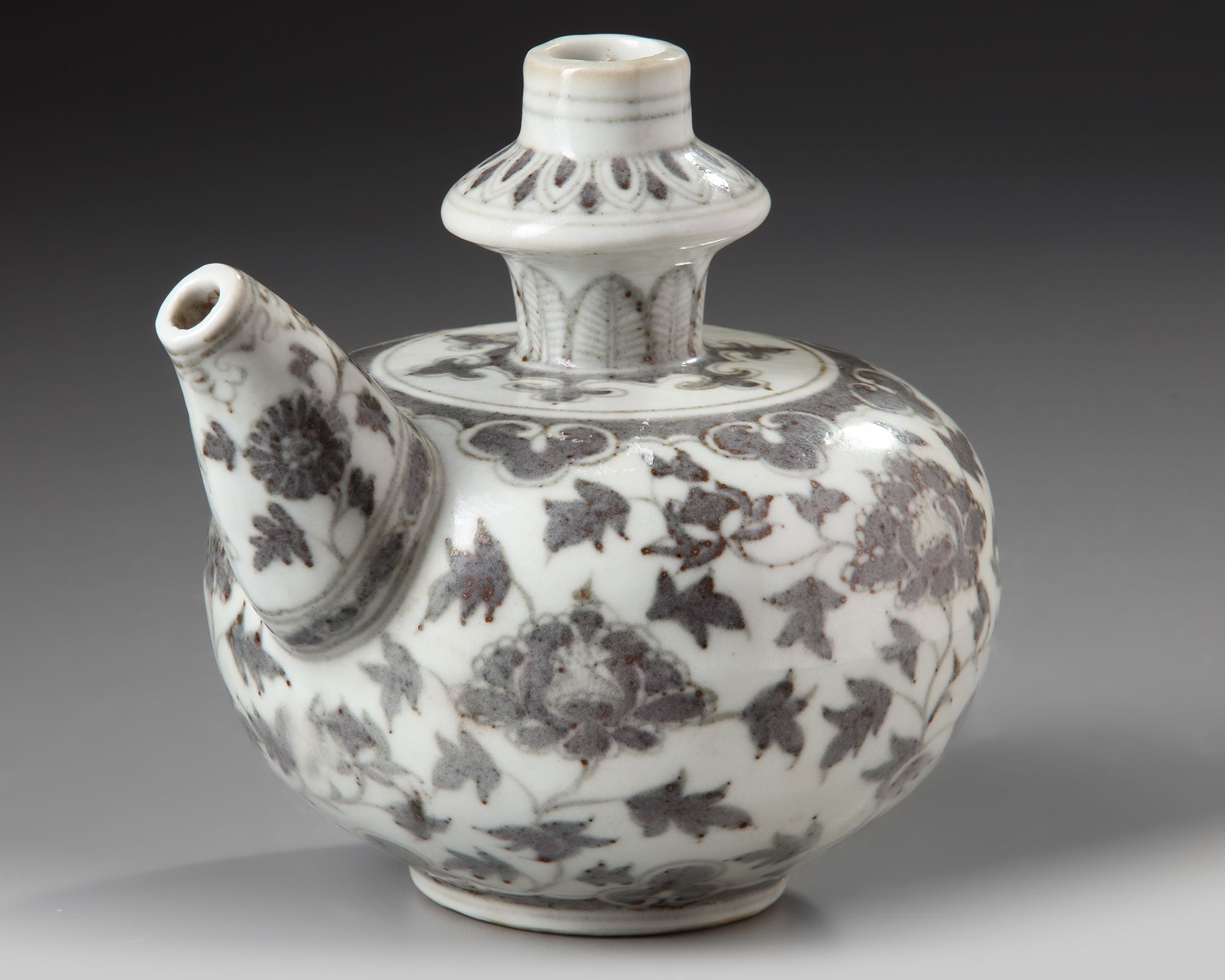The squat vessel is fashioned with a globular body and a conical spout. The exterior is decorated in copper red tone with large scrolling peonies below a ruyi head band.