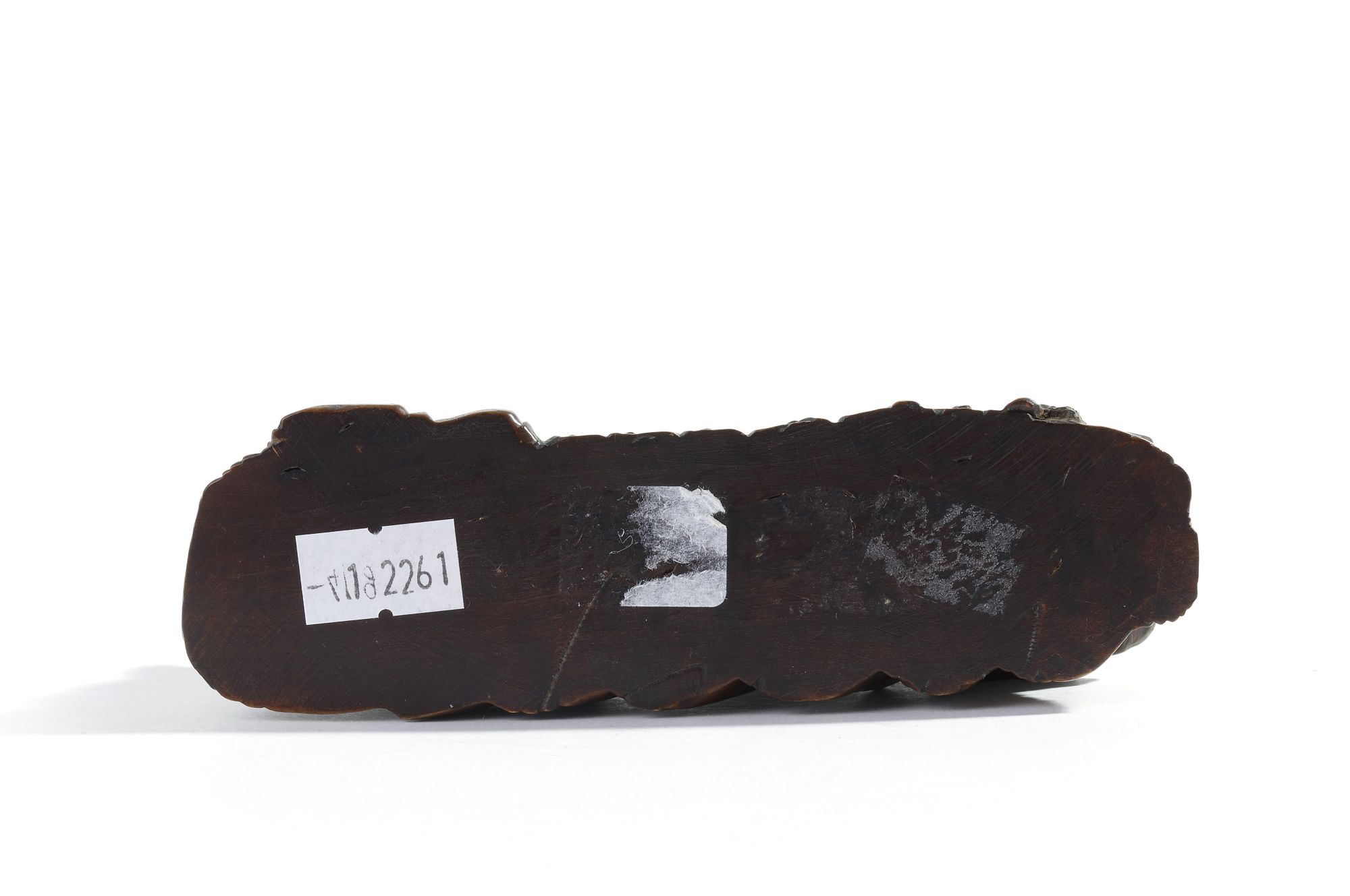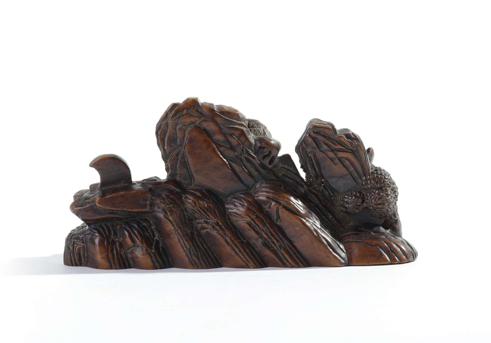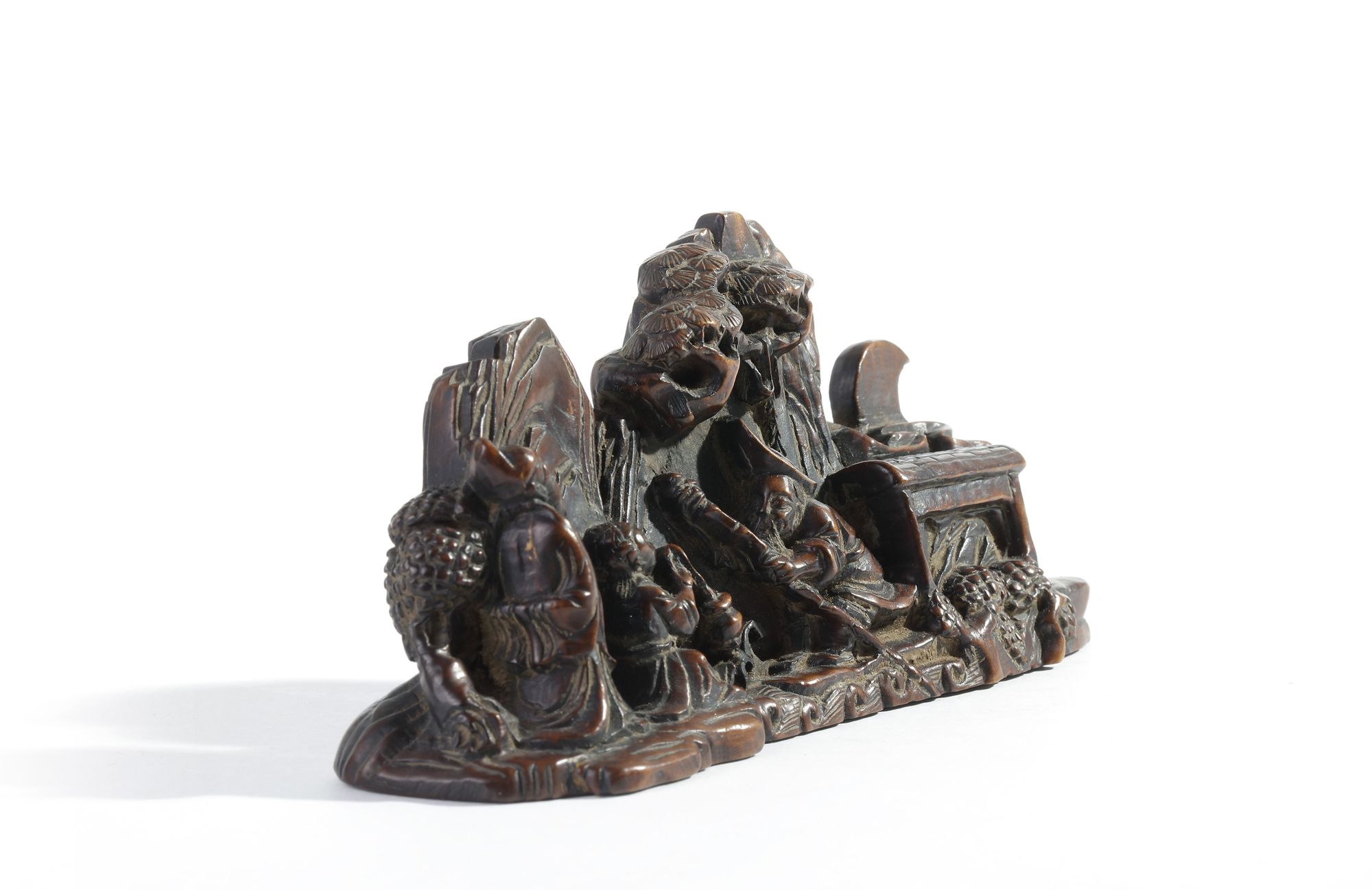 The brush rest is carved as a standing scholar and a kneeling attendant in front of a censer, meeting a bearded hermit on a river raft with a pavilion behind him, all amongst wisteria and trees in a mountainous landscape.