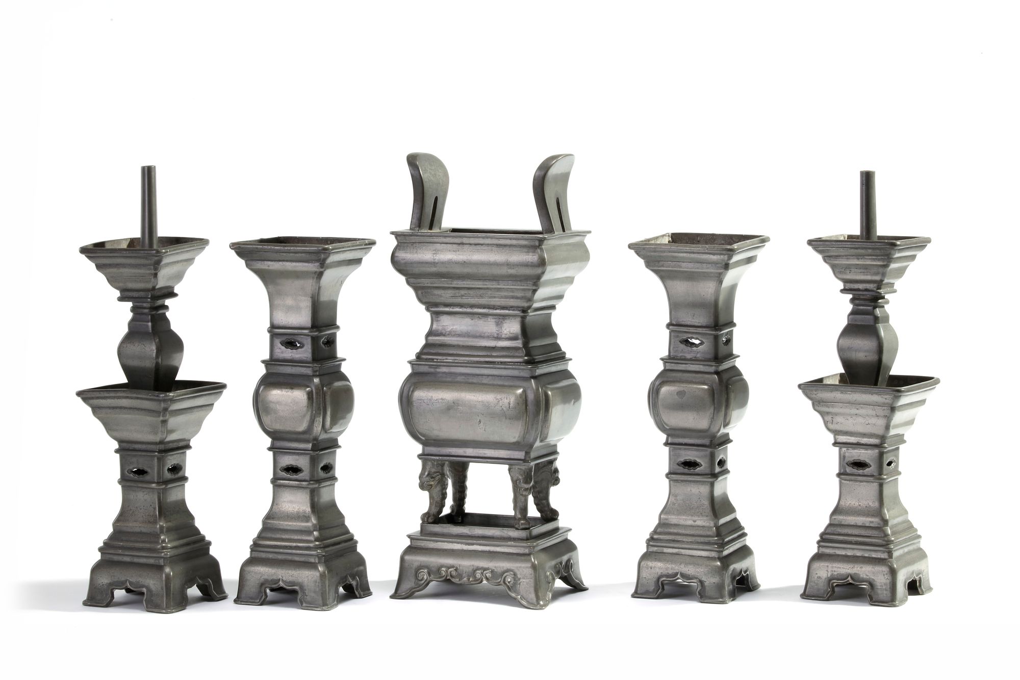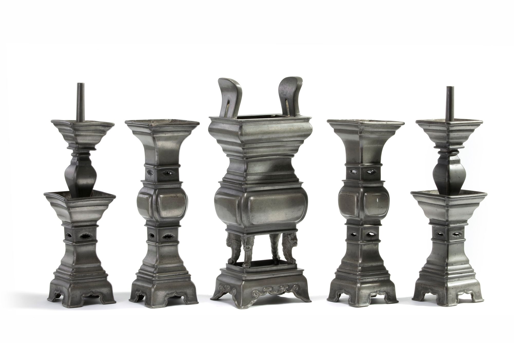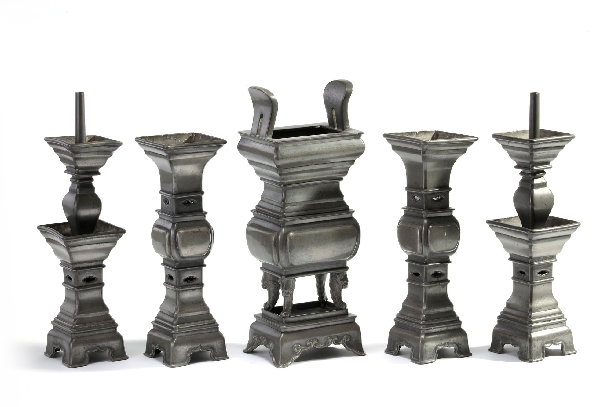 Comprising: a fang ding with two upright handles standing on four beast head feet, on a removable stand with ruyi head feet; two gu vases and two handle holders, all with pierced foliate decoration, standing on ruyi shaped feet. The fang ding and the two gu vases are each stamped marked 'Gong He zao'