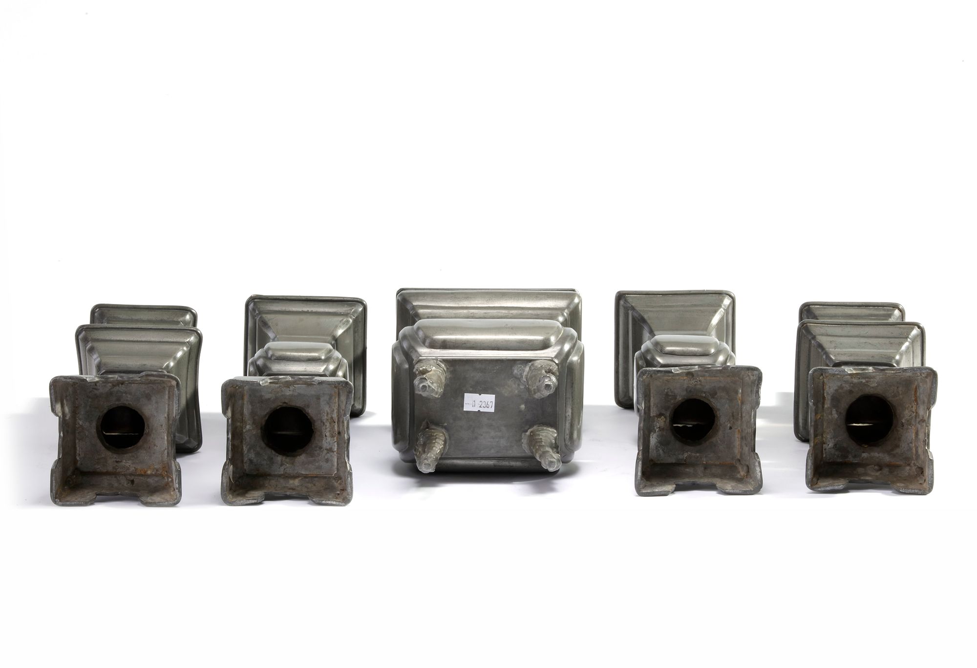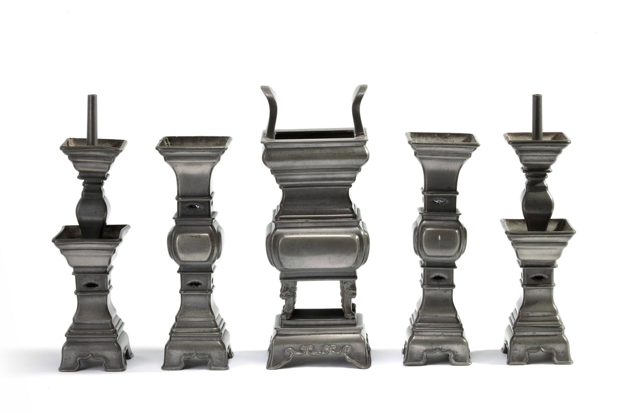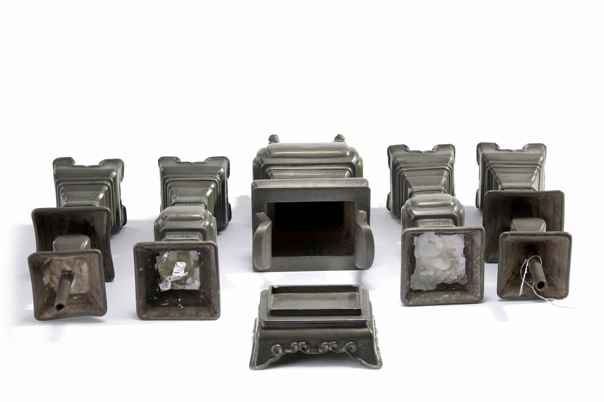 Comprising: a fang ding with two upright handles standing on four beast head feet, on a removable stand with ruyi head feet; two gu vases and two handle holders, all with pierced foliate decoration, standing on ruyi shaped feet. The fang ding and the two gu vases are each stamped marked 'Gong He zao'
