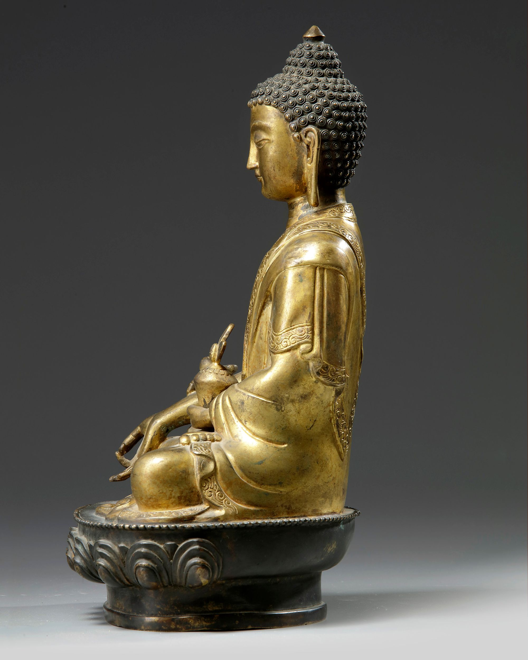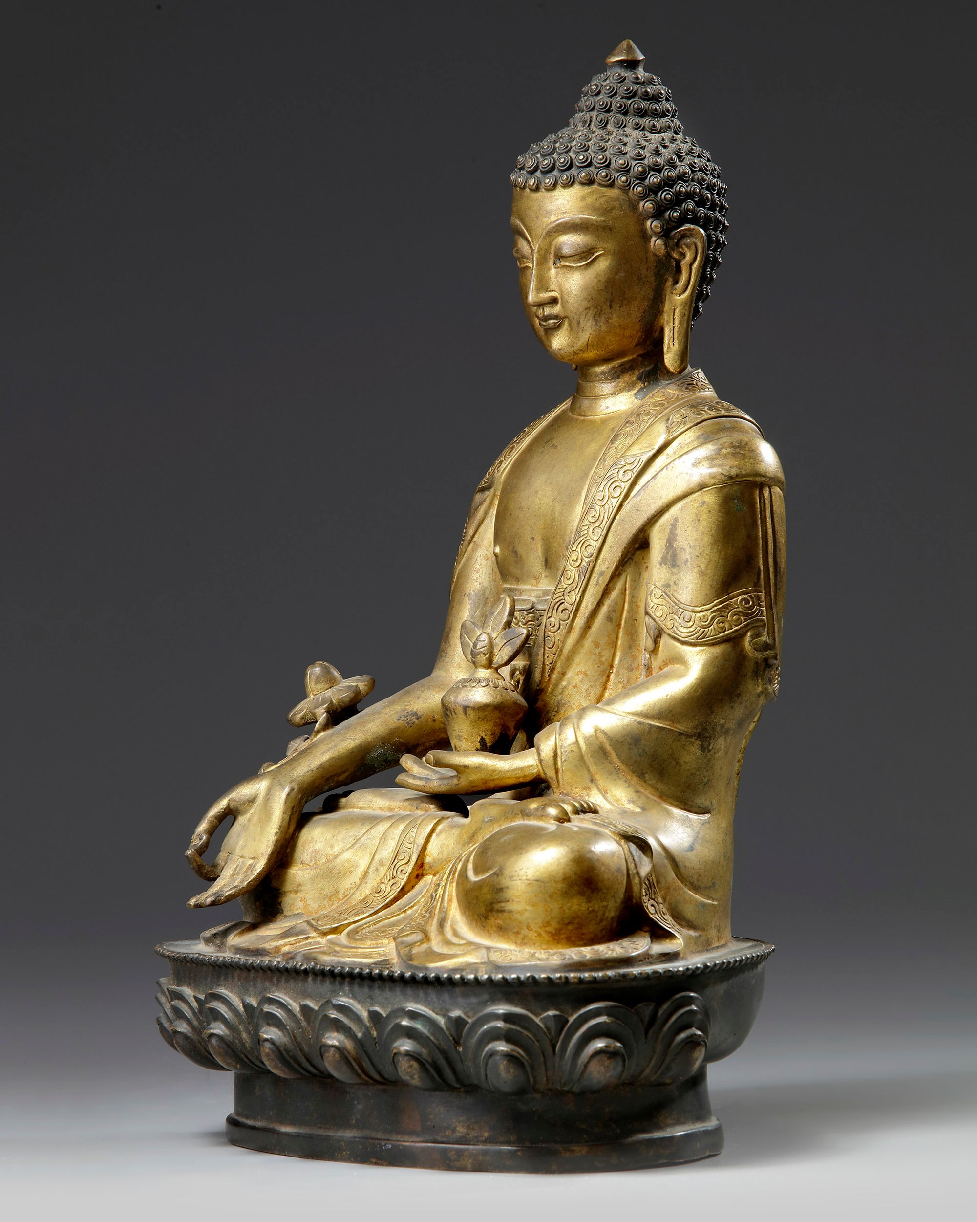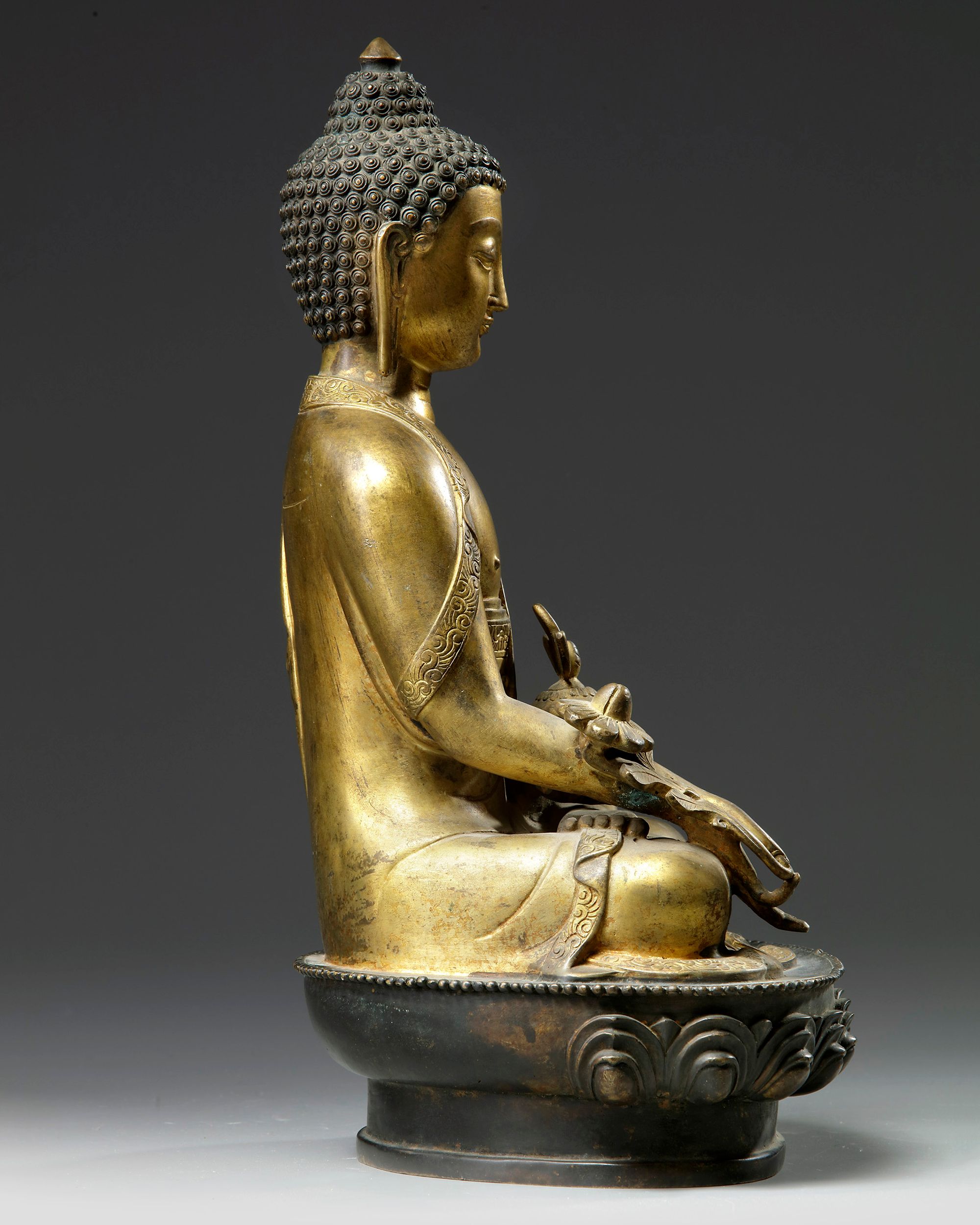 The figure is modelled with pendulous earlobes and a serene expression on his face, one of his hands holds a kalasha while the other holds a flower stem. He is wearing robes decorated with scrolls at the hems and his legs are crossed in padmasana. He is seated on an ungilt single lotus base.