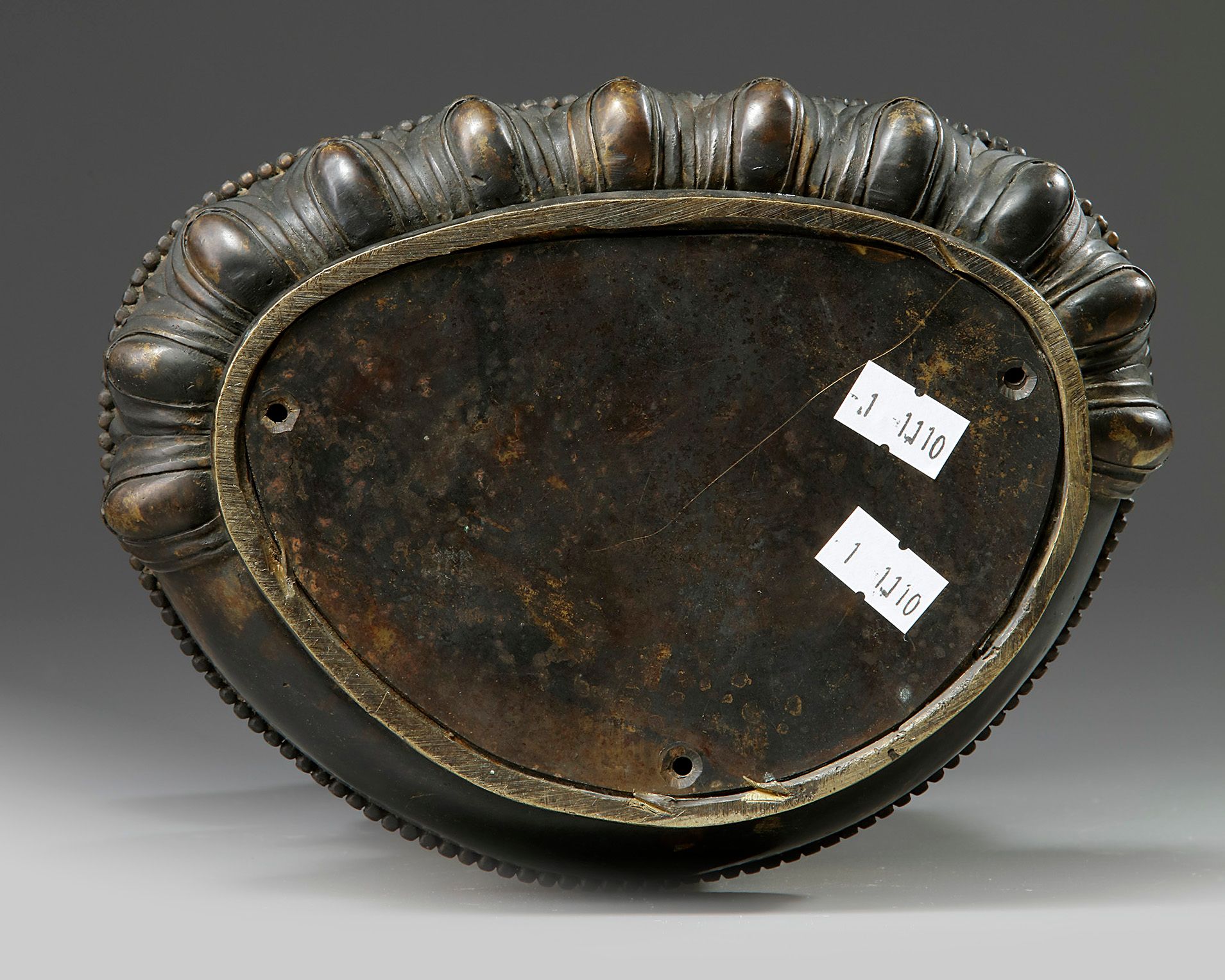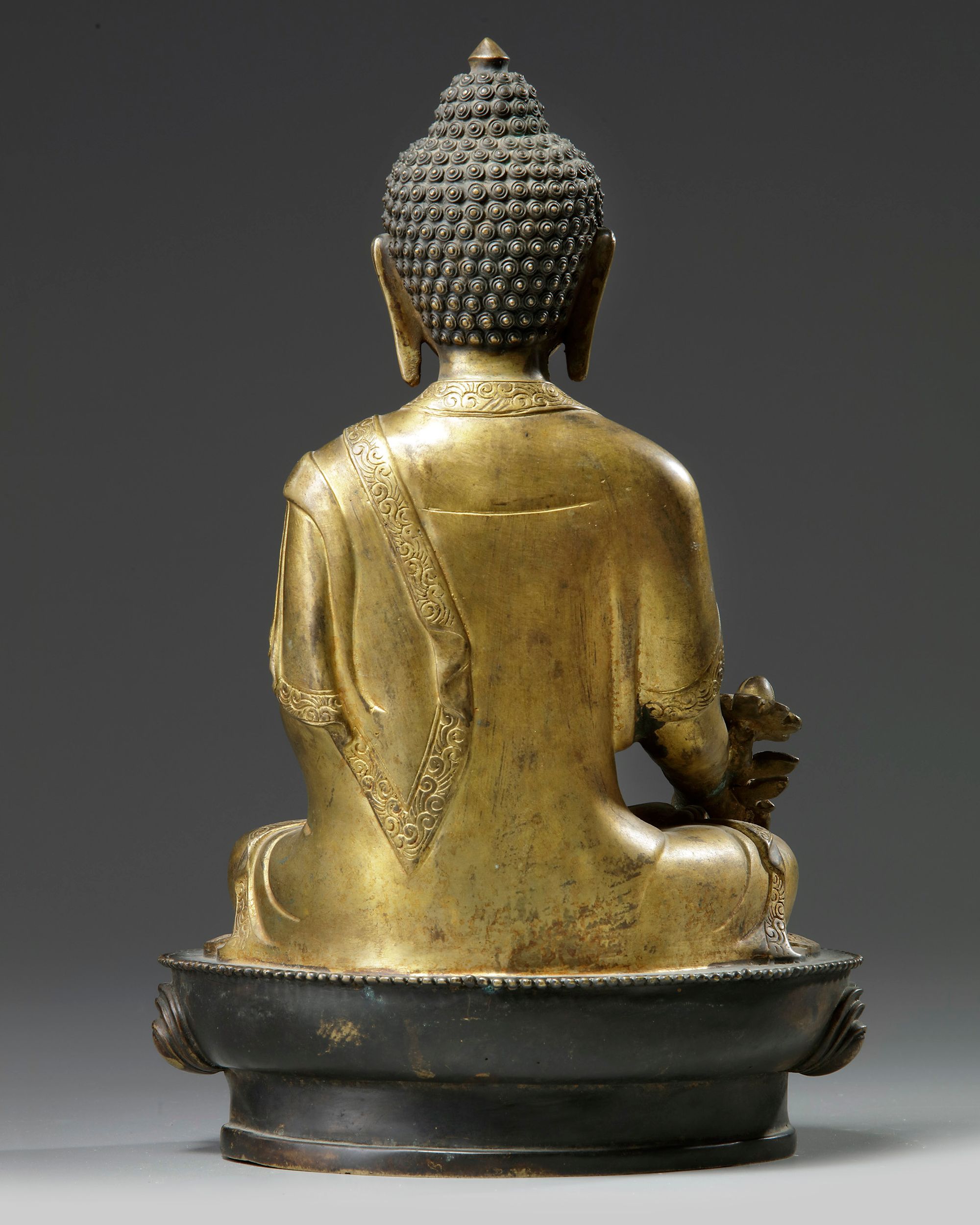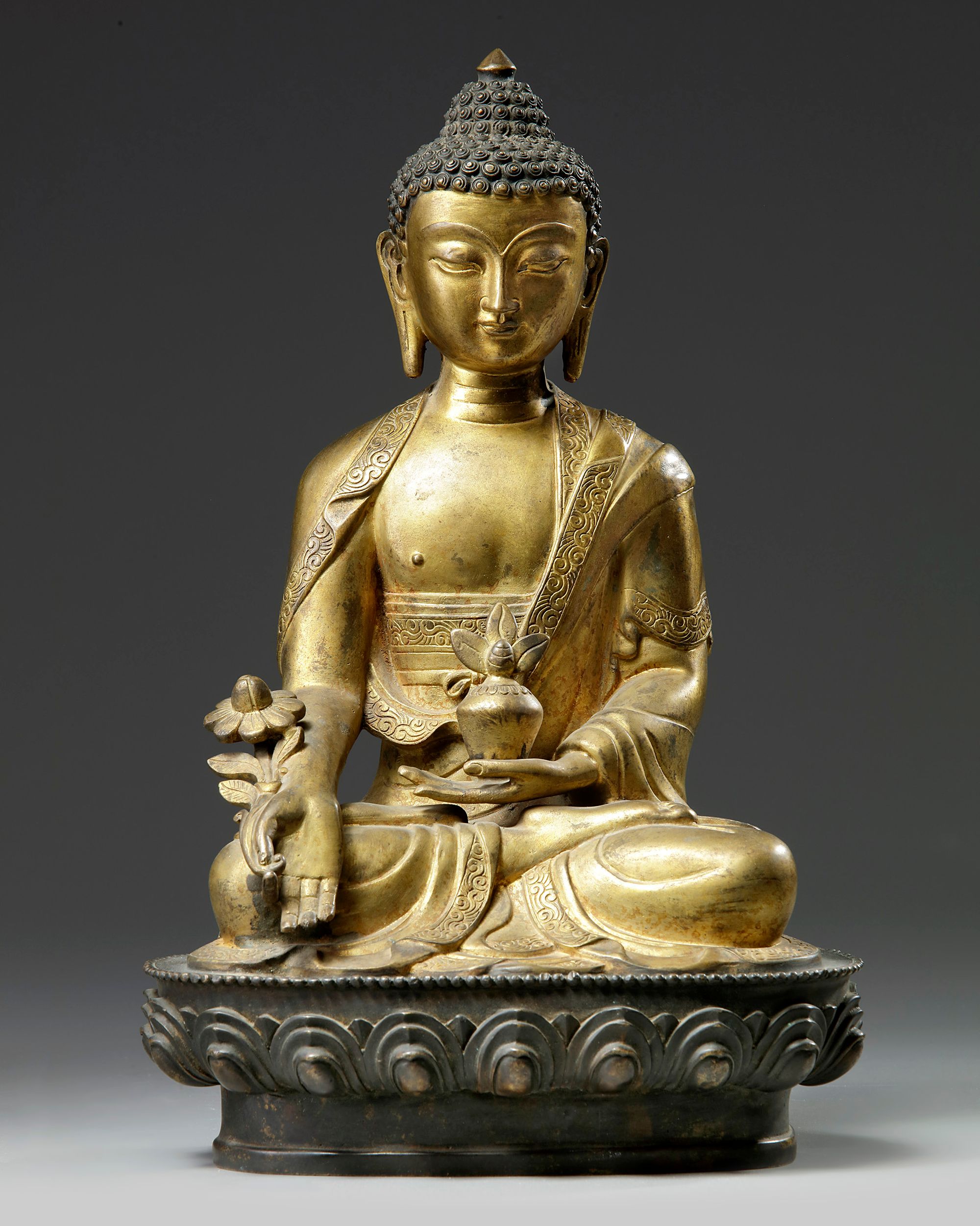 The figure is modelled with pendulous earlobes and a serene expression on his face, one of his hands holds a kalasha while the other holds a flower stem. He is wearing robes decorated with scrolls at the hems and his legs are crossed in padmasana. He is seated on an ungilt single lotus base.