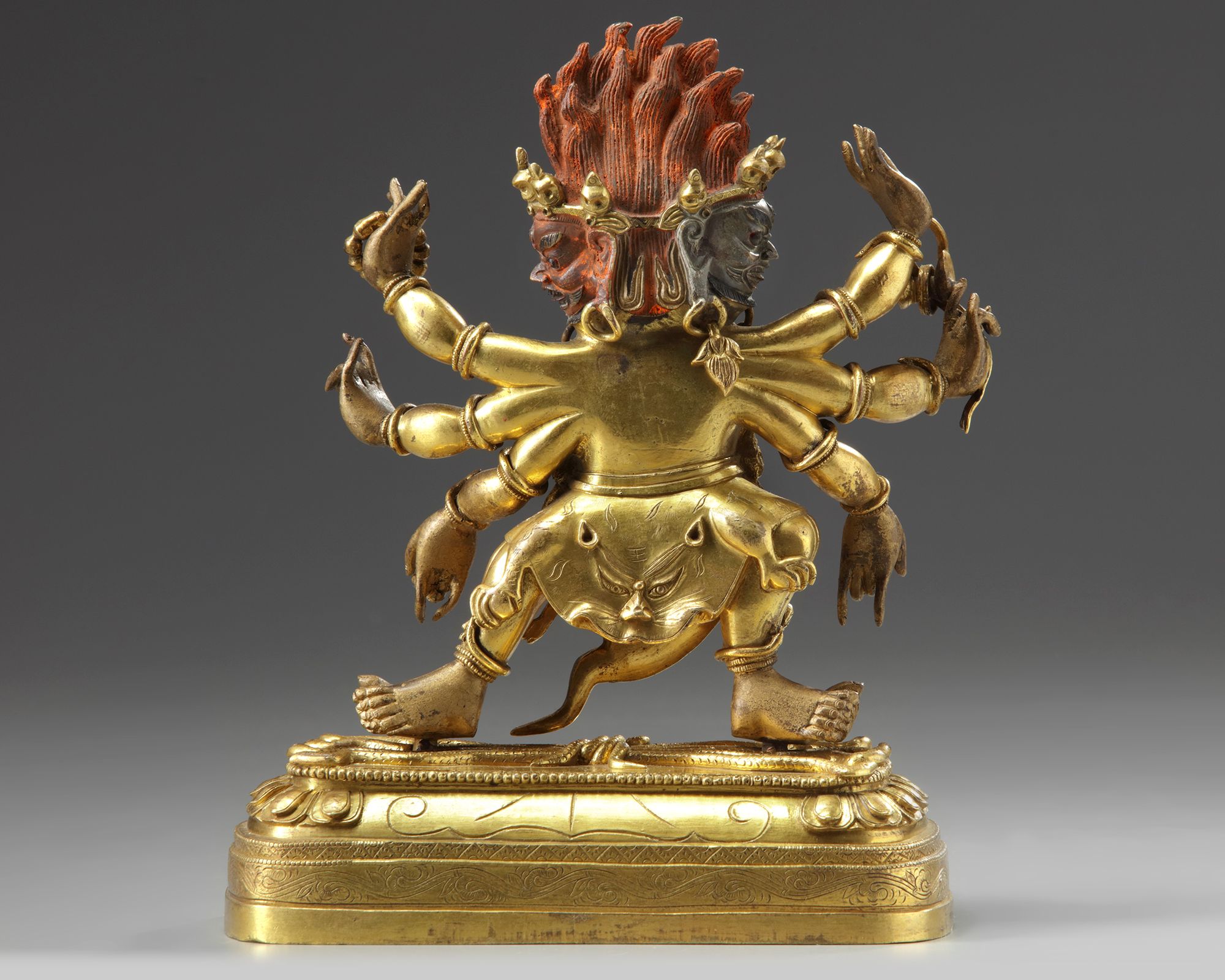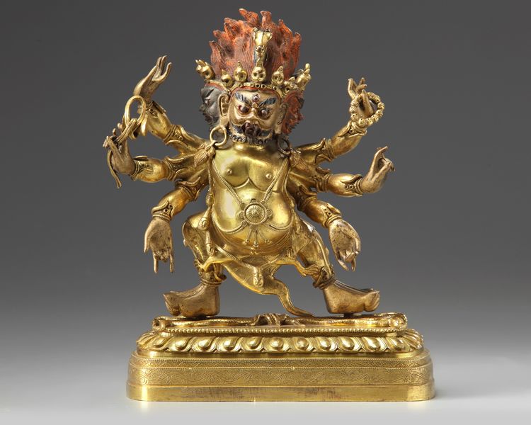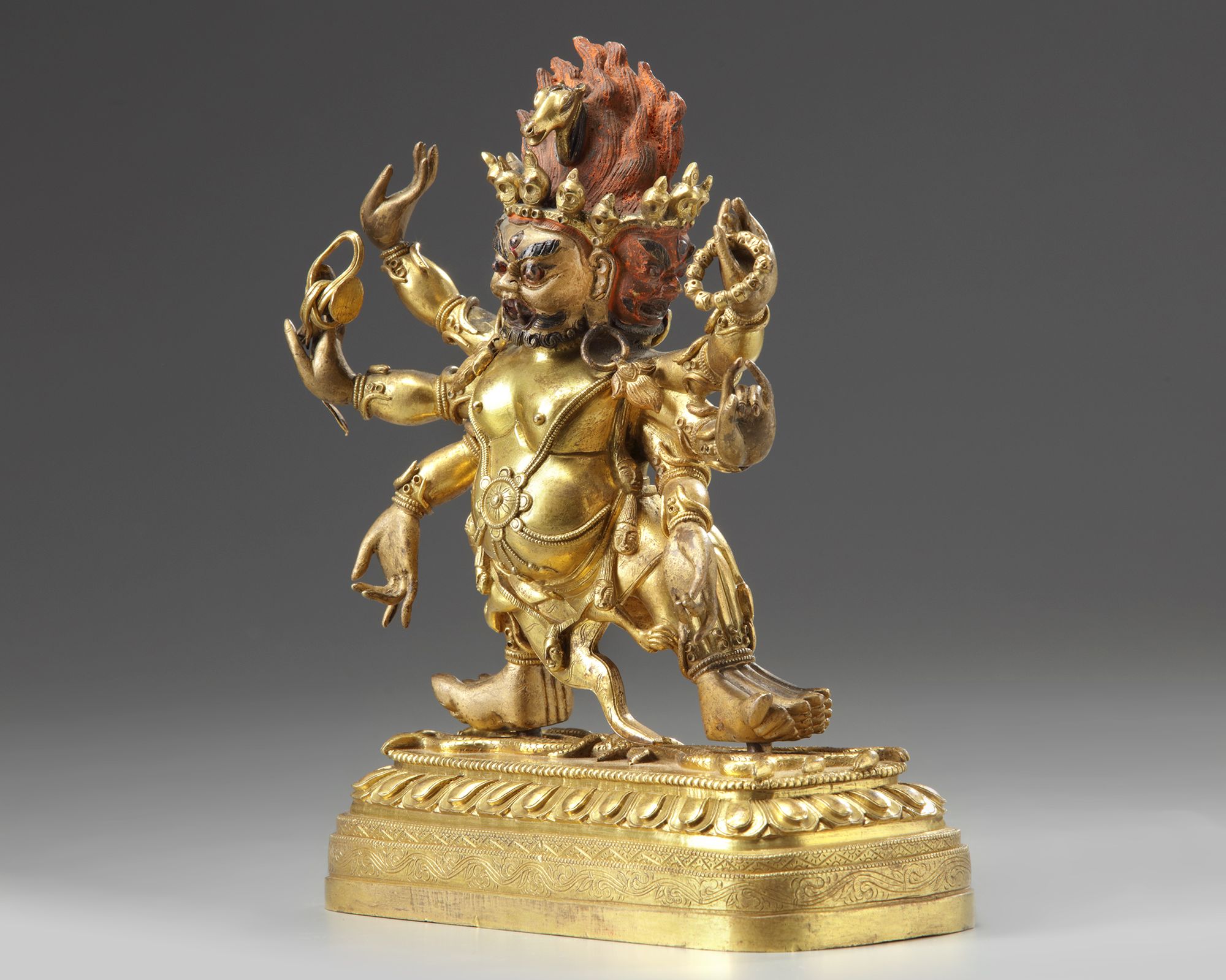 The wrathful deity is modelled with three heads and surmounted by a horse head, his six arms each old a different attribute. He stands on a single lotus base.