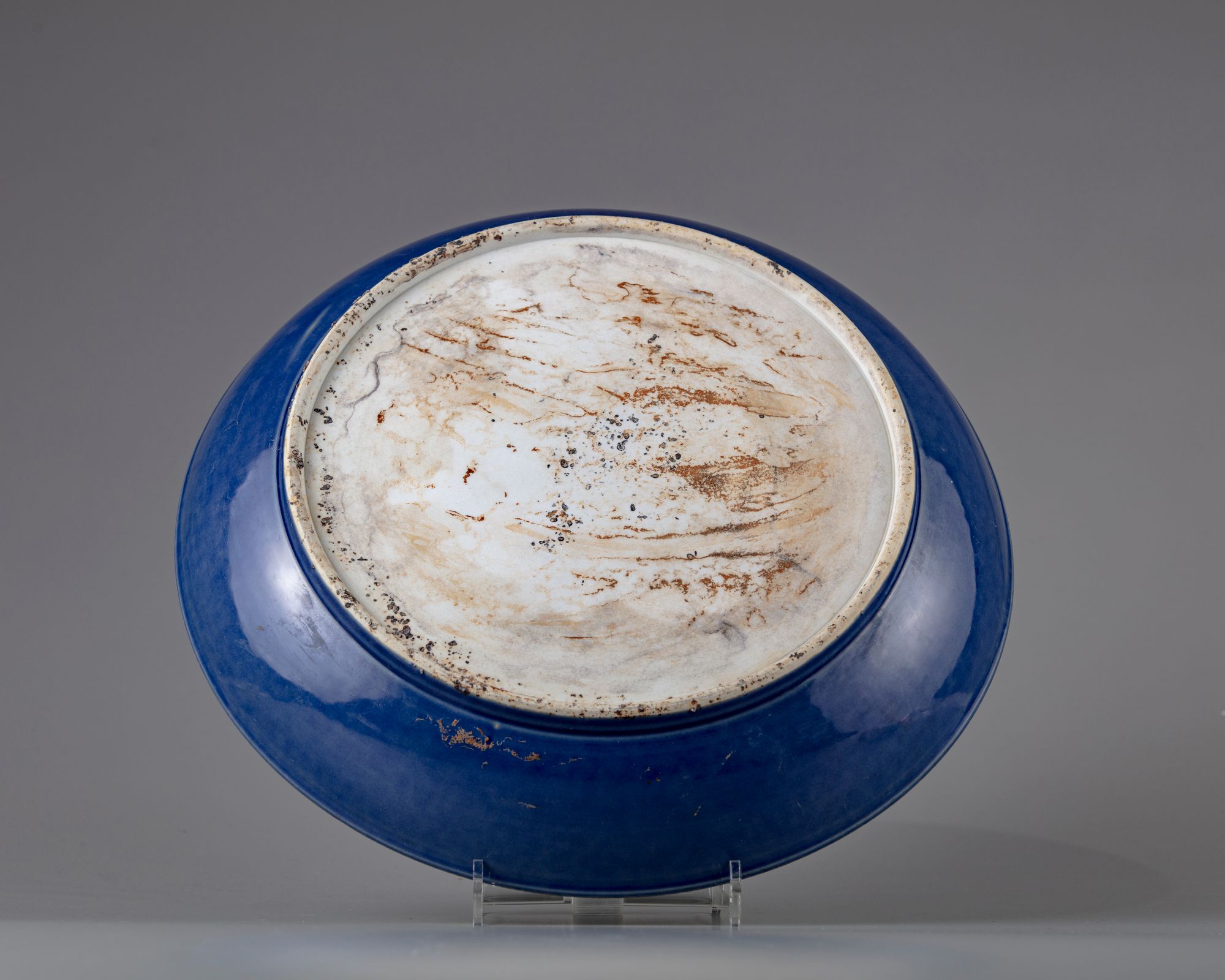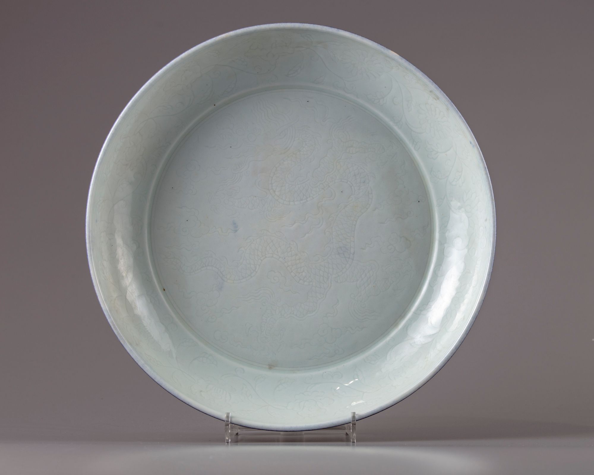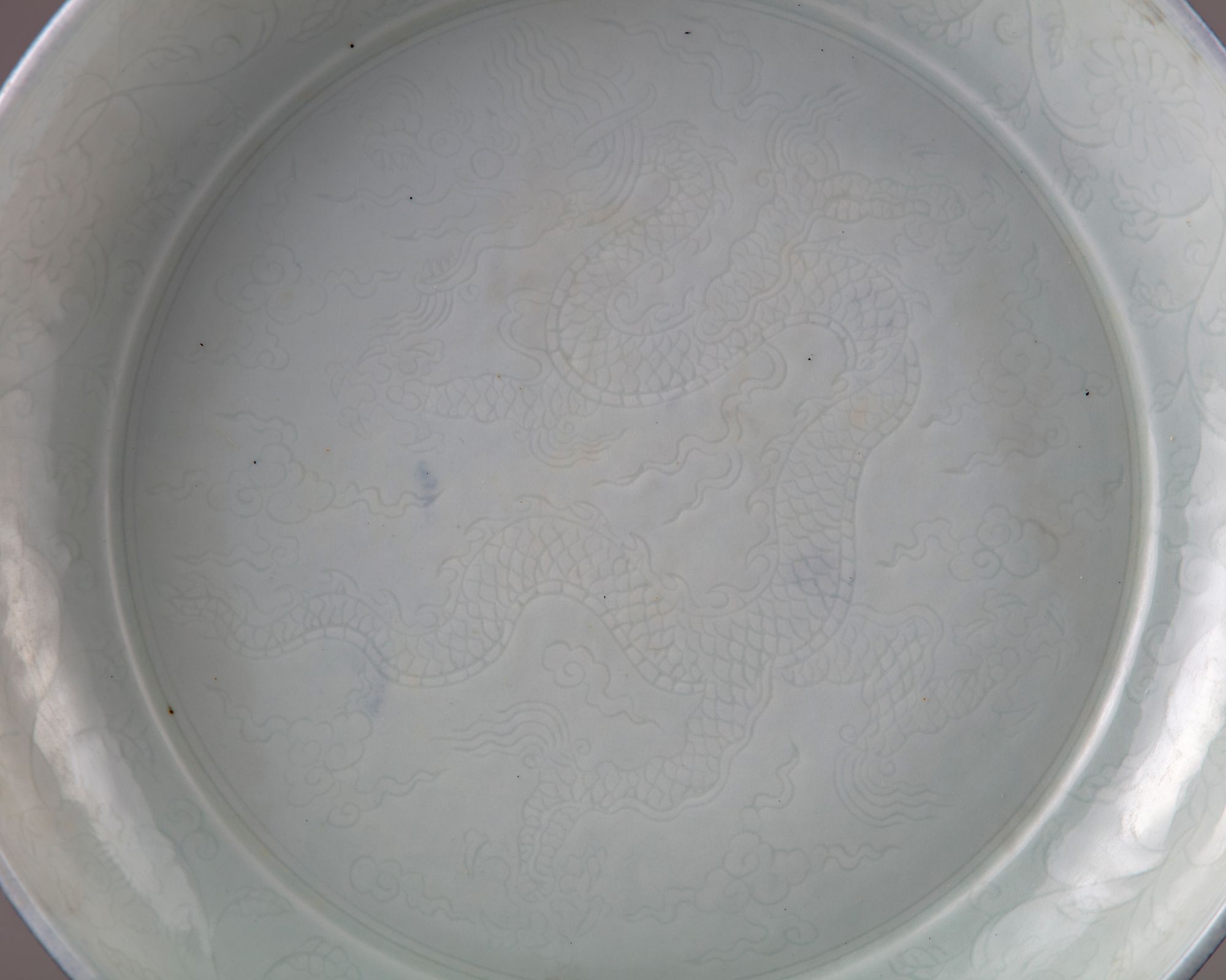 The charger is decorated to centre with an incised dragon amongst clouds, the sides with peony scrolls.The exterior is covered with a blue glaze.