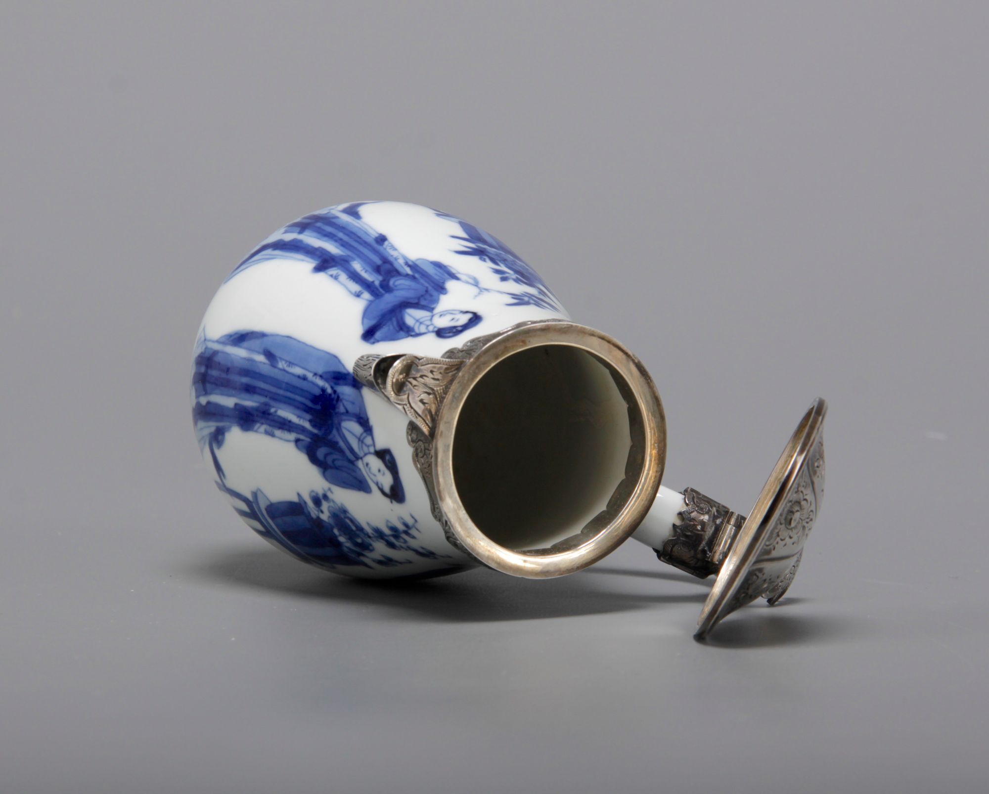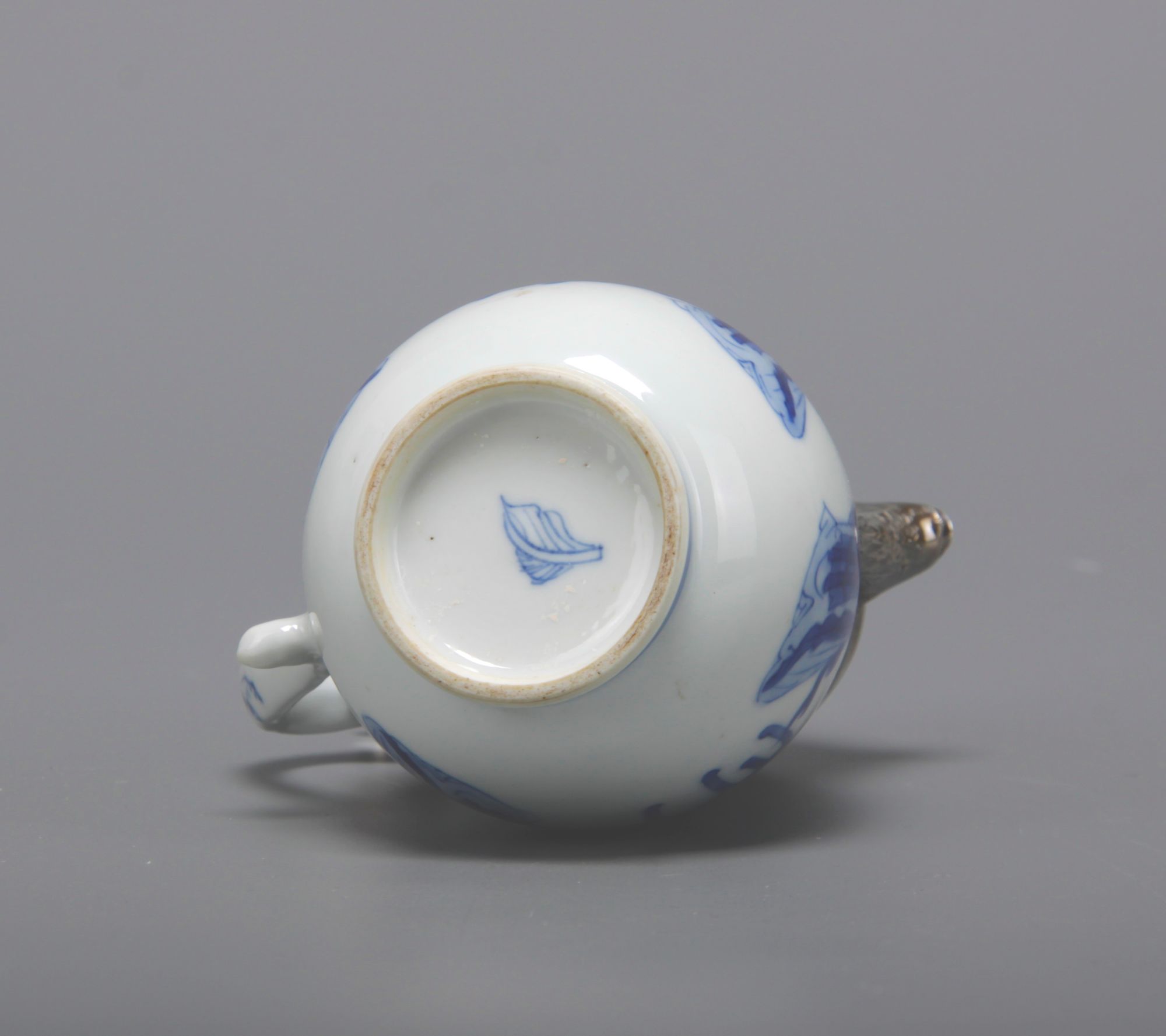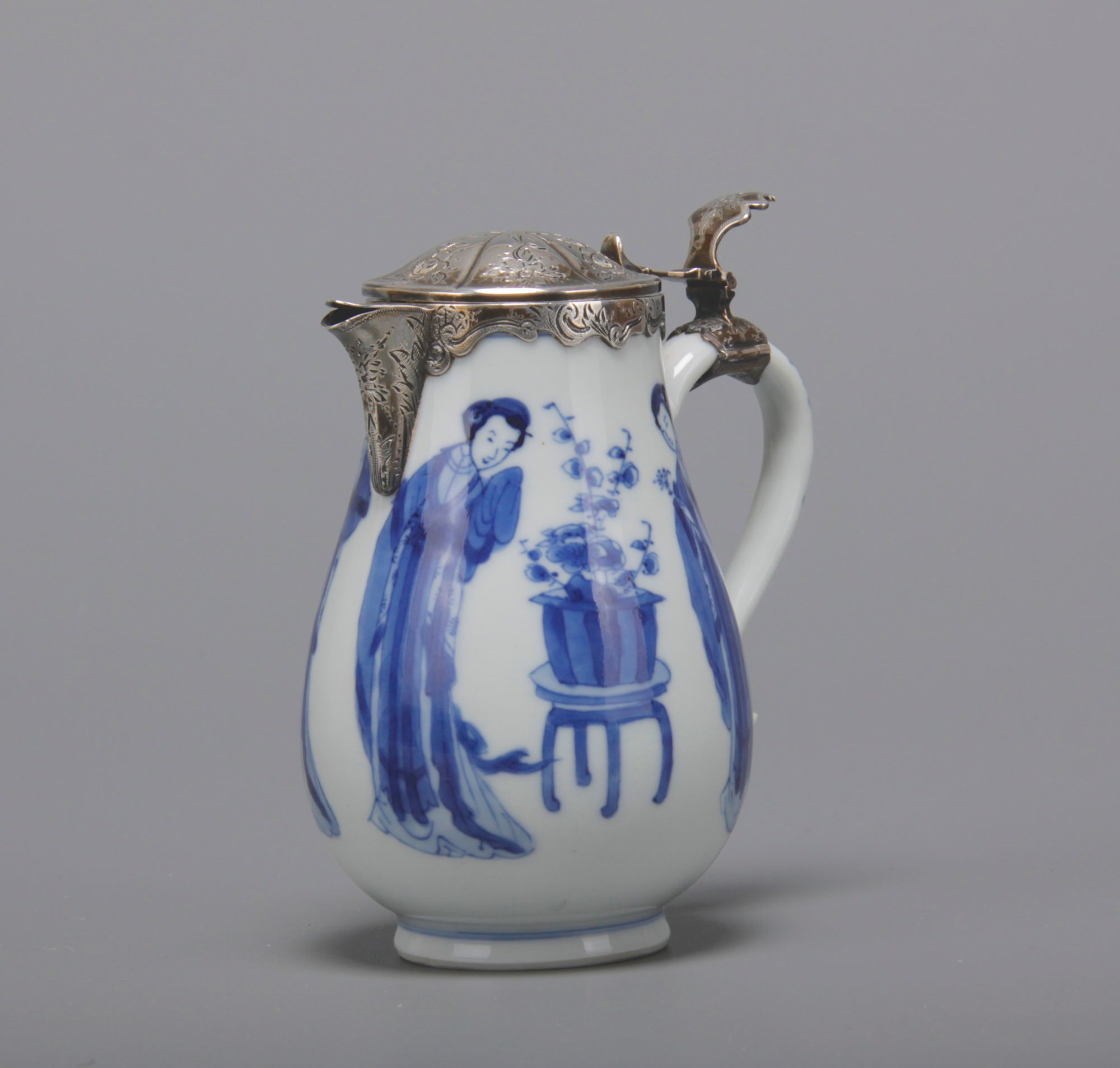 The body decorated with two long Elizas to each side and surmounted by a silver spout and cover (of later date and possibly English).