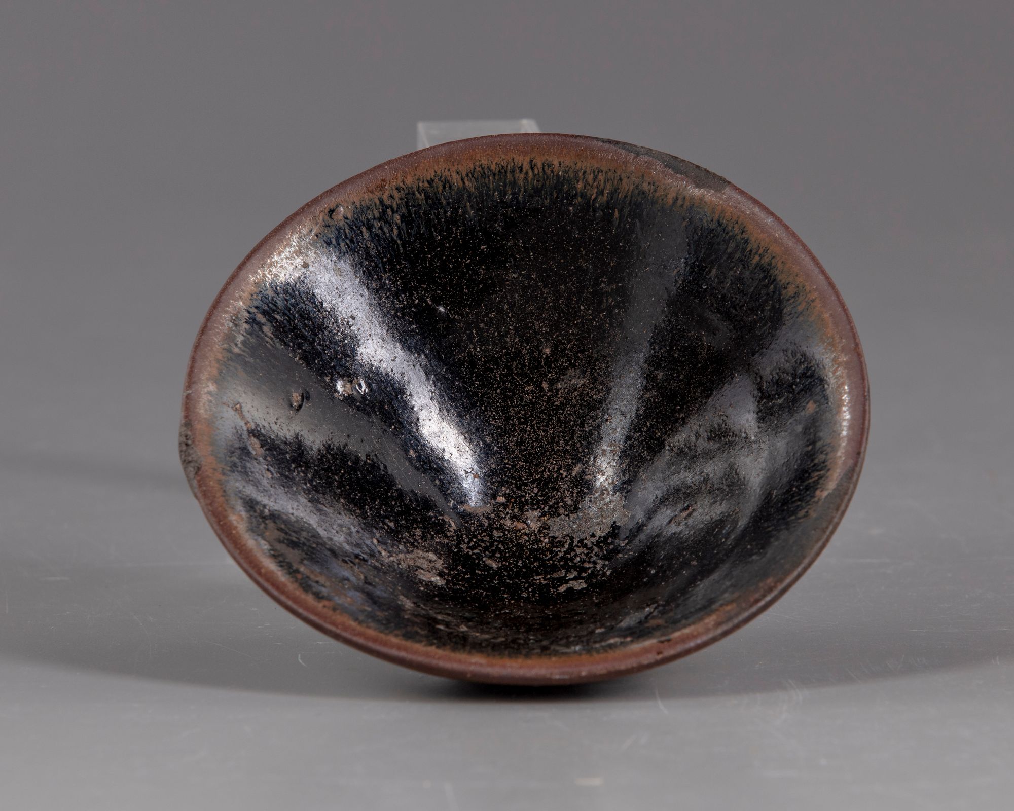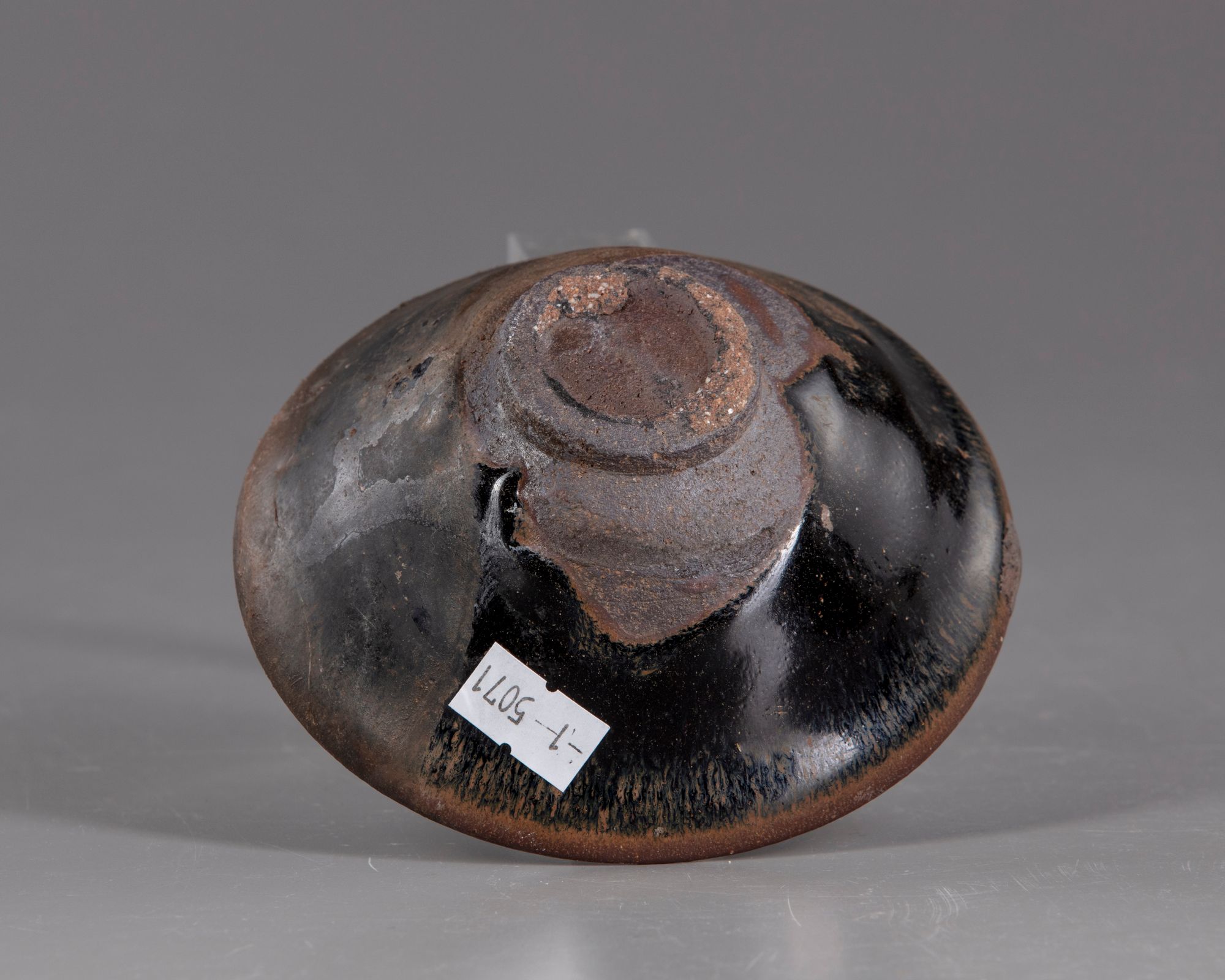 The bowl is decorated with a dark, lustrous glaze with brown russet streaks trailing to the centre imitating the fur of a hare.