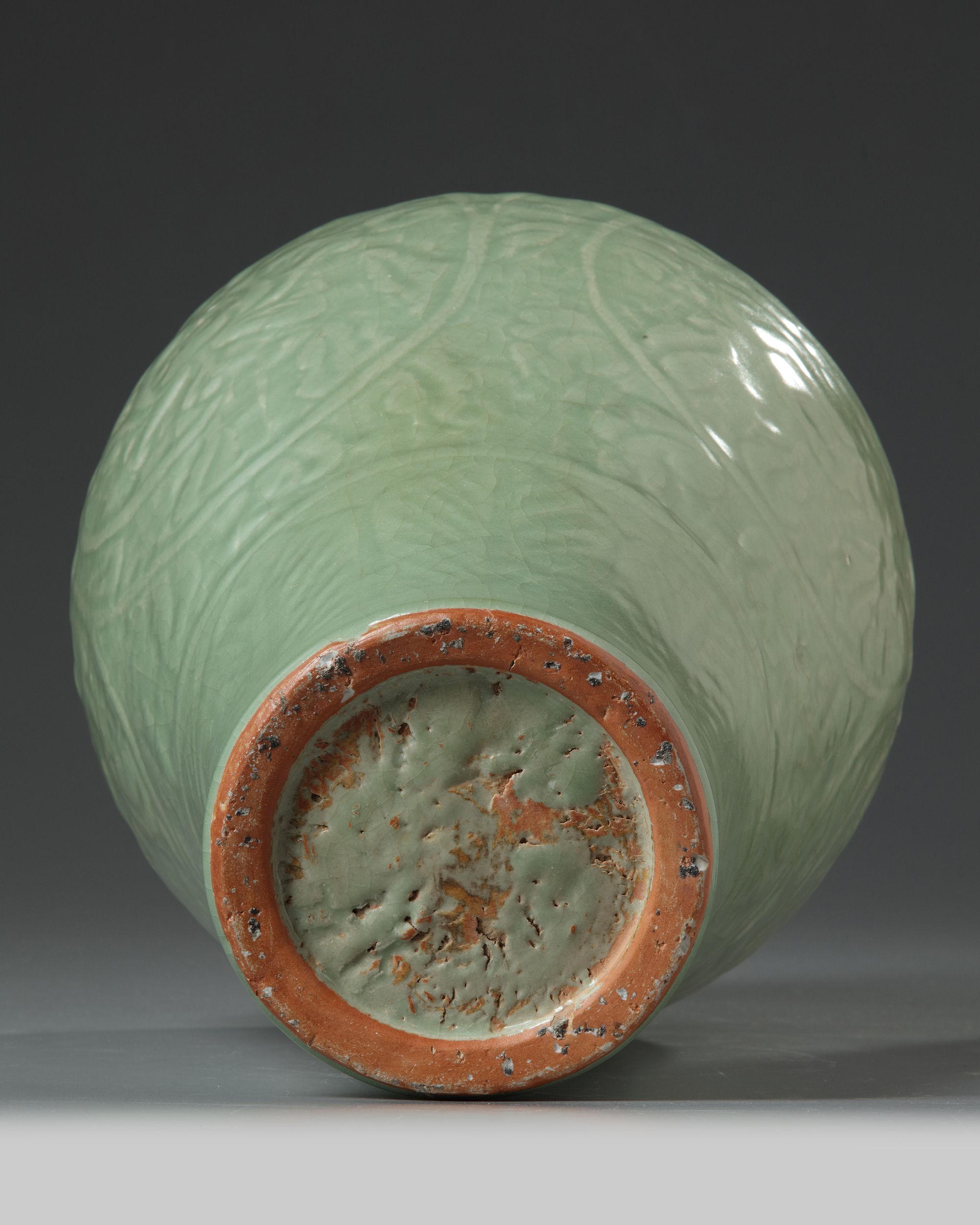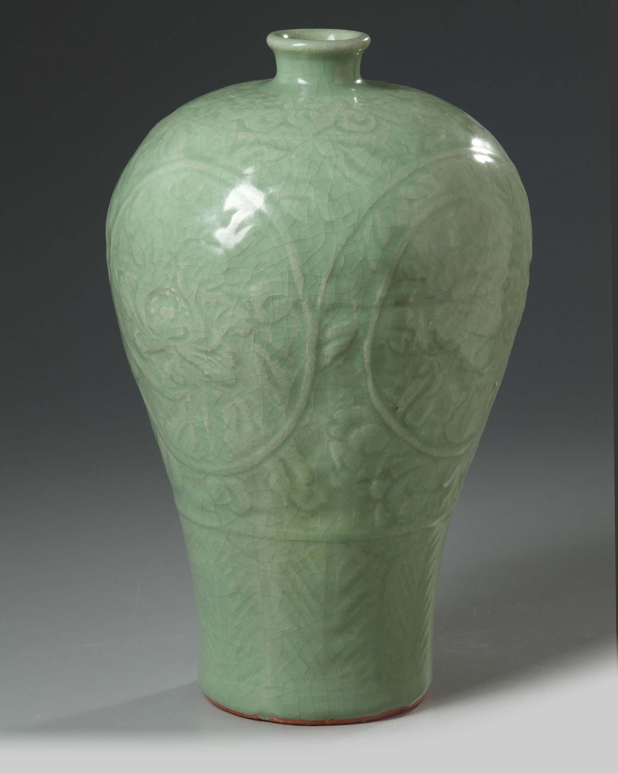 The meiping celadon vase is decorated in low relief with roundels around the body enclosing large lotus heads, a petal lappet border to the base and a band of ruyi heads to the shoulder.