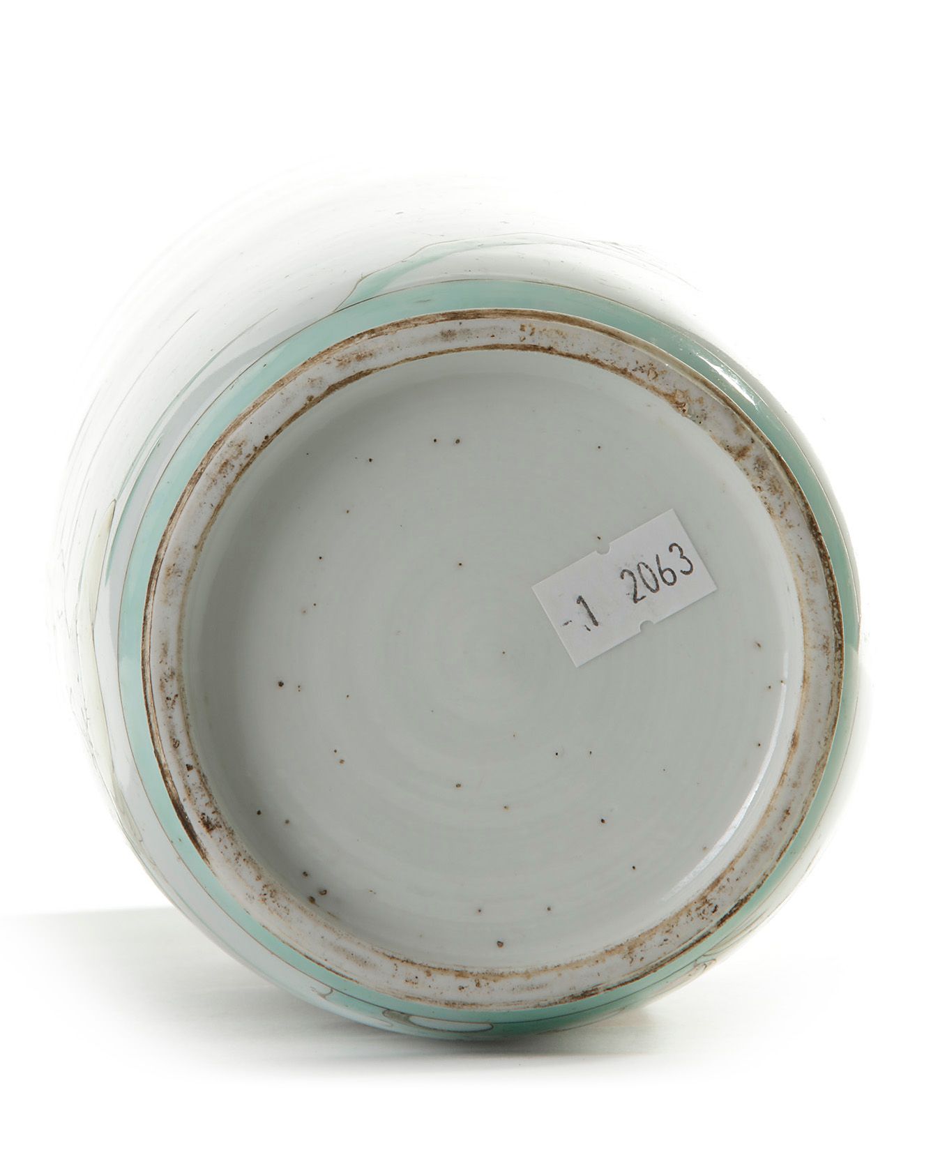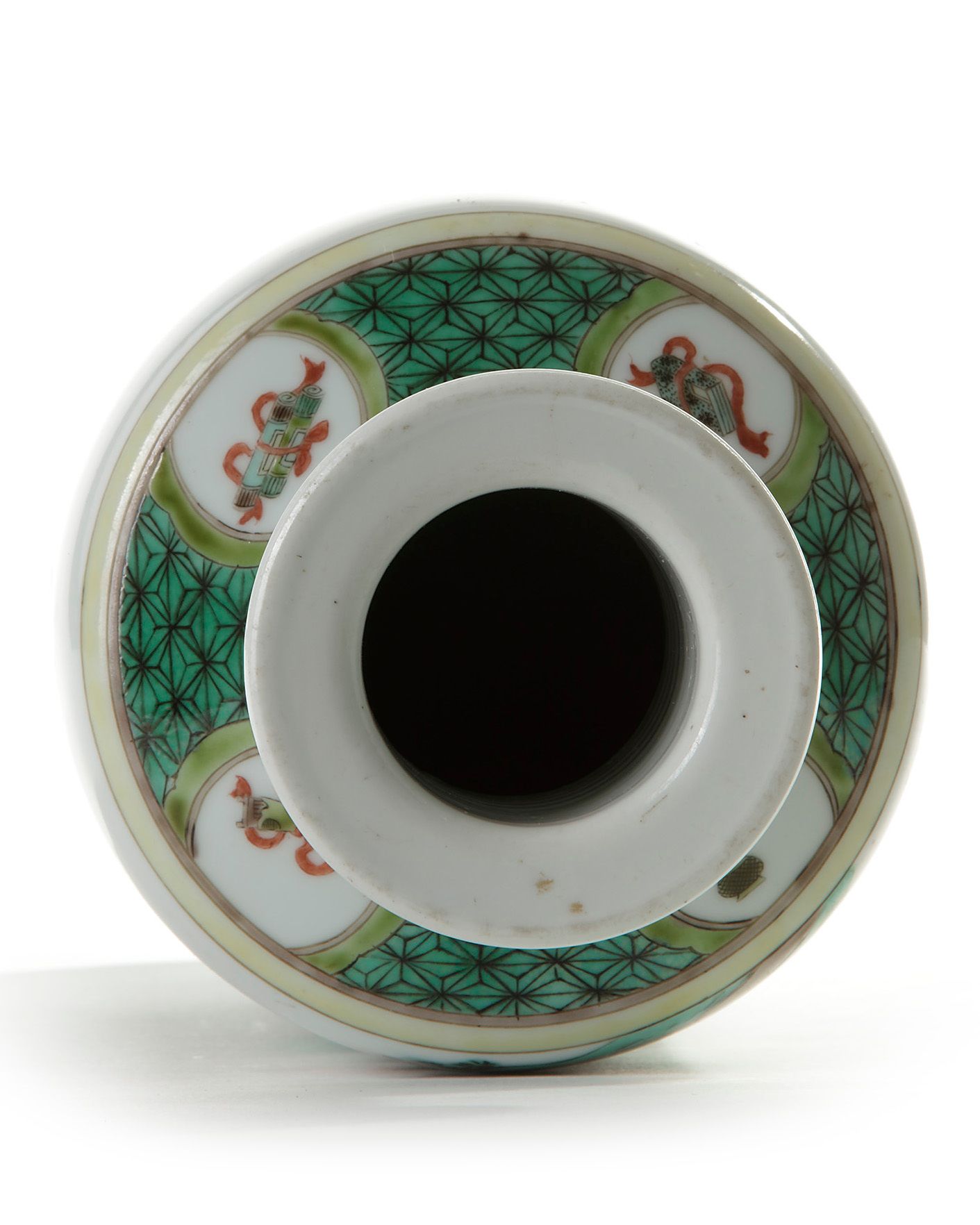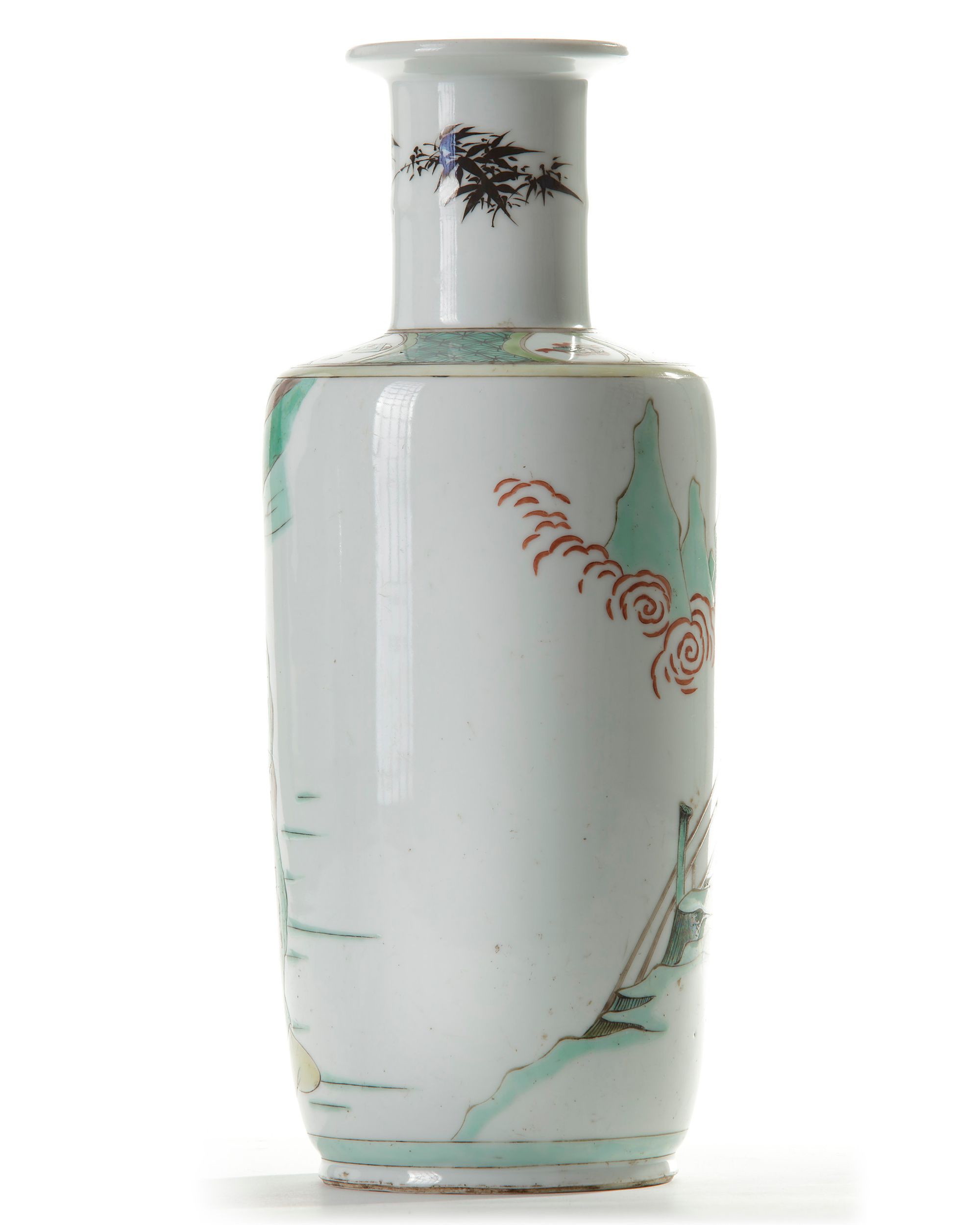 The vase is decorated with five scholars admiring a painting beside a flowering tree on a terrace in a mountainous landscape. The shoulder is decorated with a diaper band with cartouches enclosing precious objects.