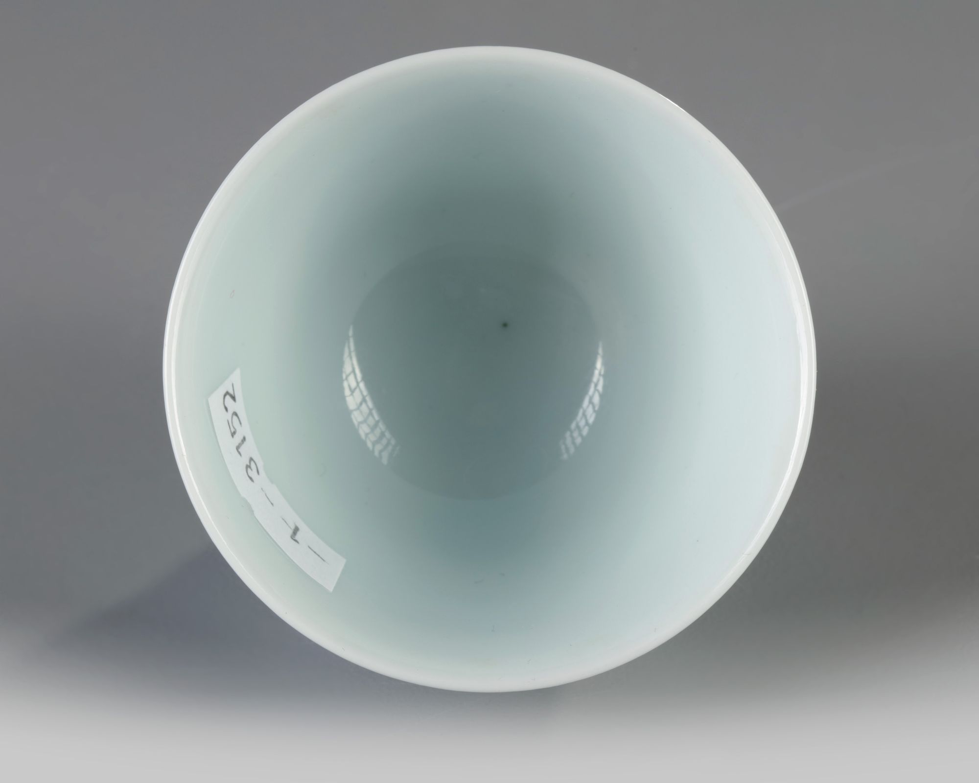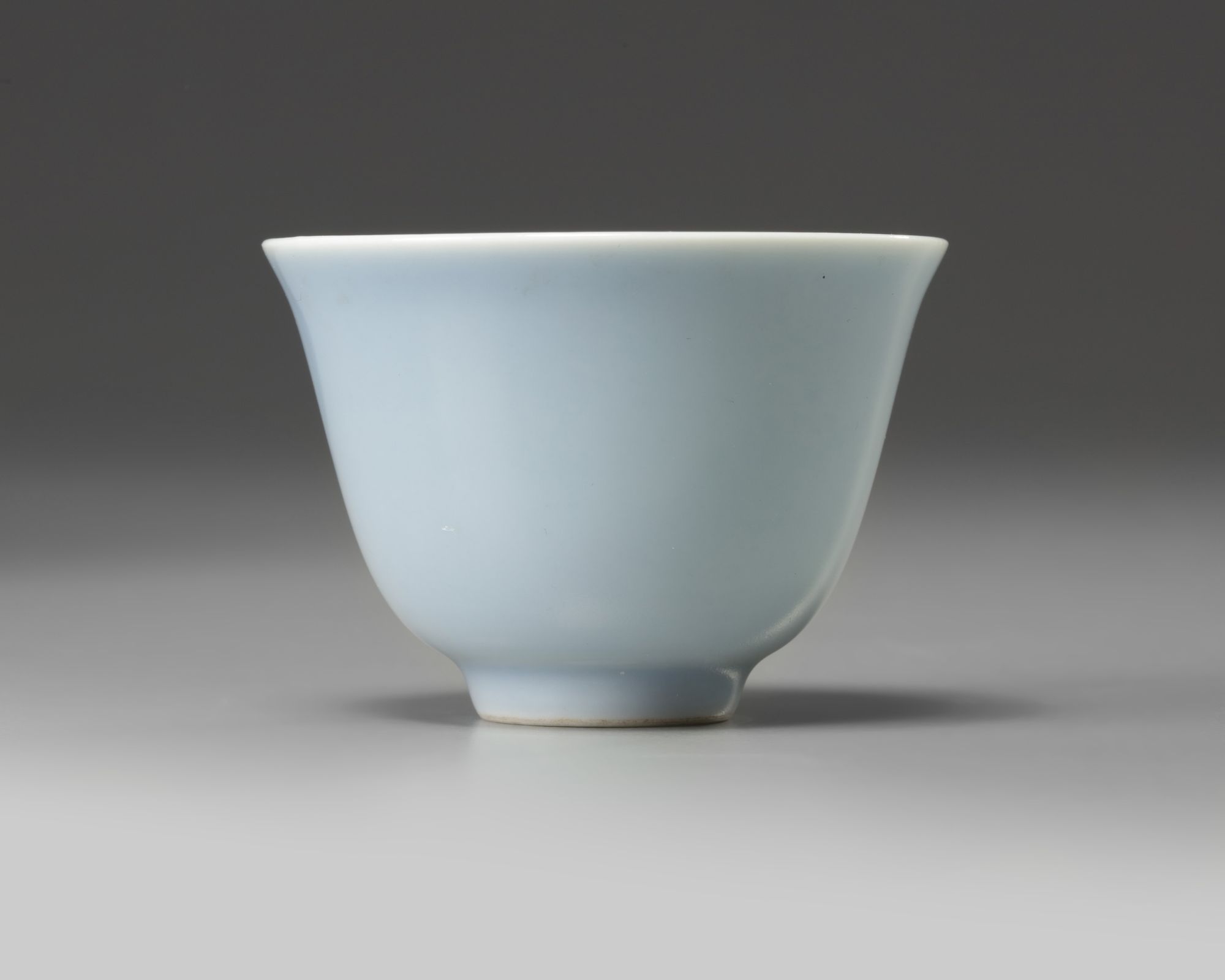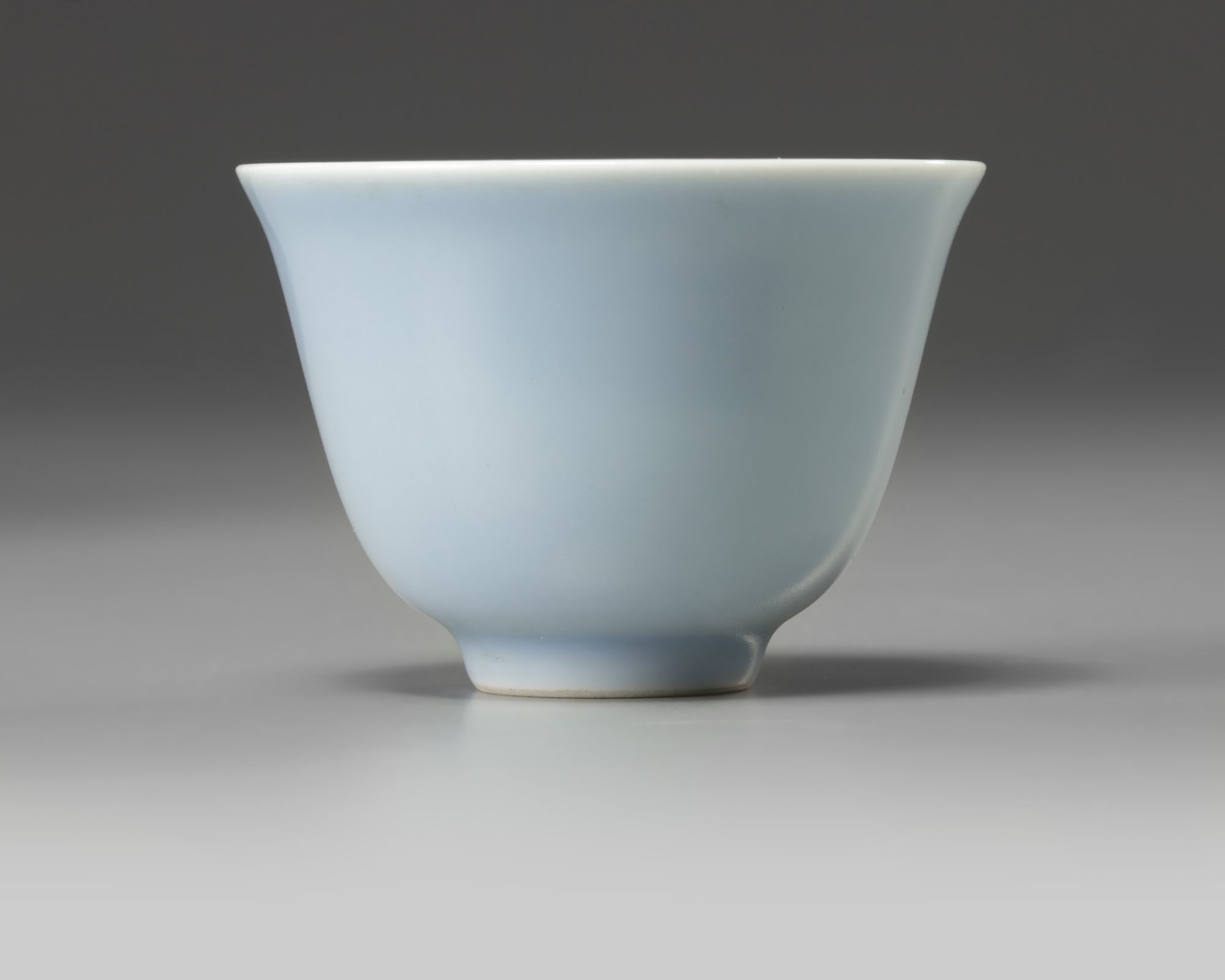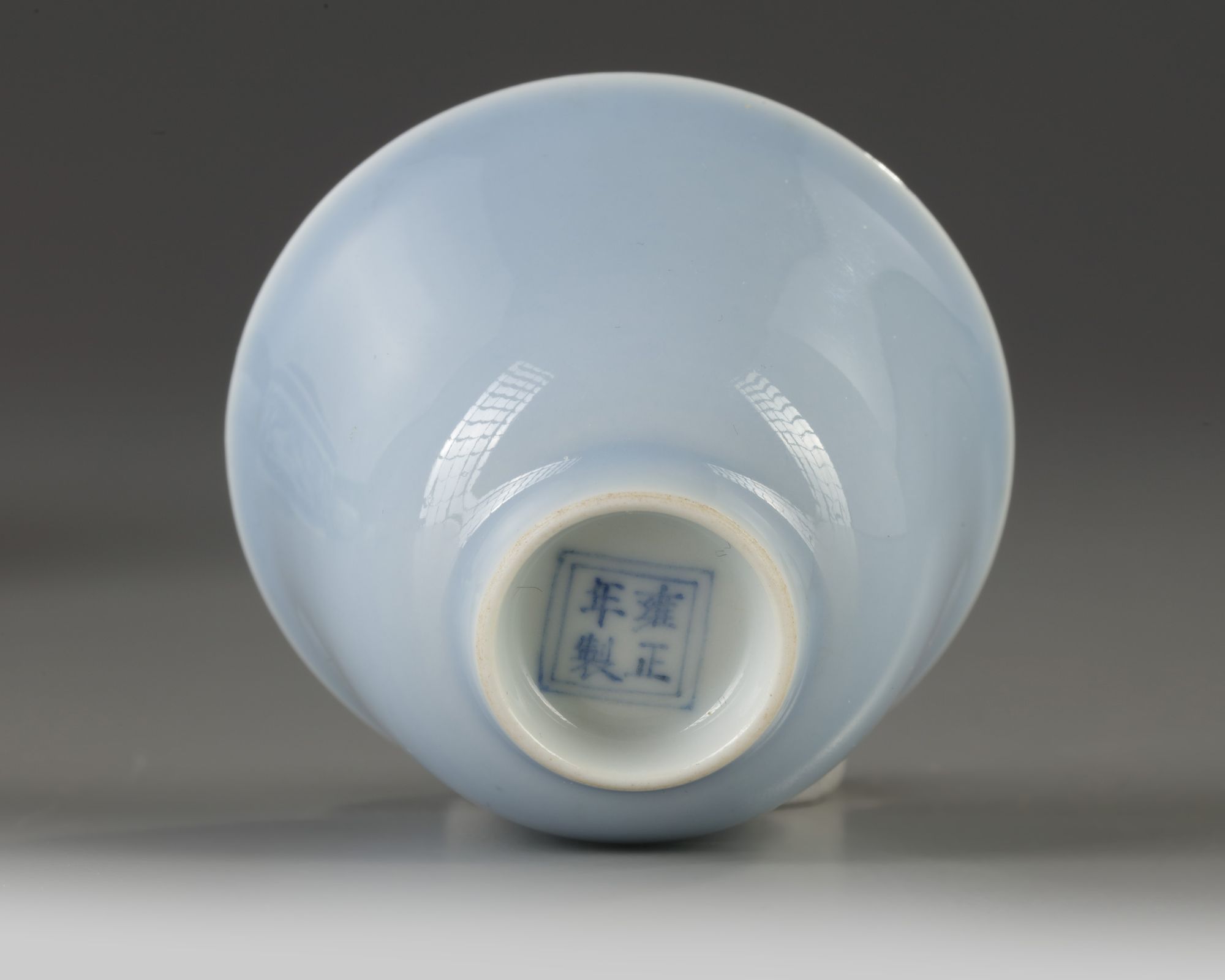 The small cup is delicately potted and covered to the exterior with a pale lavender-blue glaze. The interior and base are glazed white, with an apocryphal Yongzheng mark.