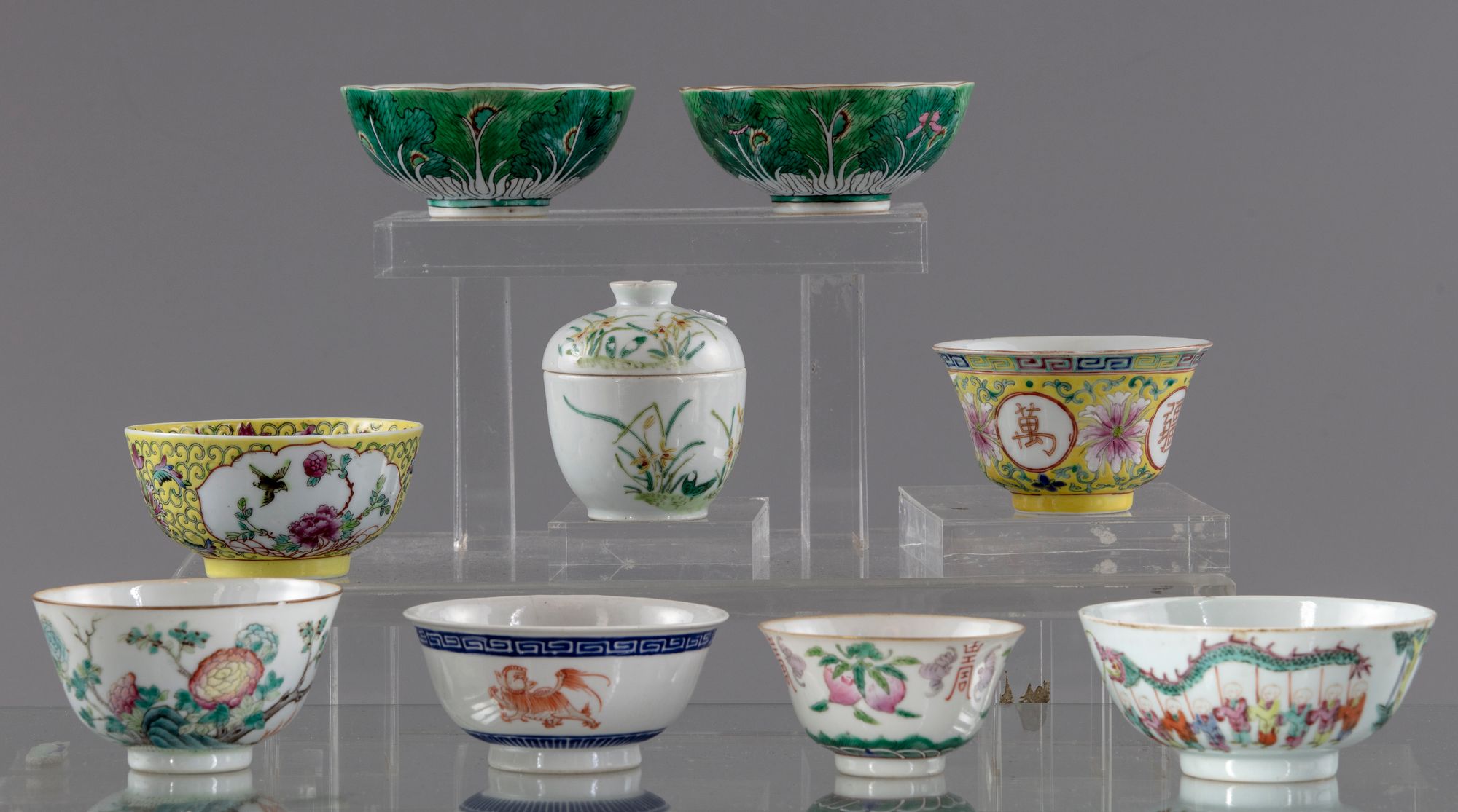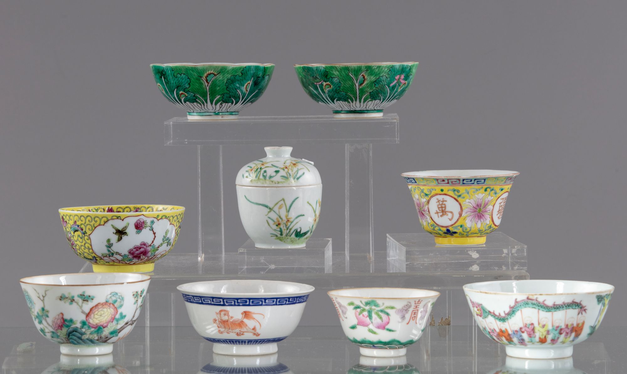 The ‘orchid and poem’ box and cover: 9 cm. high x 7.5 cm. diam. The ‘baicai’ bowls: 5 cm. high x 11.5 cm. diam. The ‘bat and peach’ bowl: 5 cm. high x 9.2 cm. diam. The ‘Buddhist lion’ bowl: 5.5 cm. high x 11.3 cm. diam. The ‘peony and double gourd’ bowl: 6 cm. high x 10.2 cm. diam.