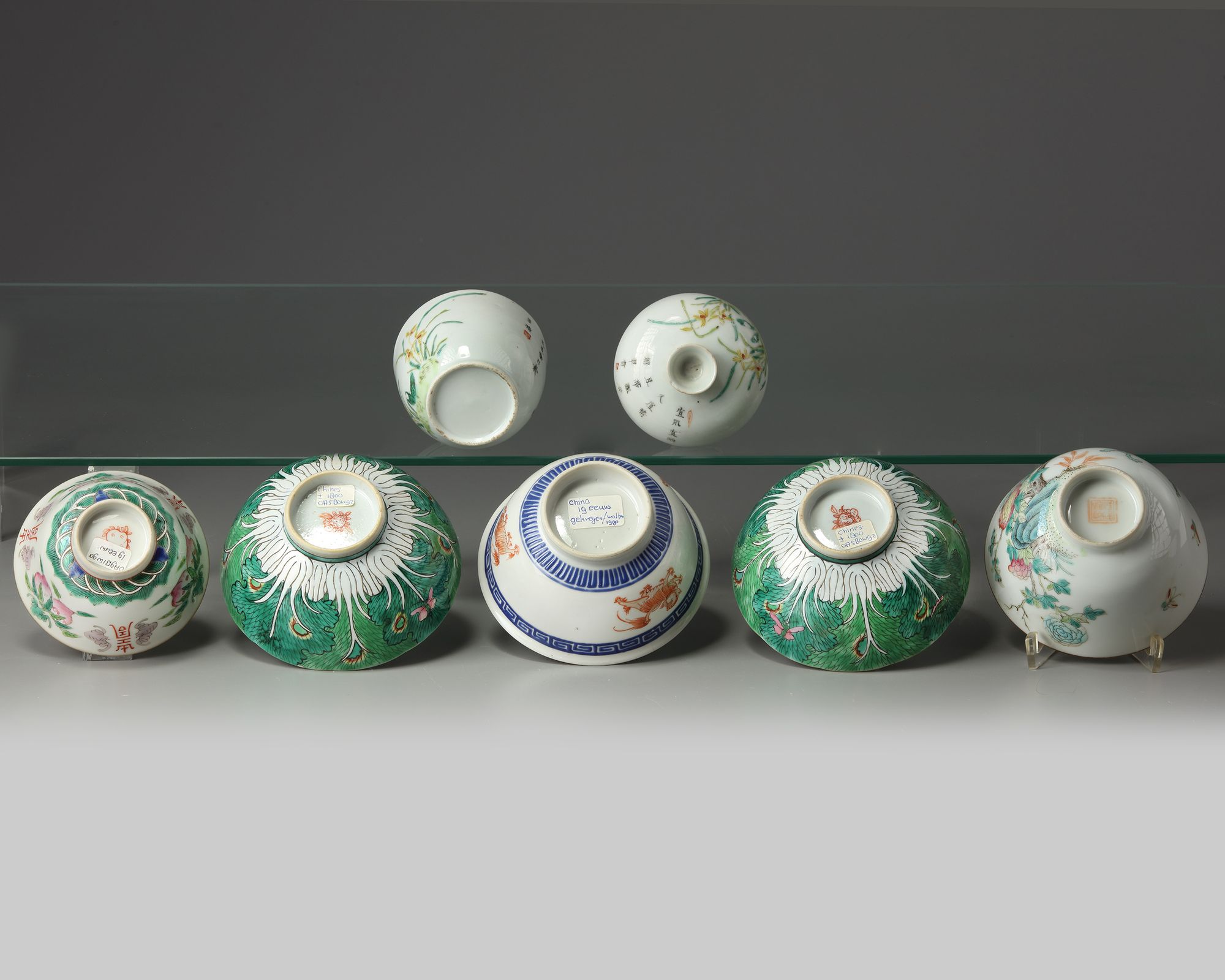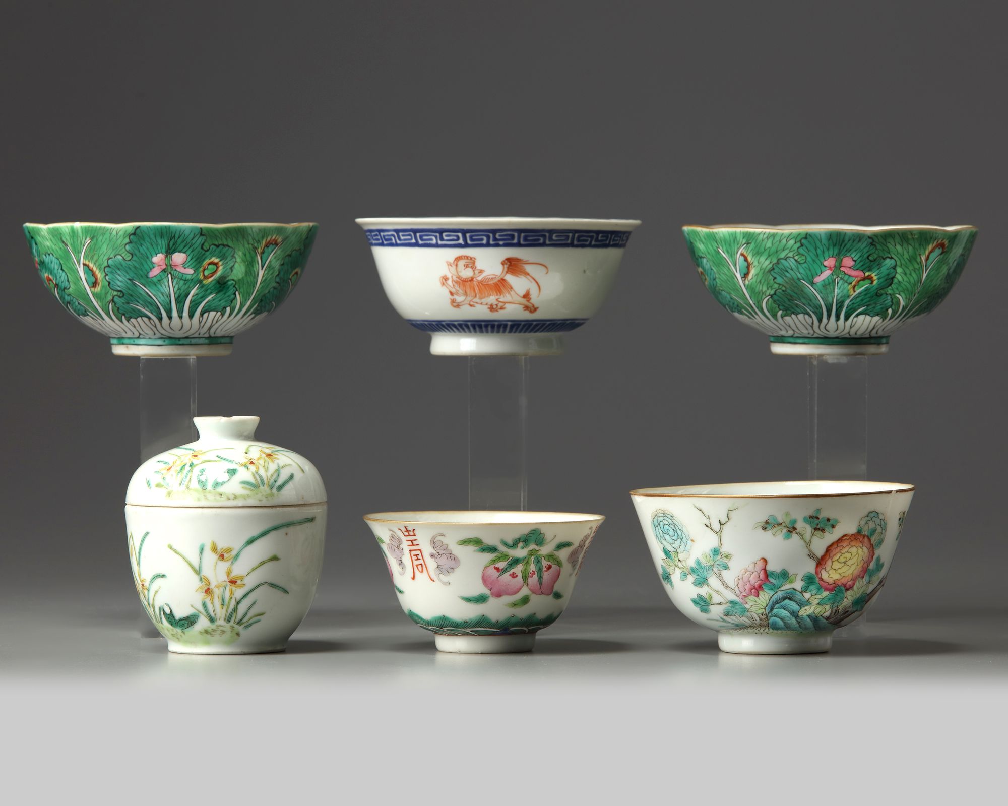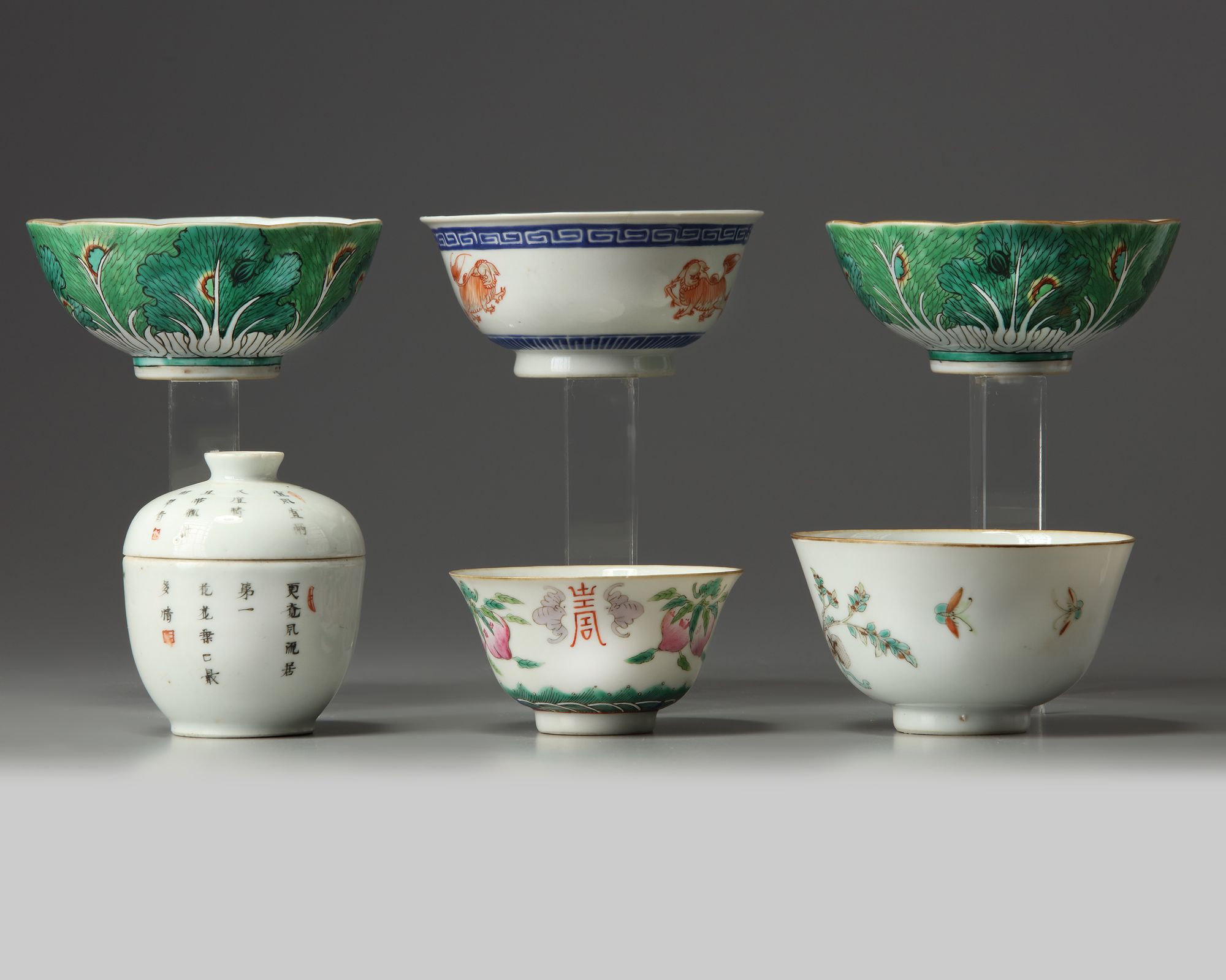 Comprising: a small box and cover decorated with orchids and inscribed with a poem; a pair of ‘baicai’ cabbage bowls, the bases marked with a bat and peach in iron-red; a bowl decorated with bats, peaches, and ‘shou’ characters, the base marked with a bat and peach in iron-red; a ‘Buddhist lion’ bowl decorated in iron red and gilt with blue enamelled keyfret bands; and a ‘peony and double gourd’ bowl, the base with a stamped apocryphal Qianlong mark.
