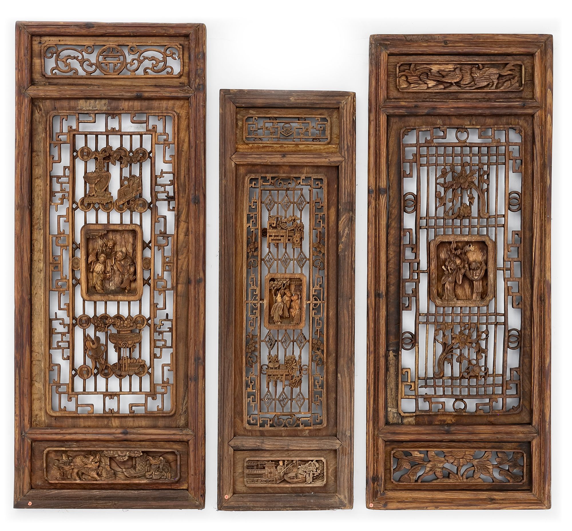 The first is carved with a central panel depicting two scholars and a warrior between openwork precious objects on a scrolling ground. The upper panel is decorated with a shou roundel and stylised kui dragons, the lower panel is decorated with a sampan approaching a qilin. The second is carved to the central panel with a scholar and lady between two flower sprays, all reserved on a geometric openwork ground, the upper panel is carved with a qilin and bird, the lower panel with flowers. The third is decorated with a central shaped panel enclosing a figural scene between auspicious objects on an openwork 'wan'-symbol ground. 109 by 39 cm.