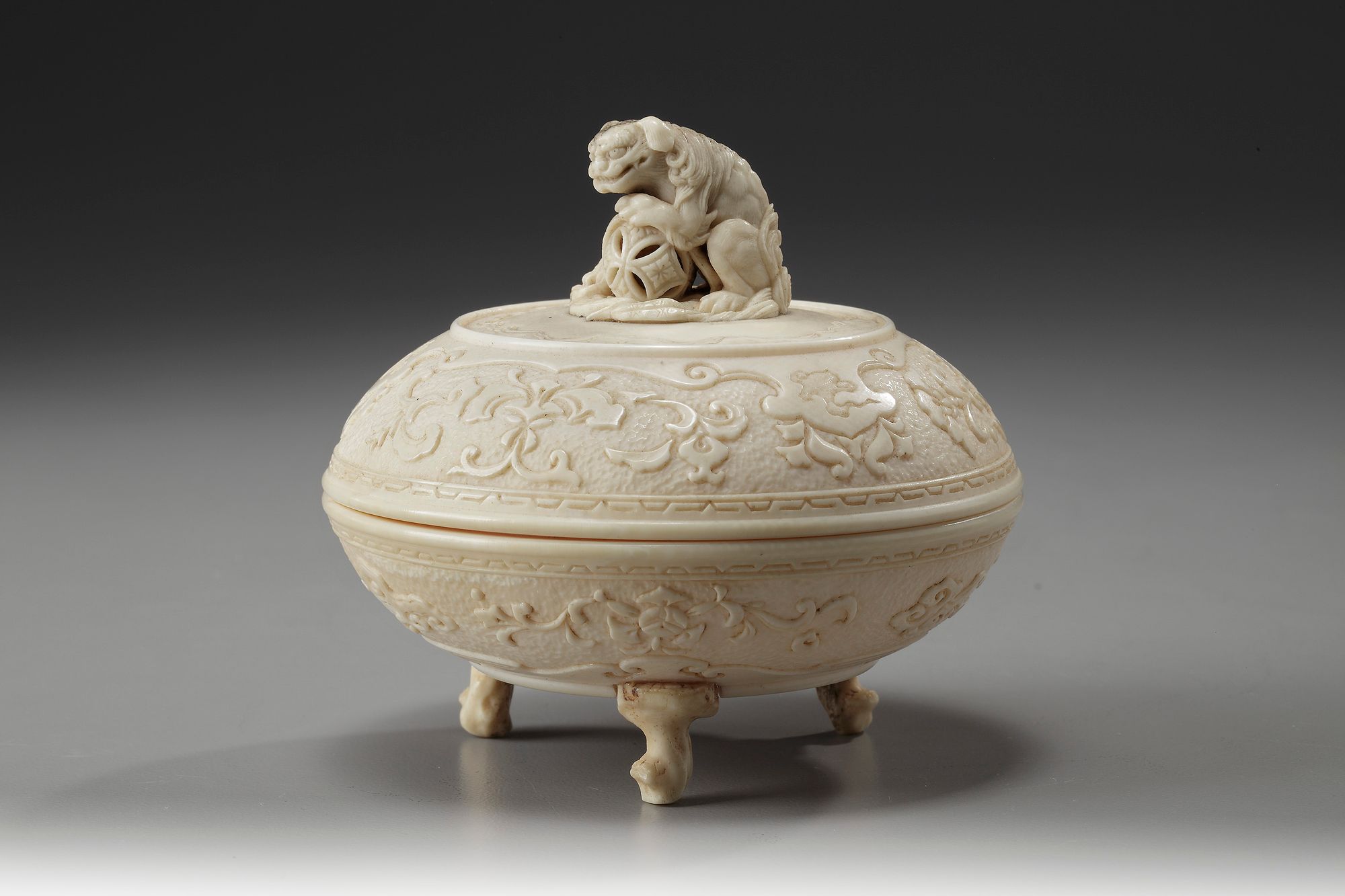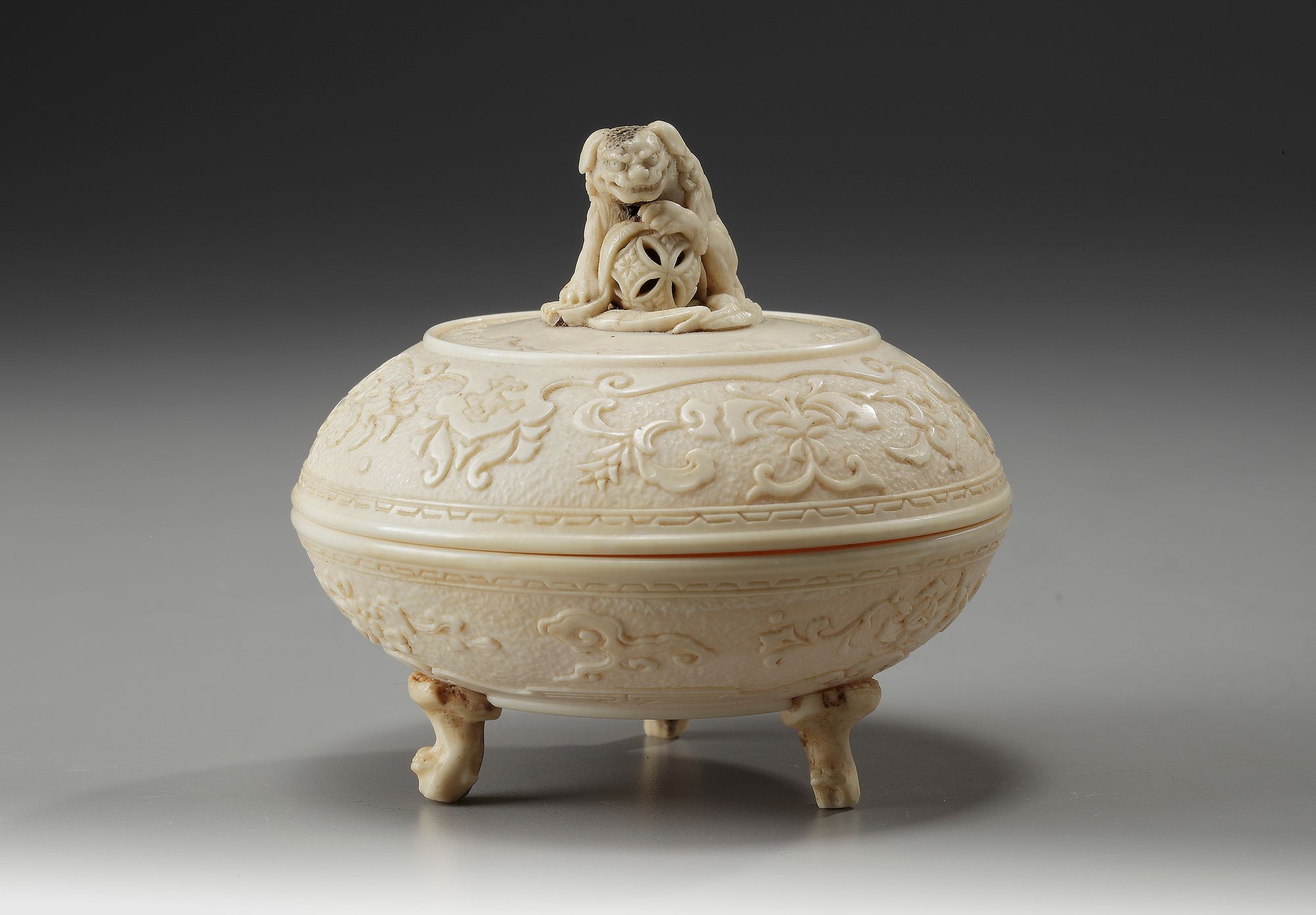 Of compressed globular form, the cover delicately carved in relief with floral designs and lappets with scrolling clouds, surmounted by a Fo dog shaped finial, the underside with floral designs and scrolling clouds on three lingzhi-shaped feet.