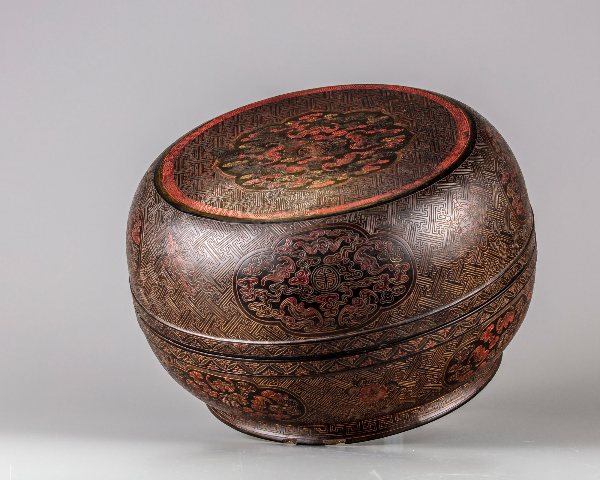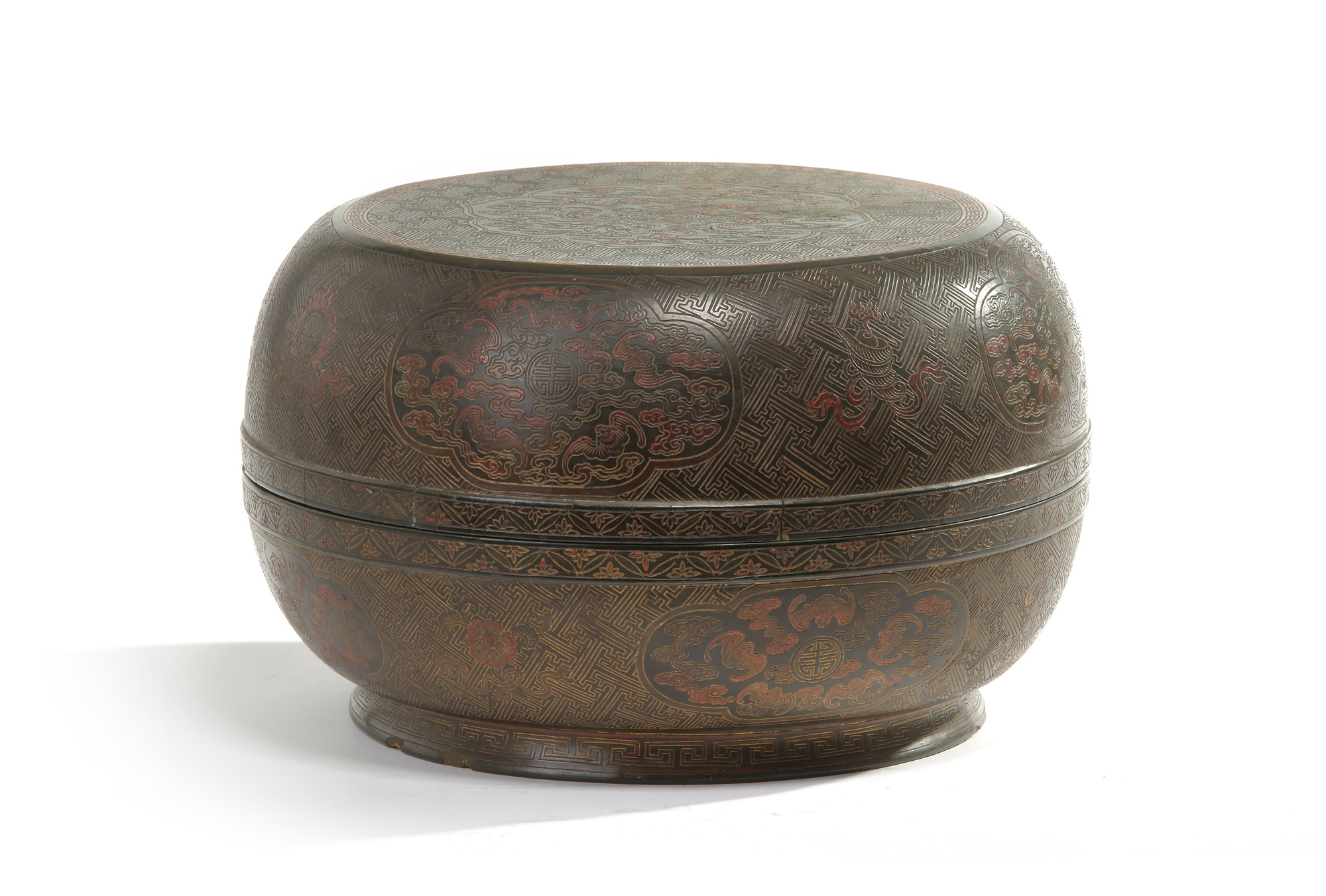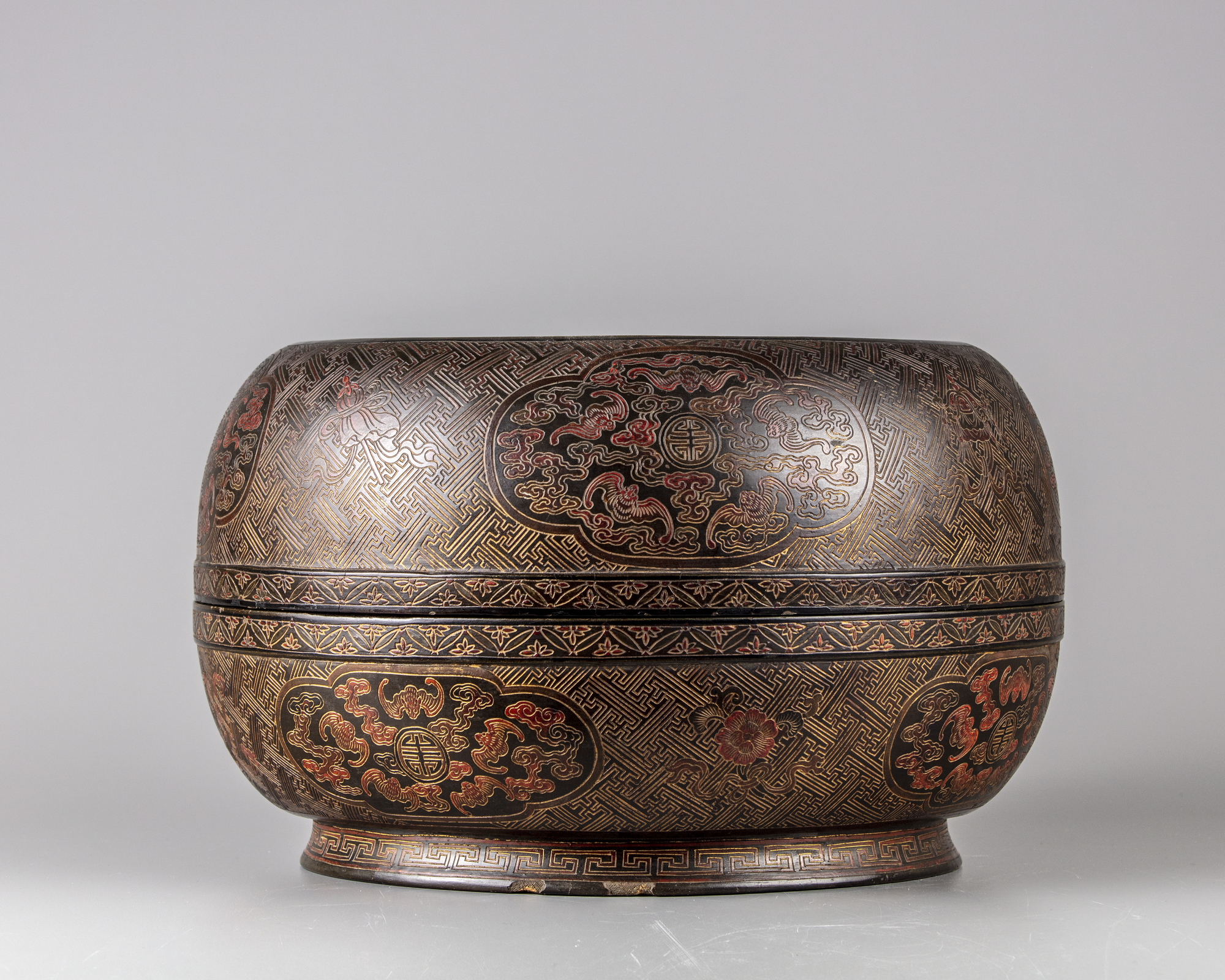 The lacquer box is incised with gilt and filled in with a central octafoil panel enclosing a 'shou' character roundel surrounded by five bats, wufu, amongst clouds. All set on a wan-design ground. The sides of the cover and base are decorated with further quatrefoil bat and 'shou' panels interspersed with flowers and Buddhist emblems. The interior is lacquered black and decorated with scattered gilt flowers and inscribed 'neiwu fu beiyong' (for the use of the inner court), and the base with a gilt Tongzhi six-character mark.