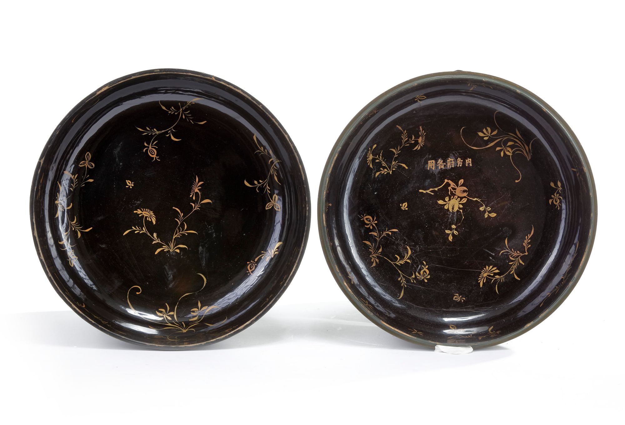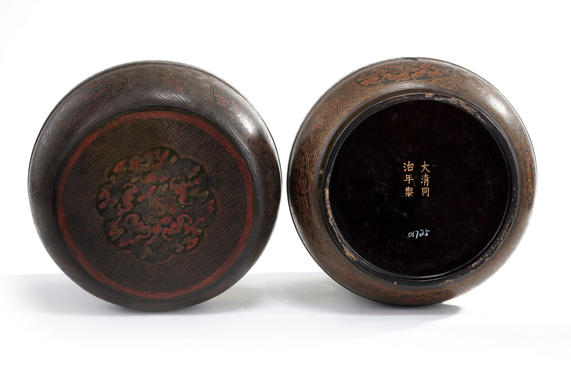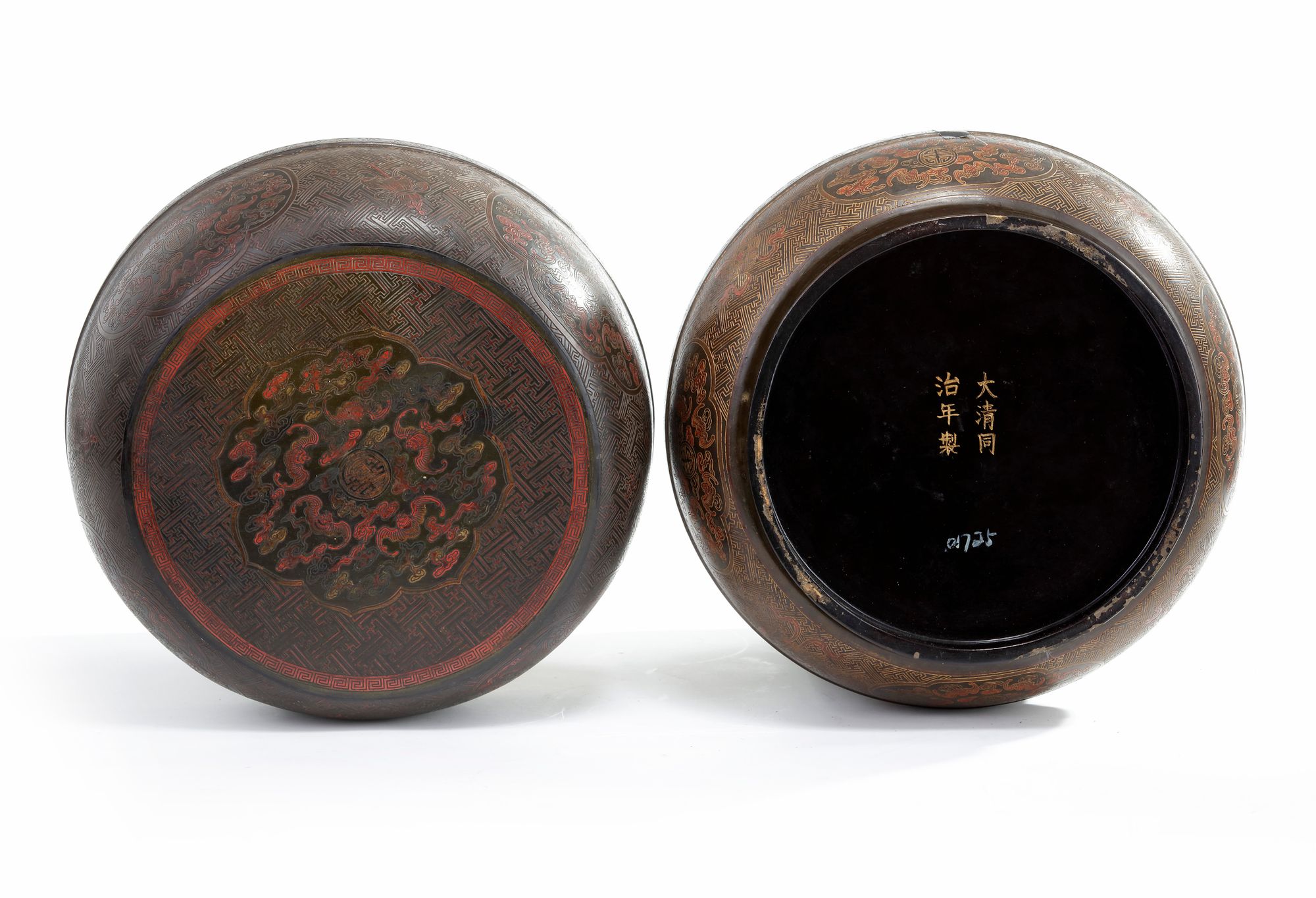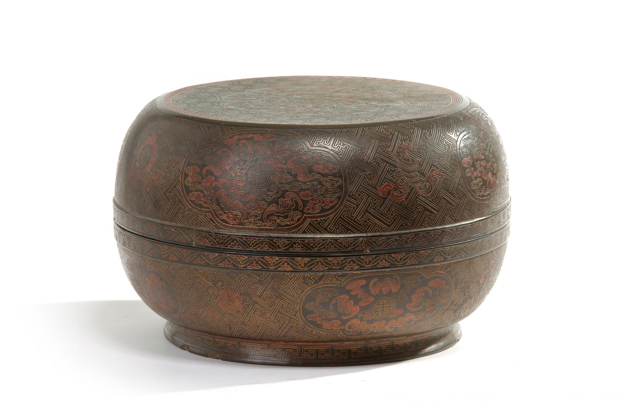 The lacquer box is incised with gilt and filled in with a central octafoil panel enclosing a 'shou' character roundel surrounded by five bats, wufu, amongst clouds. All set on a wan-design ground. The sides of the cover and base are decorated with further quatrefoil bat and 'shou' panels interspersed with flowers and Buddhist emblems. The interior is lacquered black and decorated with scattered gilt flowers and inscribed 'neiwu fu beiyong' (for the use of the inner court), and the base with a gilt Tongzhi six-character mark.