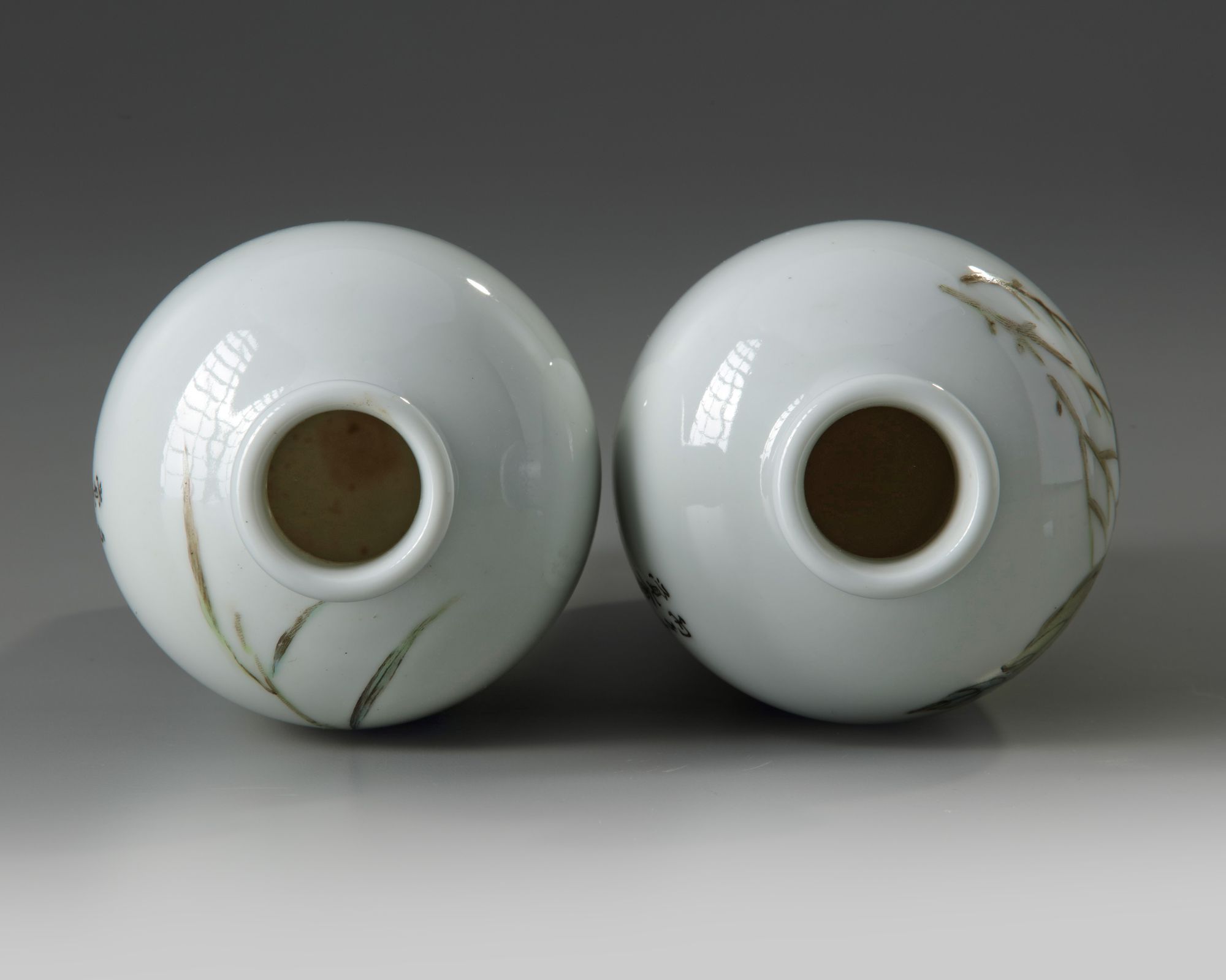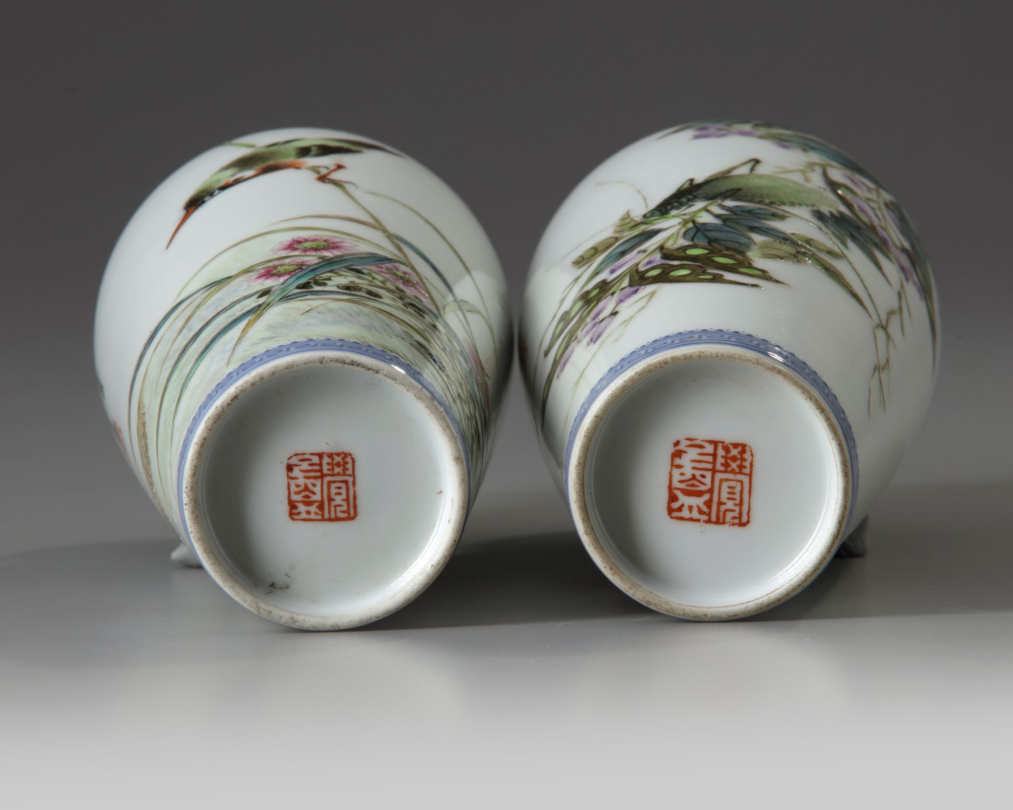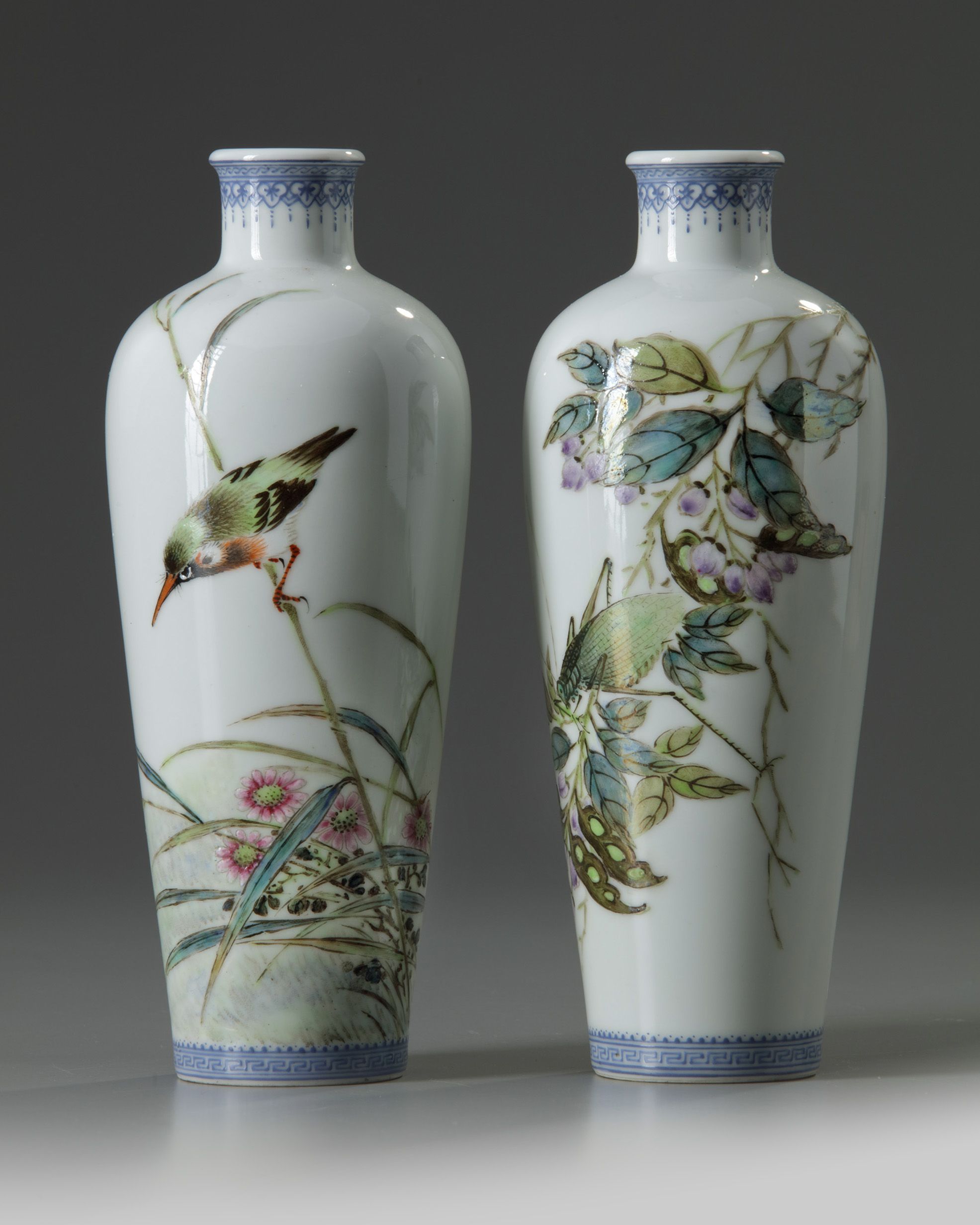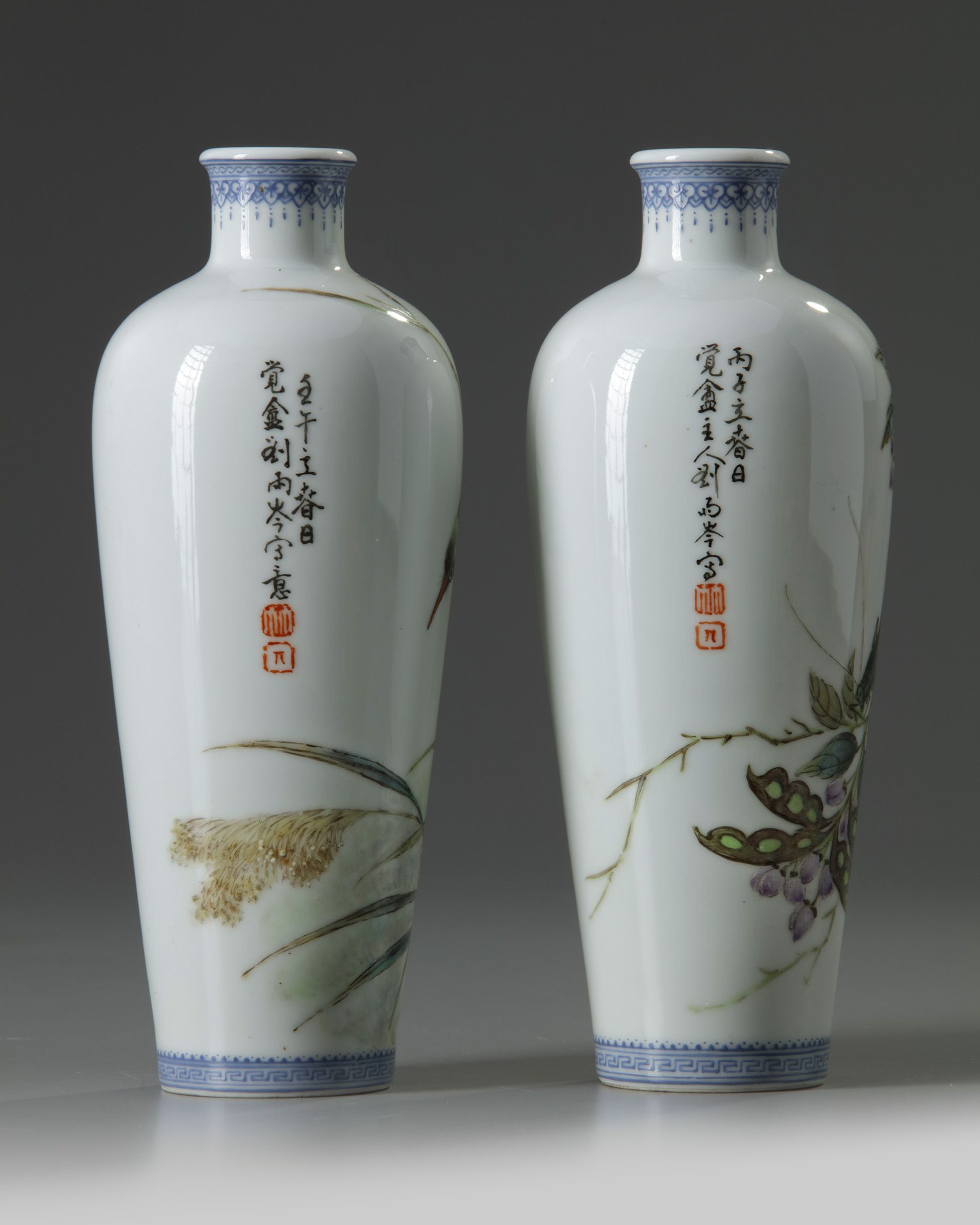 Both vases are modelled with high shoulders and a narrow high neck decorated with pendant blue-enamelled ruyi tassels. One vase is decorated with a kingfisher amongst water weeds and is dated renwu year, the other vase is decorated with a grasshopper perched on a wisteria branch, and dated bingzi year. Both vases with signature of Liu Yucen, and bases with iron red 'Jue an'.