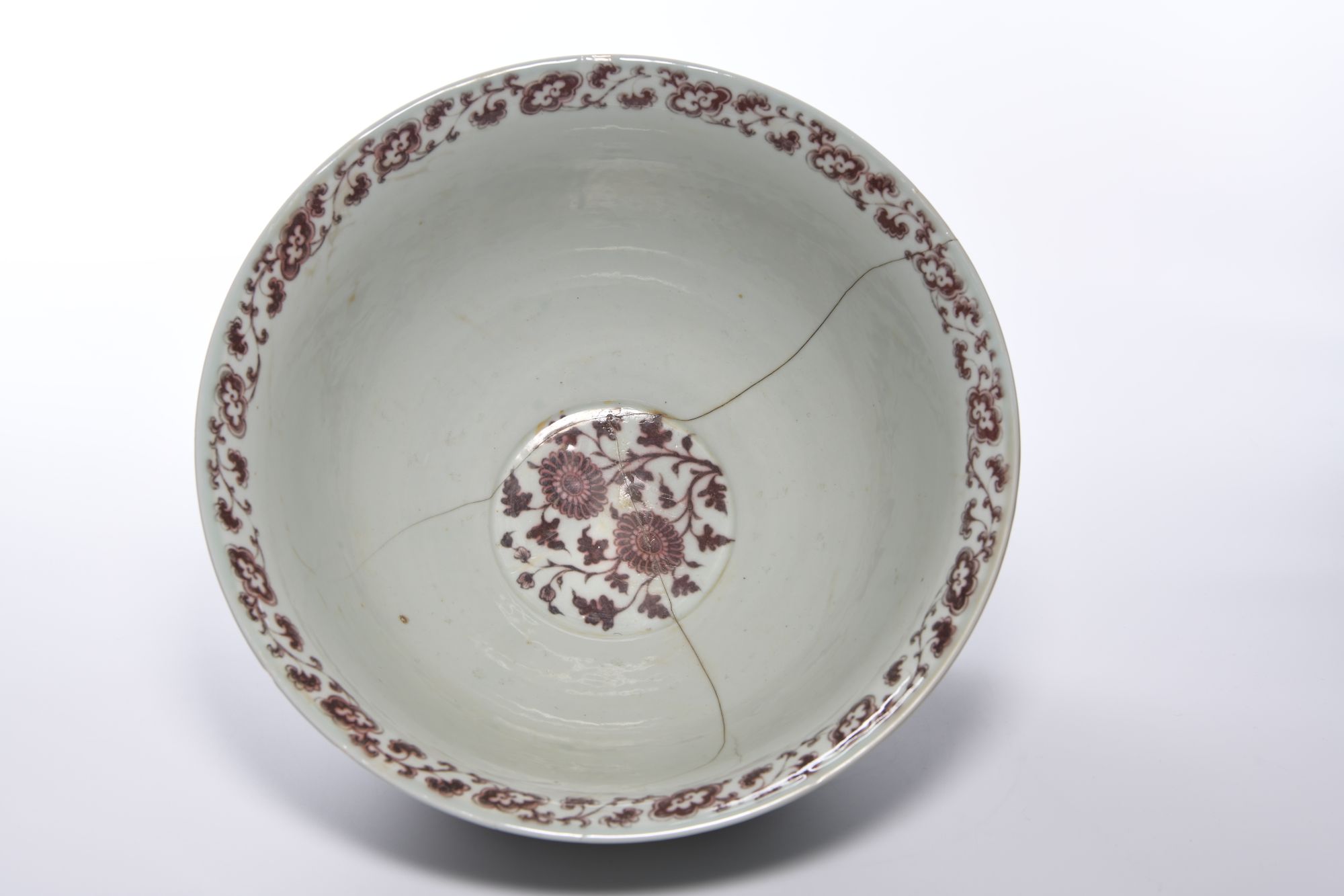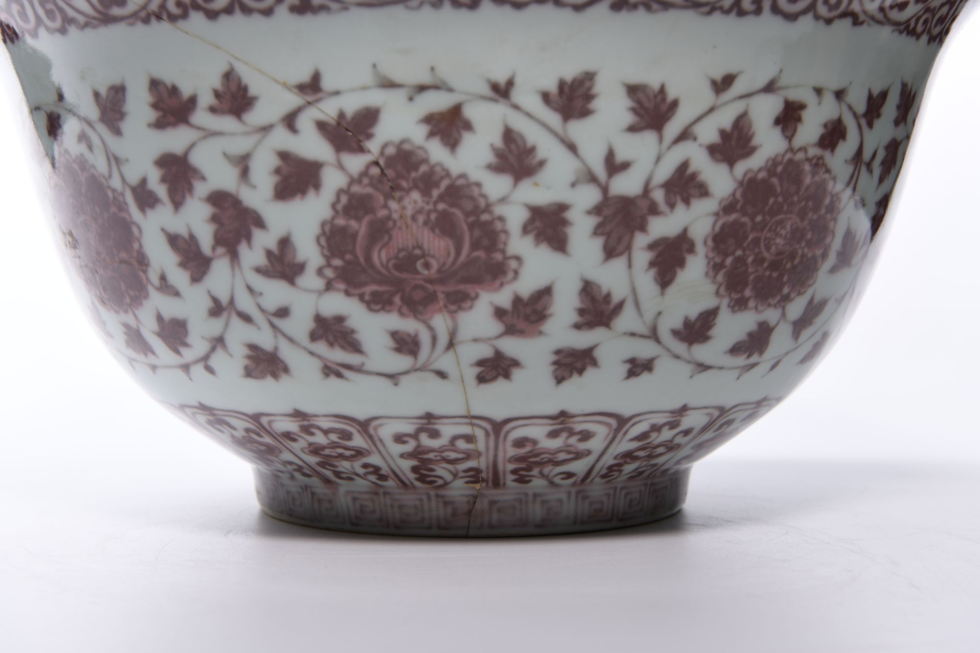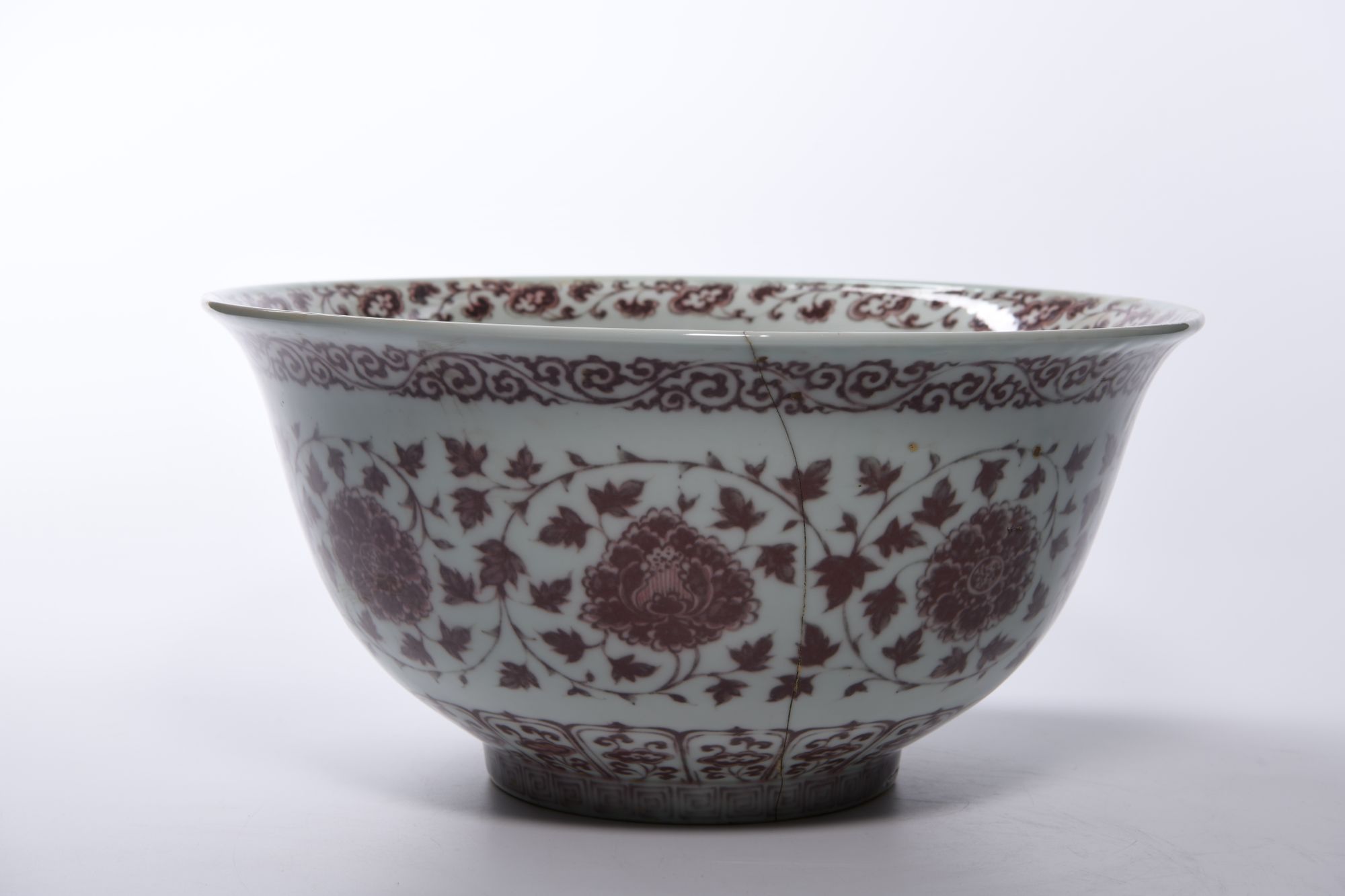 A large Chinese bowl with an everted rim and smll foot ring, boldly painted in a deep mushroom-pink tone with an undulating scroll bearing peony blossoms alternating in profile and full-faced amidst broad pointed leaves, all between upright petal lappets and a key fret chain around the foot and a classic flower band to the rim. H.34 by W 47.cm