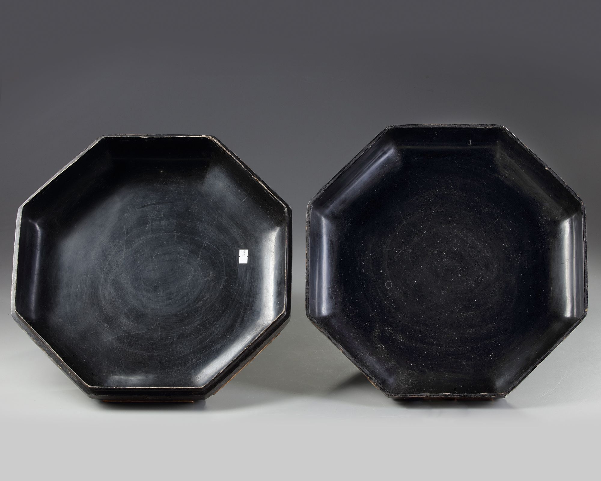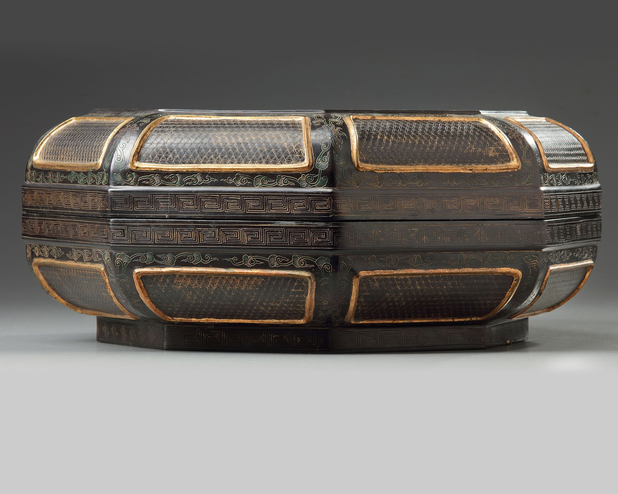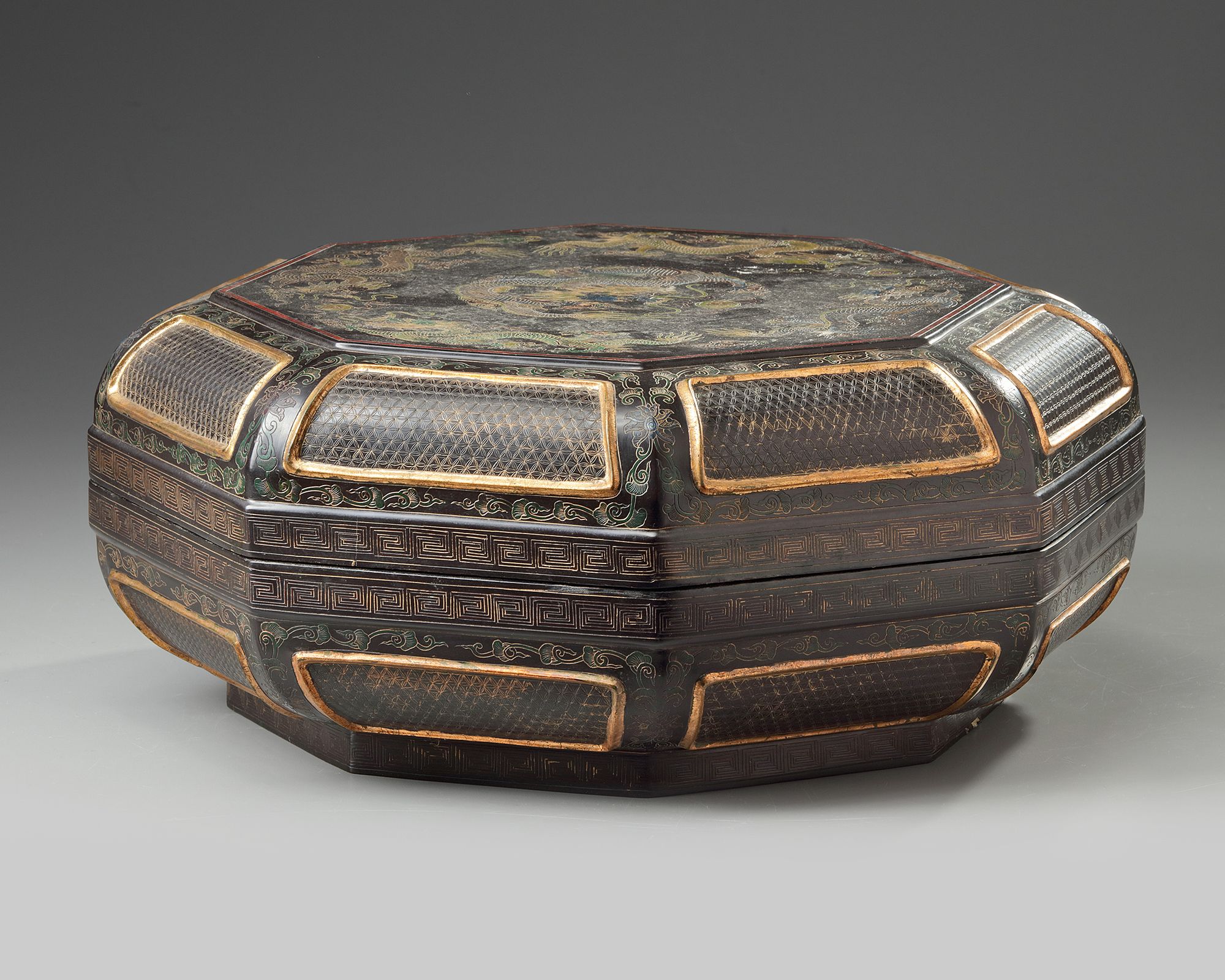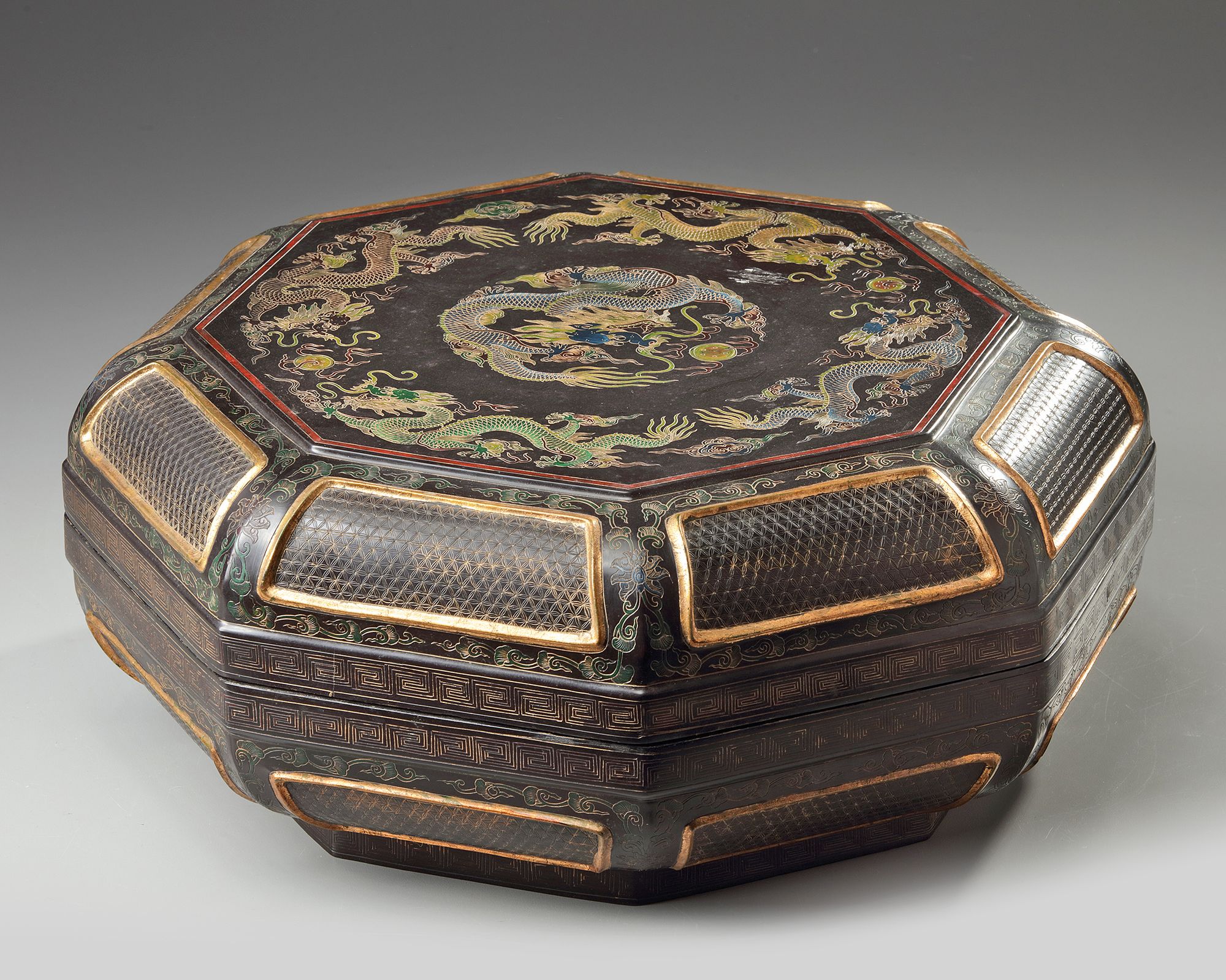 The cover is decorated with a dragon roundel chasing the flaming pearl surrounded by four further dragons. The sides are decorated with panels enclosing a trellis pattern surrounded by scrolling lotus. The box base is similarly decorated. The black lacquer is decorated with polychrome highlights and gilt. The base with an apocryphal Qianlong mark.