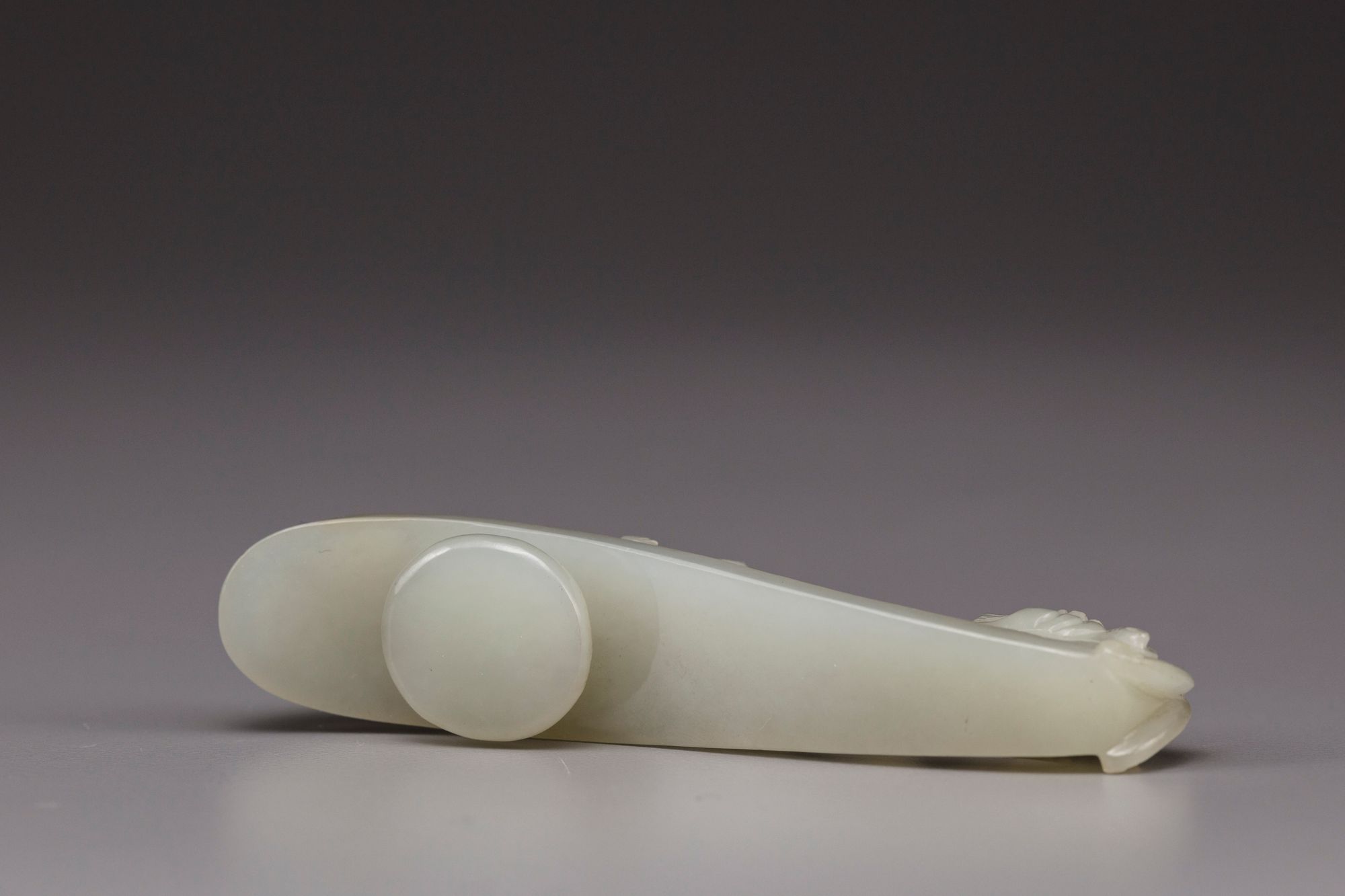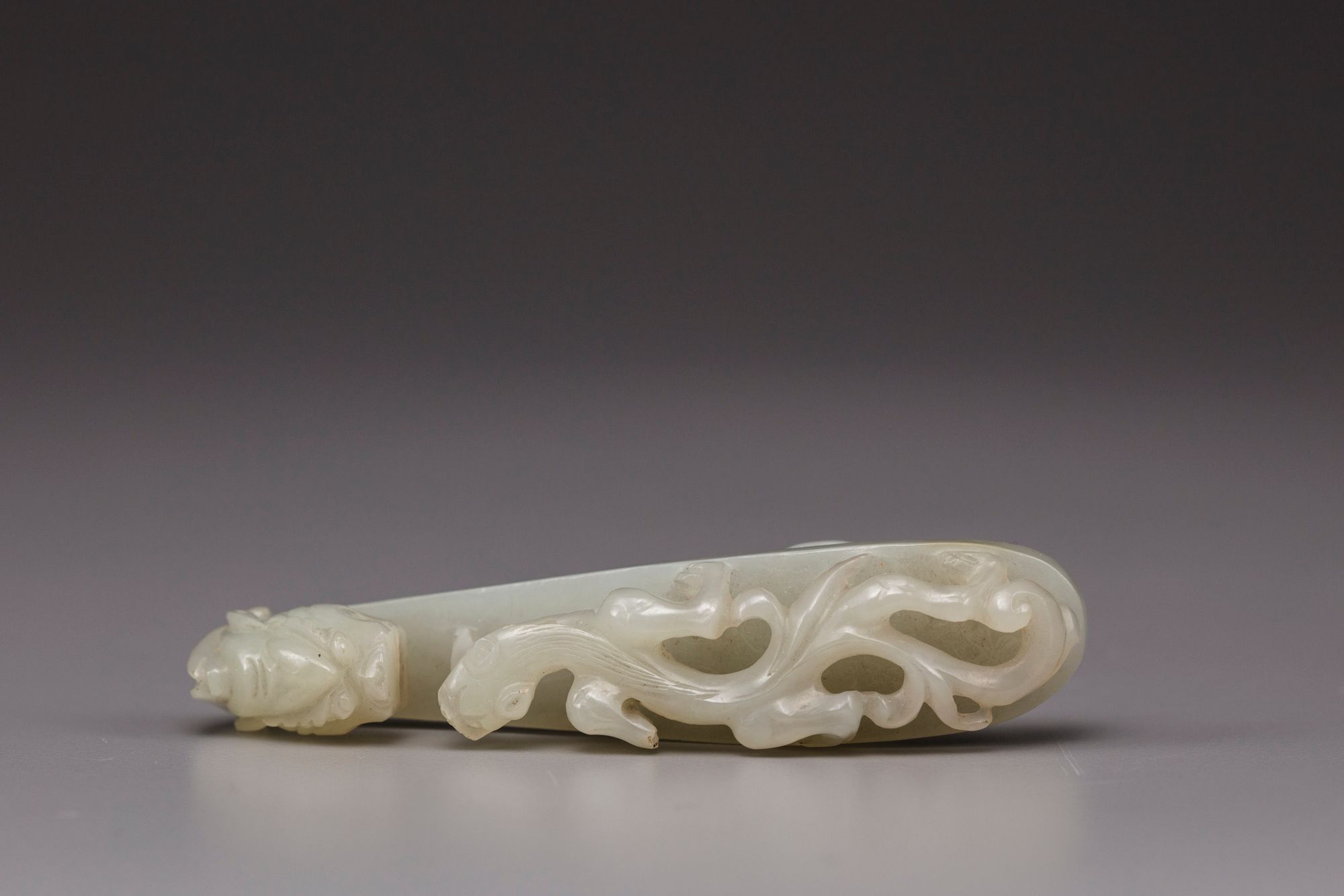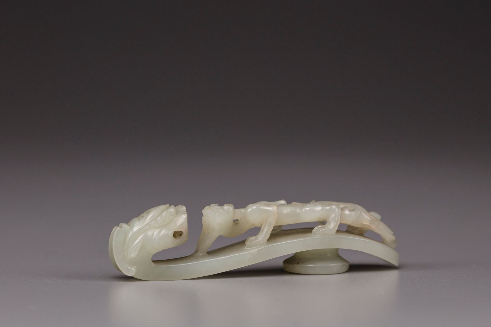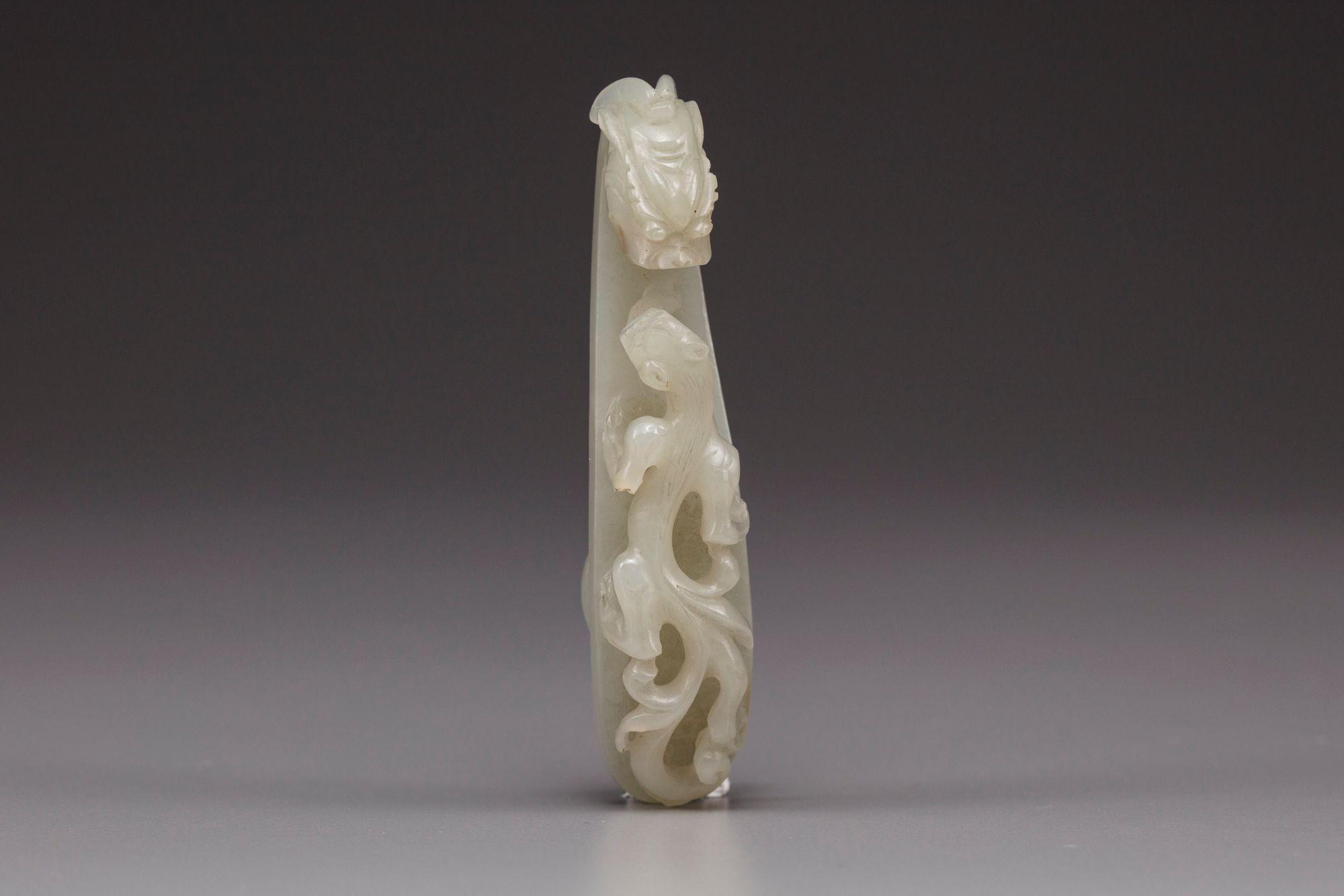 The shaft is carved with an openwork chilong clambering towards the dragon-head terminal. The stone is of an even pale tone.