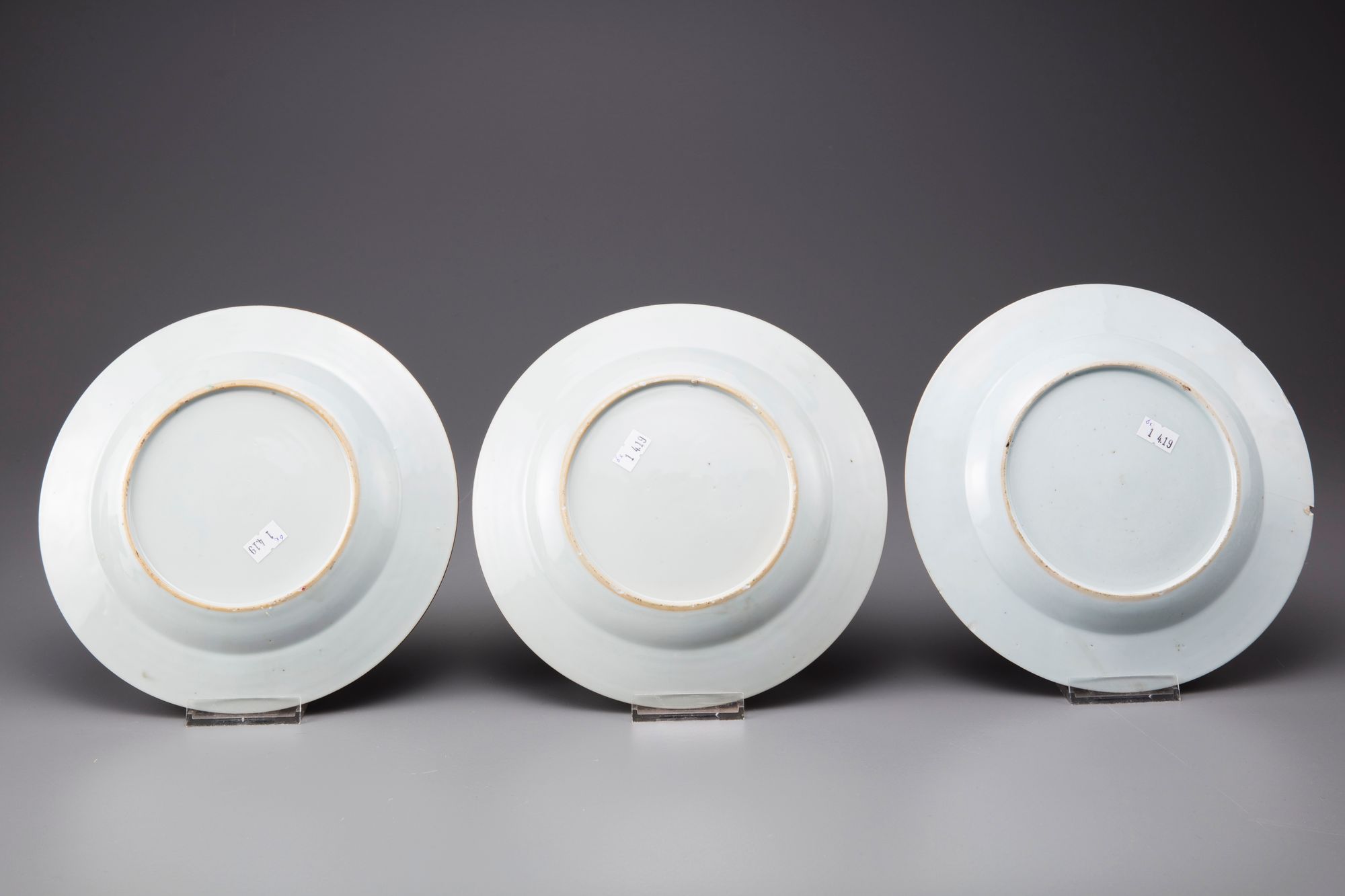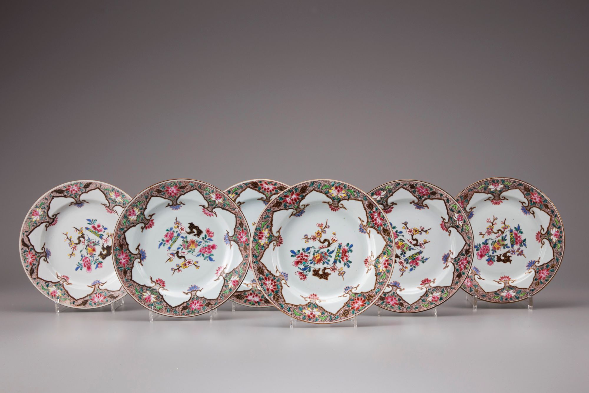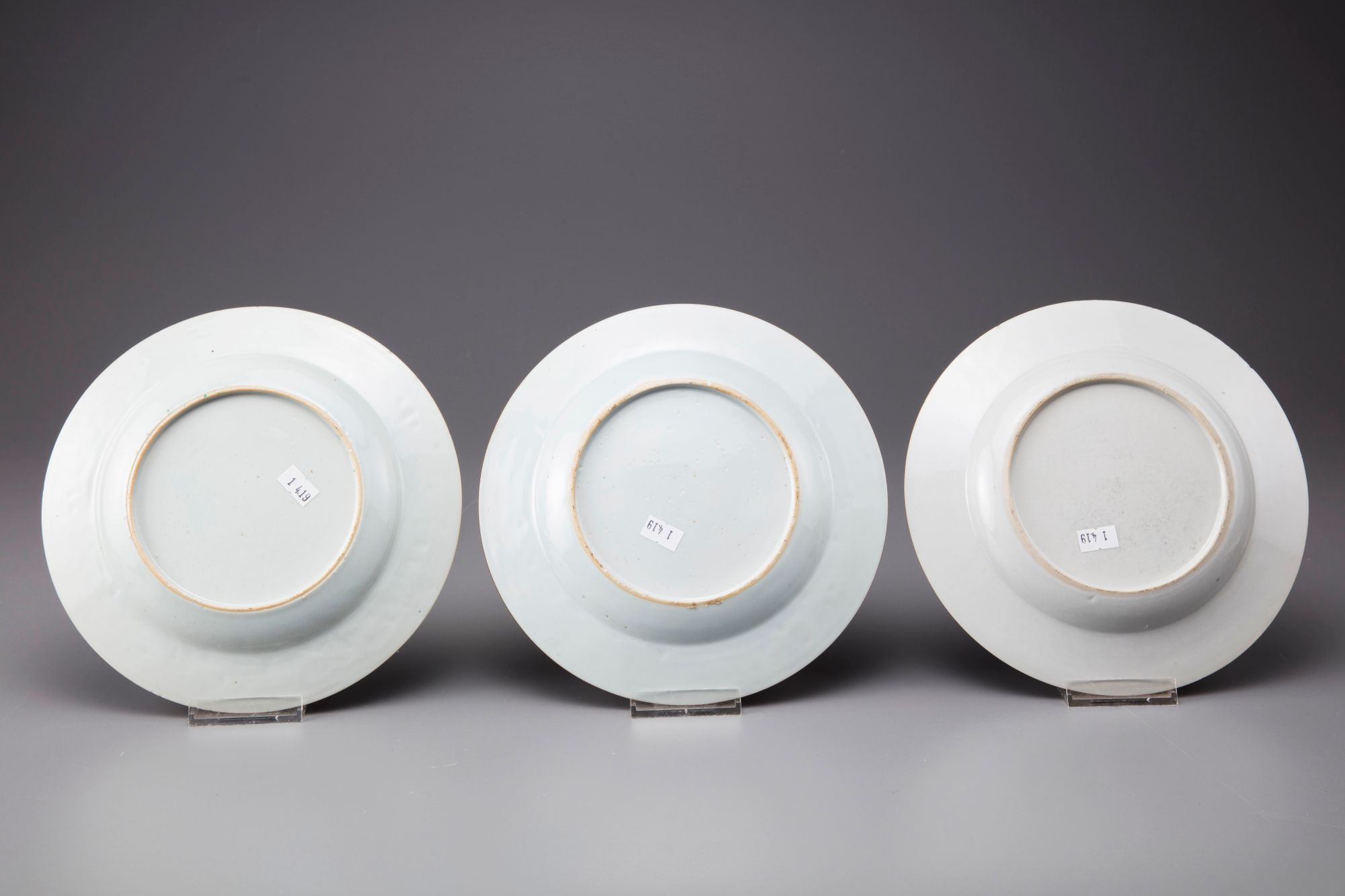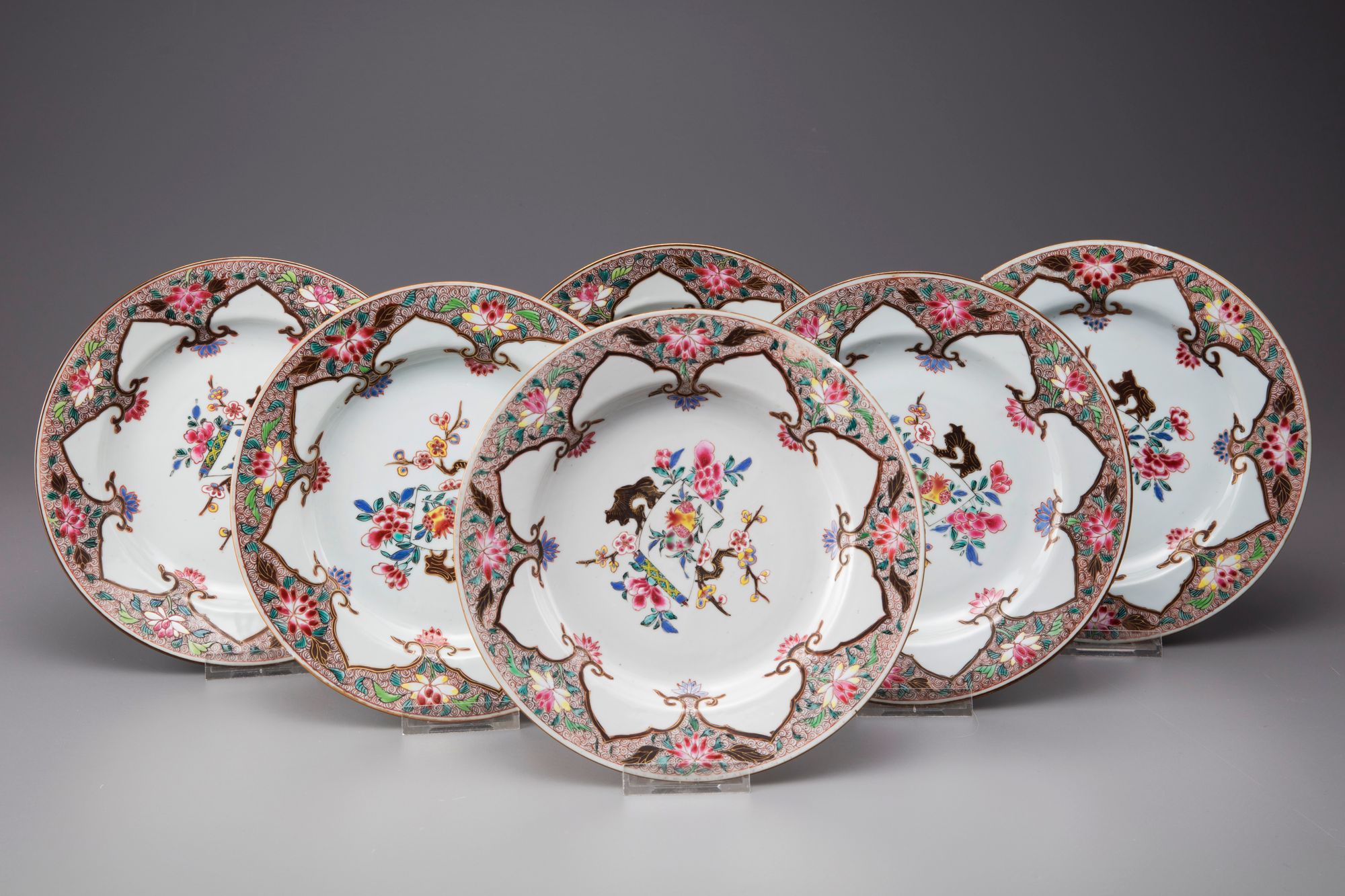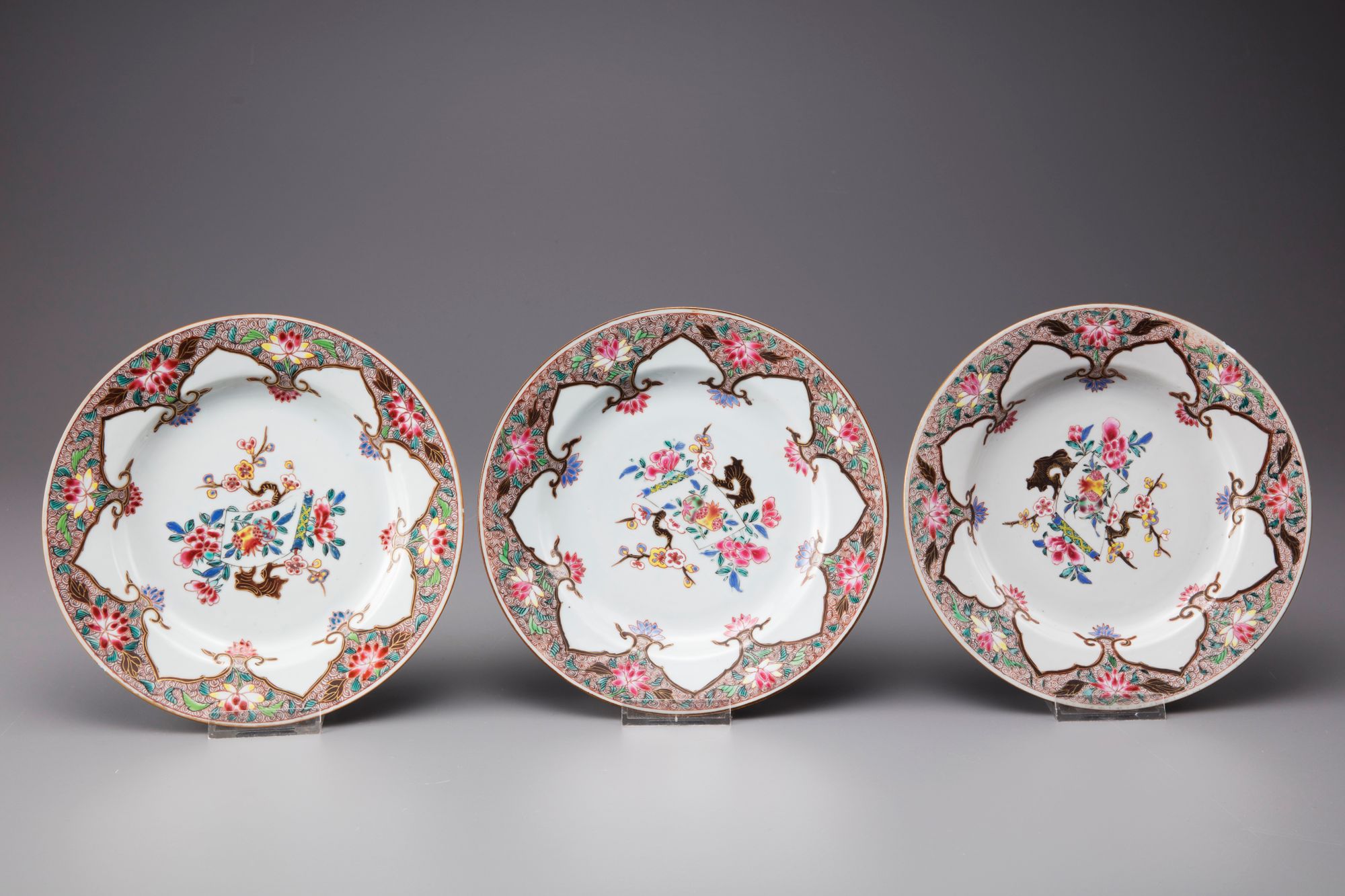 Each plate is decorated with a scroll depicting pomegranates before peonies and prunus, surrounded by a pomegranate-shaped patterned border with lotus on a whorl ground.