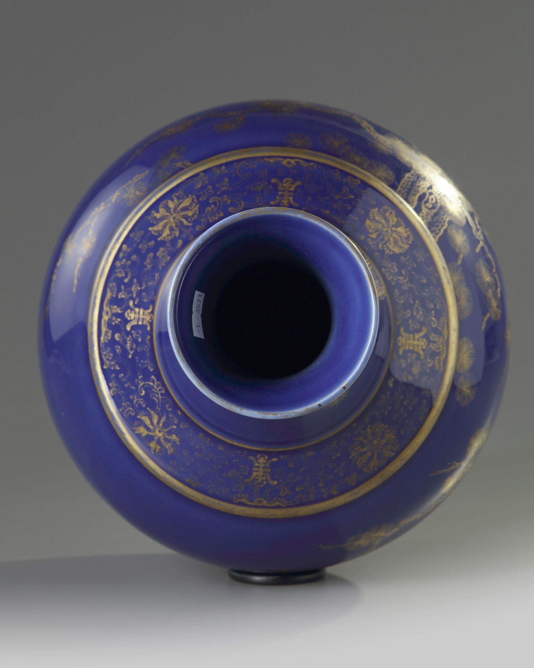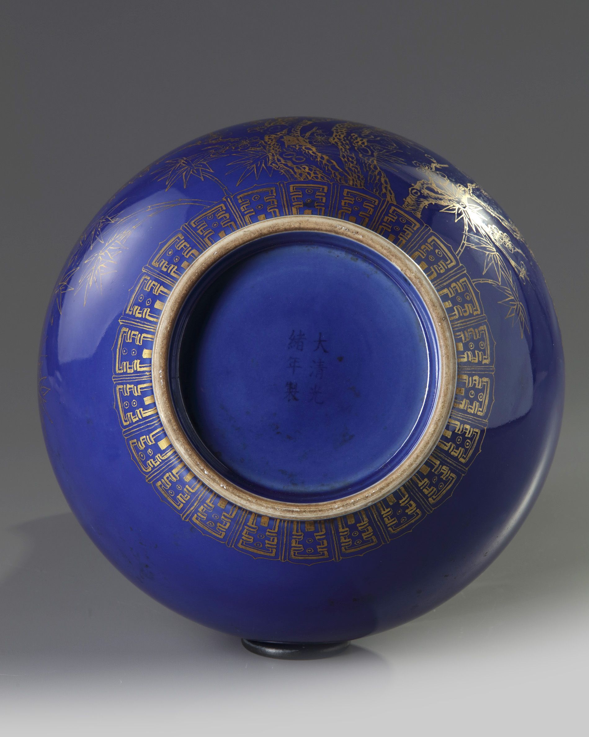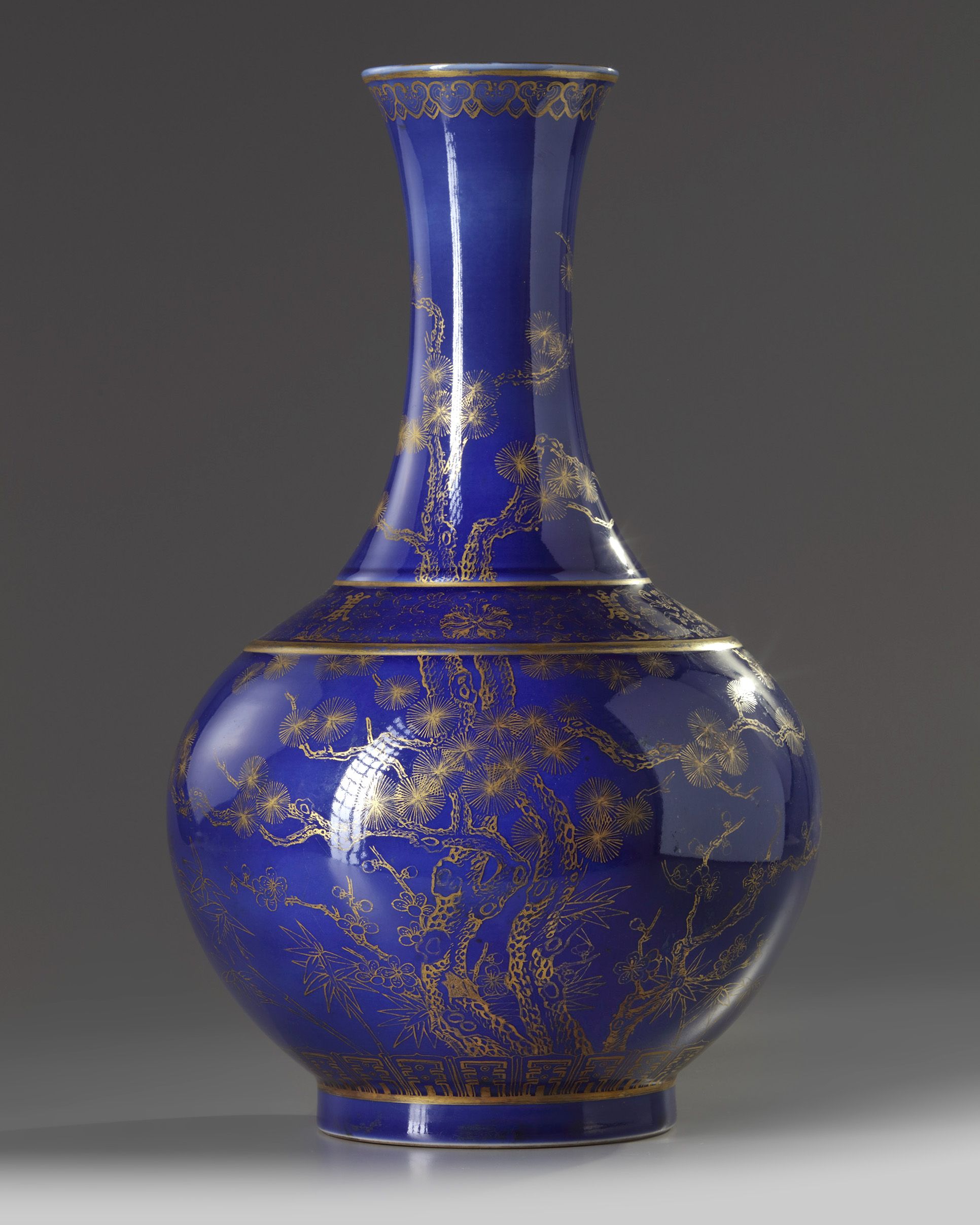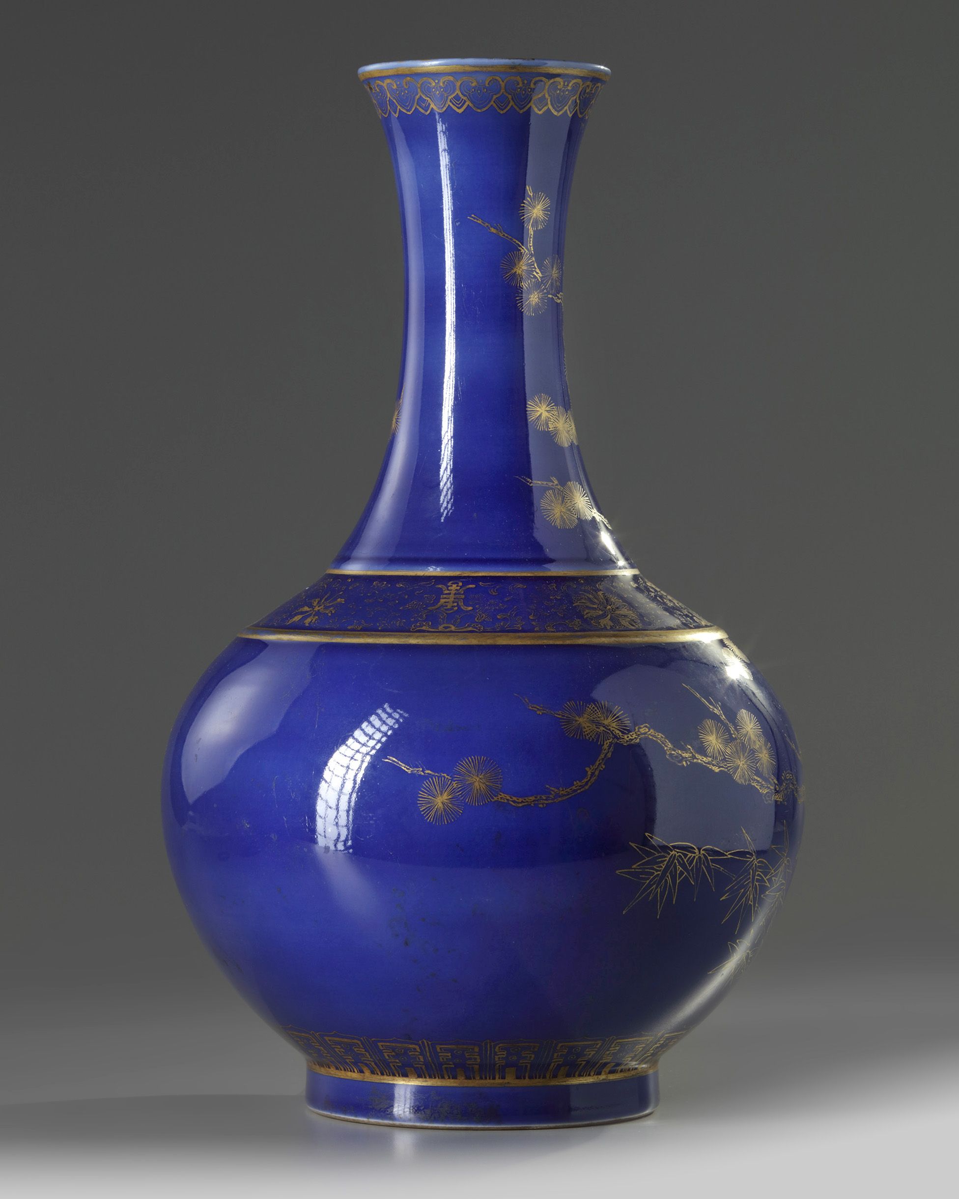 The vase is decorated to the exterior with pine, prunus, and bamboo, divided by a shou character and lotus band to the shoulder. The rim is encircled by a ruyi-head band and the foot is encircled by a lappet band. The base with a Guangxu mark in underglaze blue.