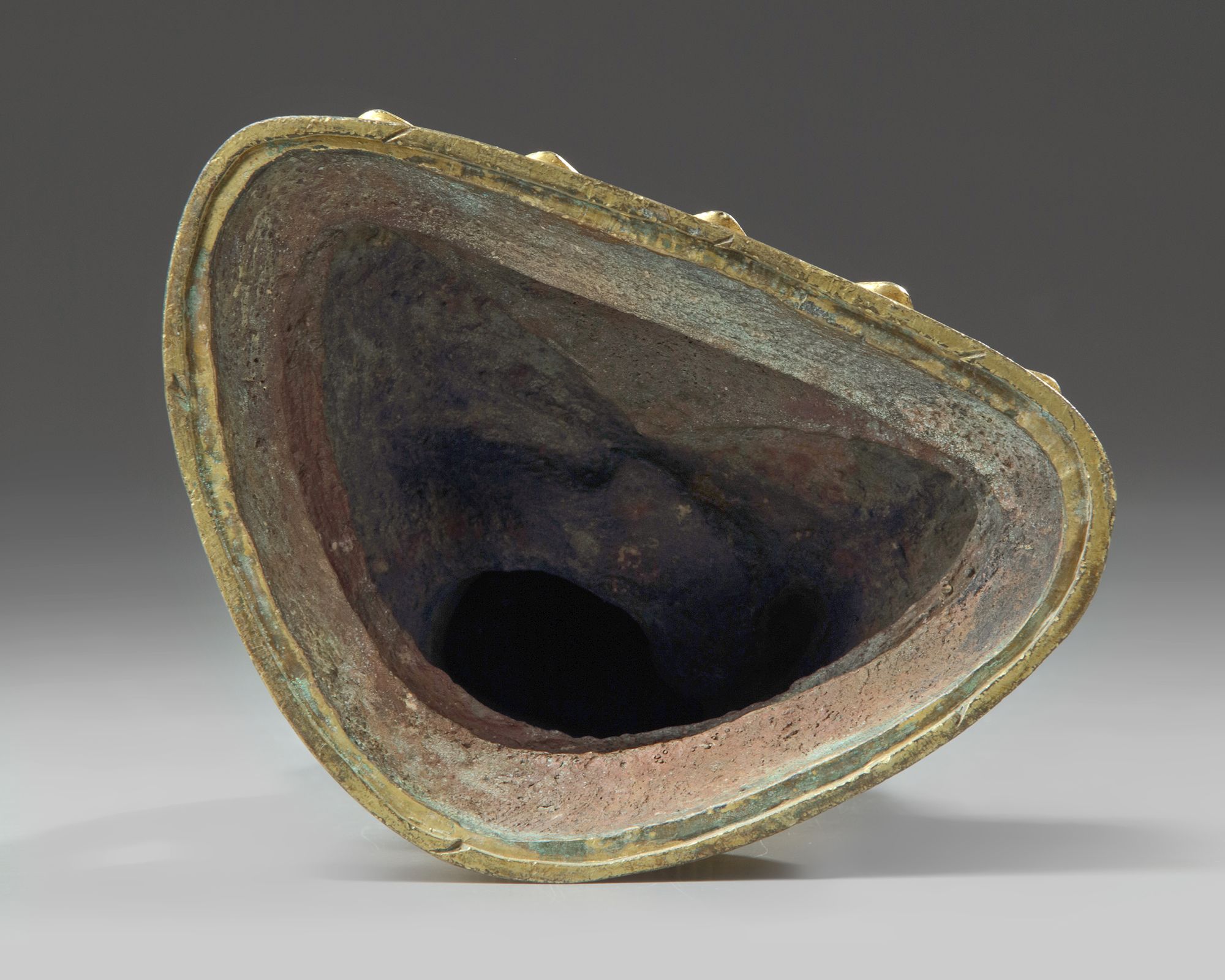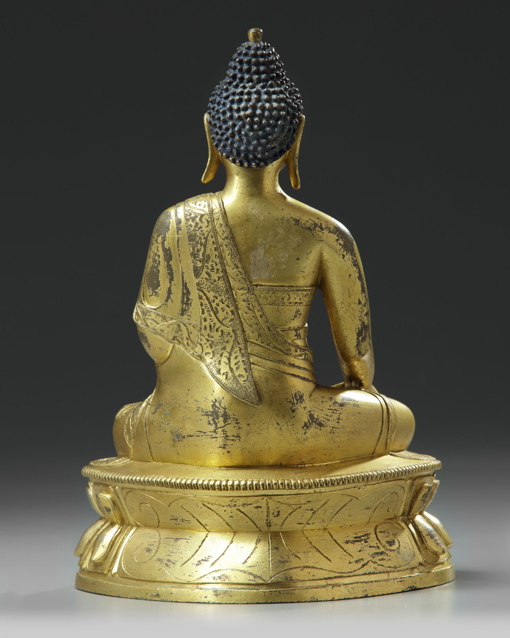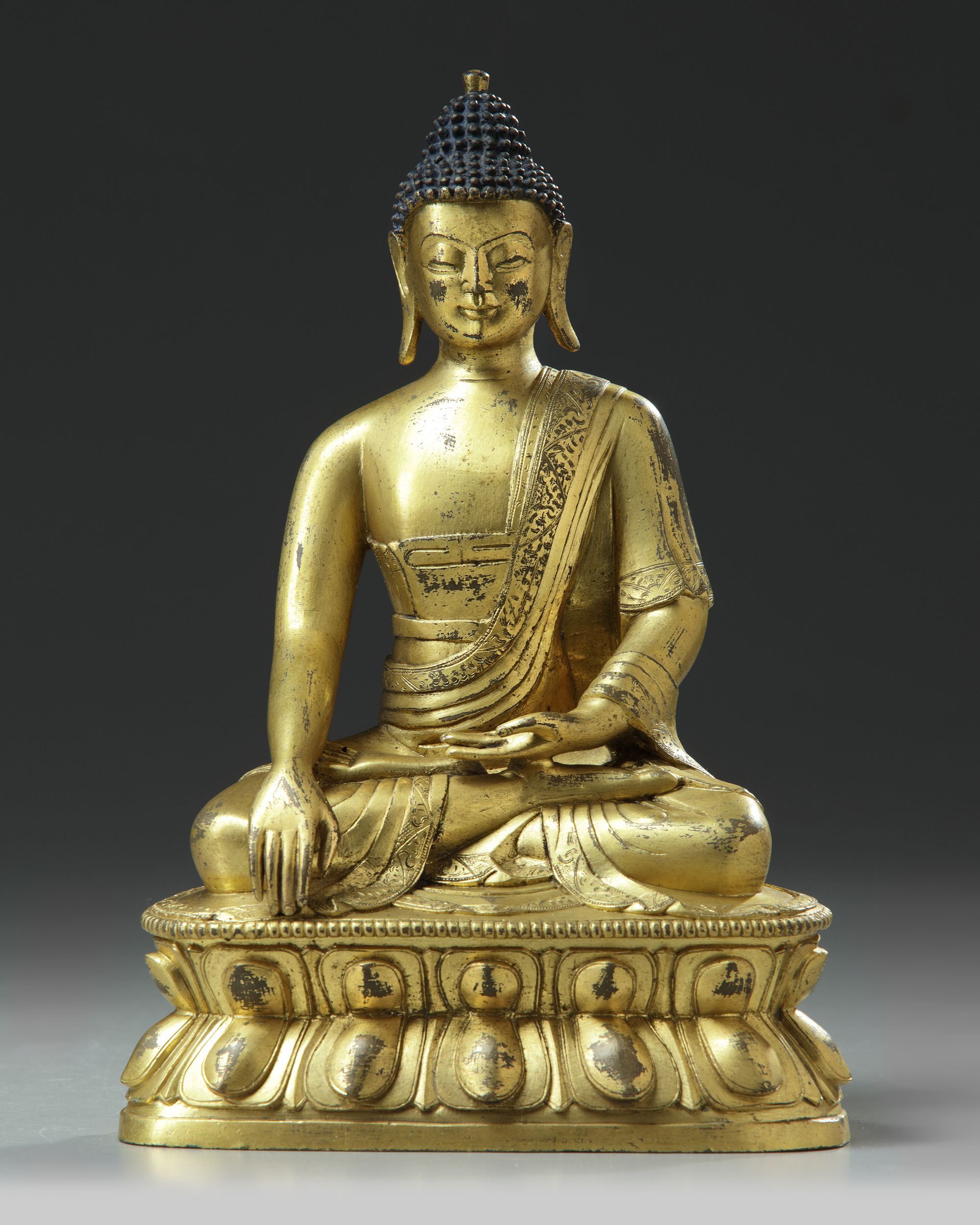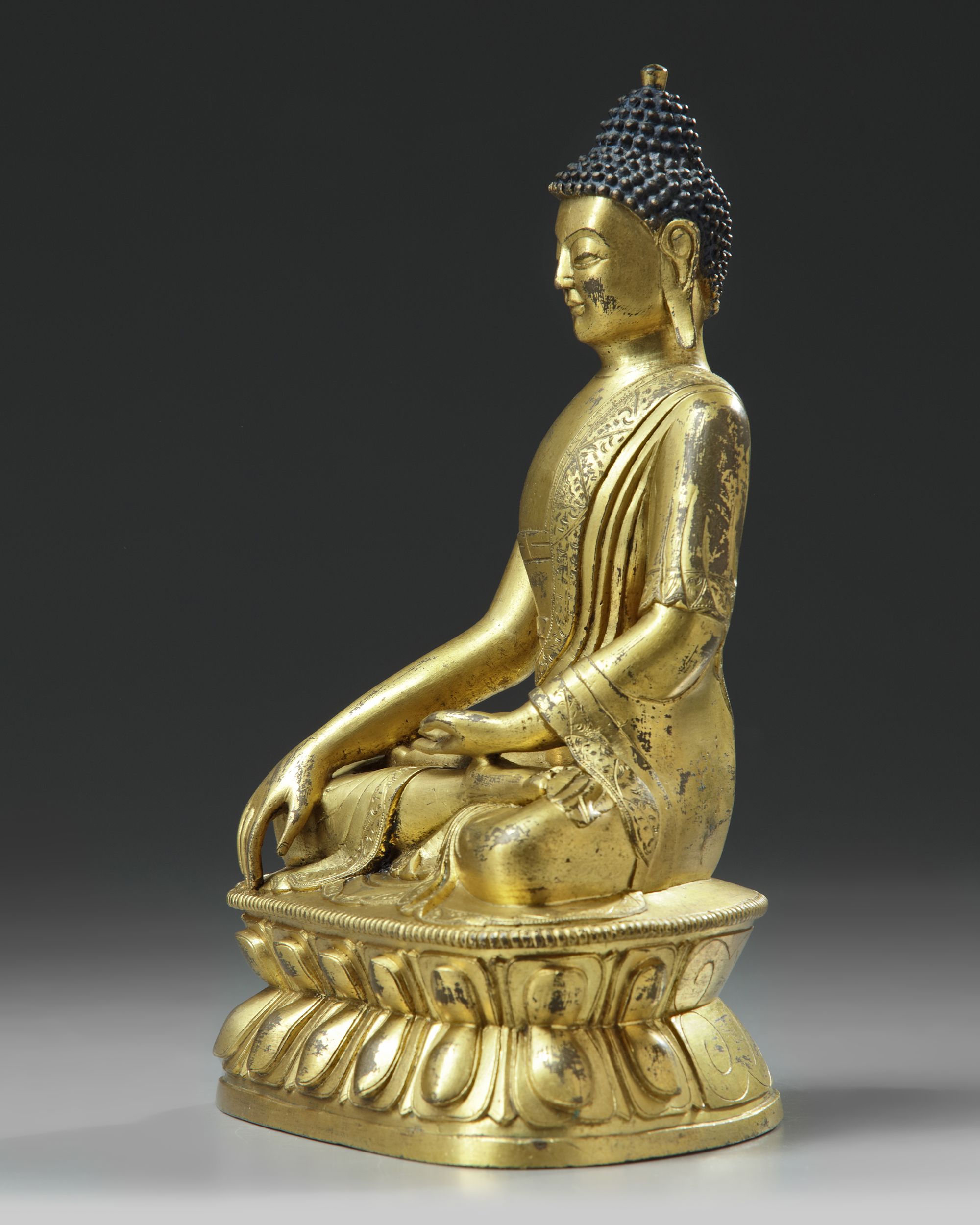 The figure is cast with a serene expression, seated in dhyanasana with one hand resting on his lap and the other hand in in bhumiparshamudra. He is seated on a double lotus base.