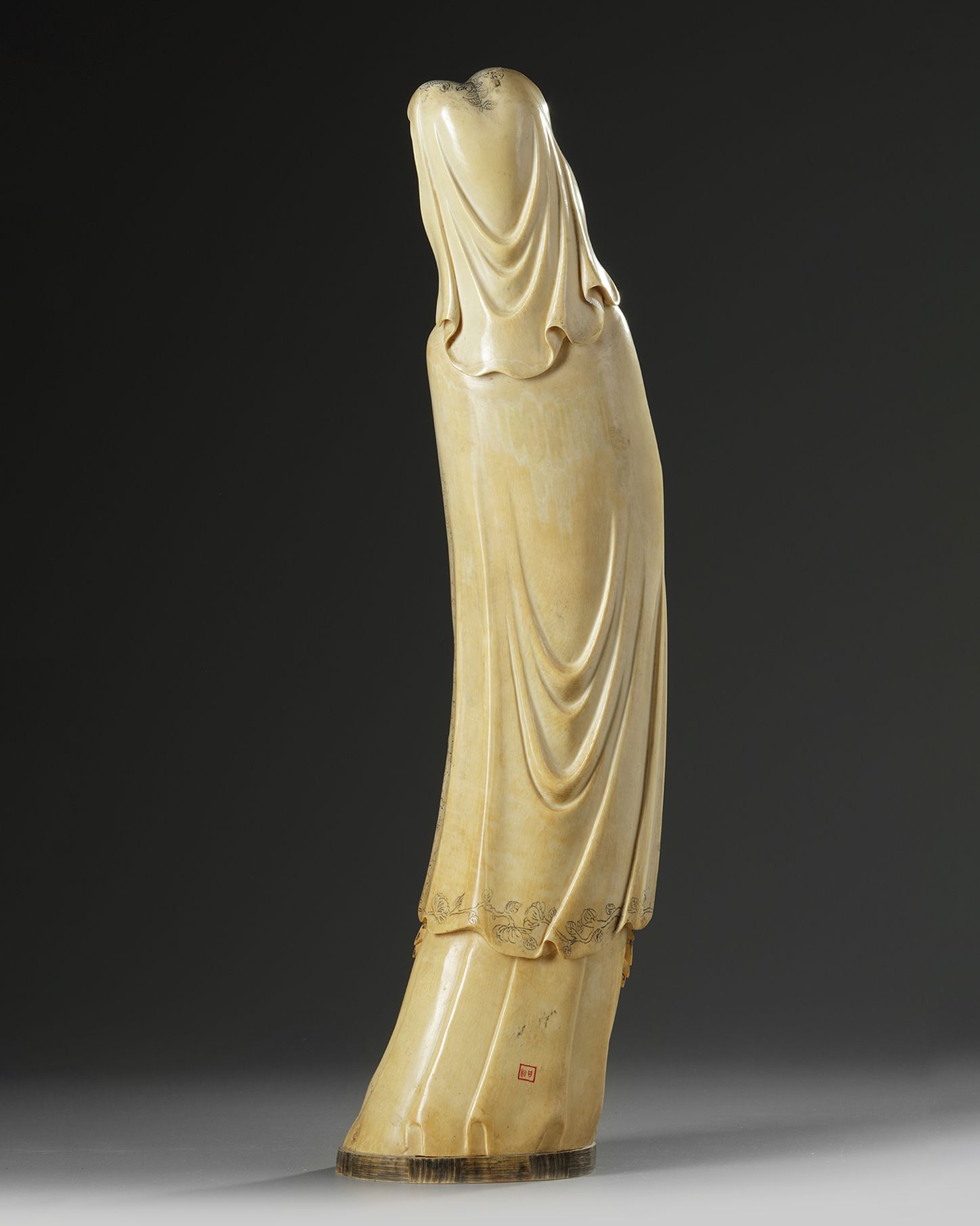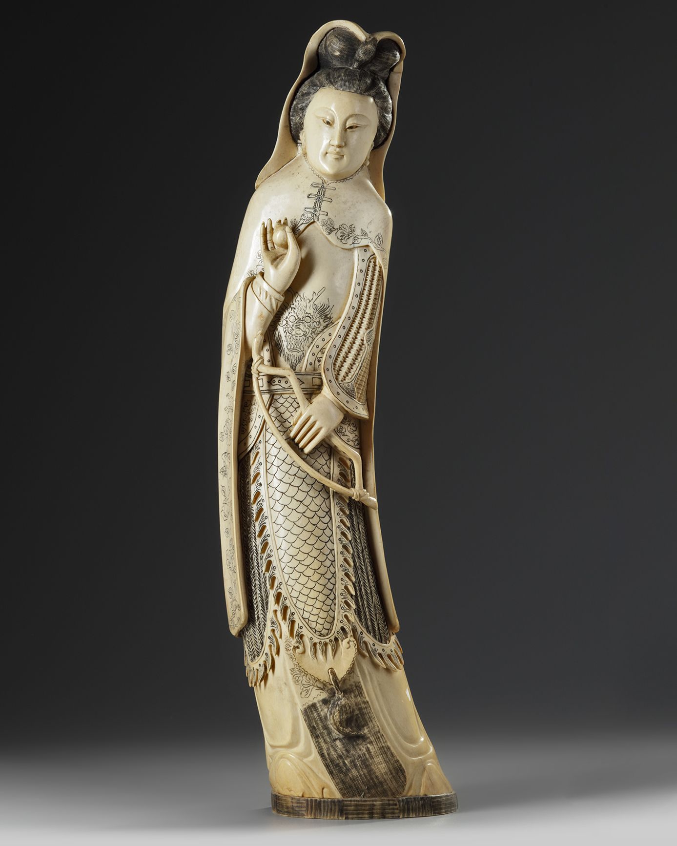 The figure is carved wearing a high cowl an a serene expression, she holds in one hand a ball and the other hand an archer's bow. The reverse with a two-character signature. 56 cm.