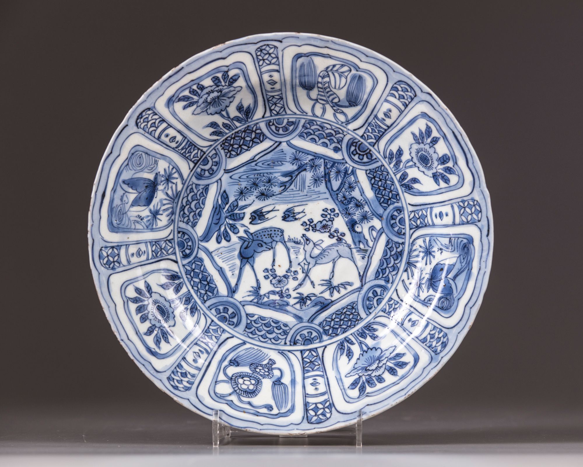 Decorated to the center with two deer amongst flowers, to the sides with alternating panels of a sunflower, butterflies and precious objects.