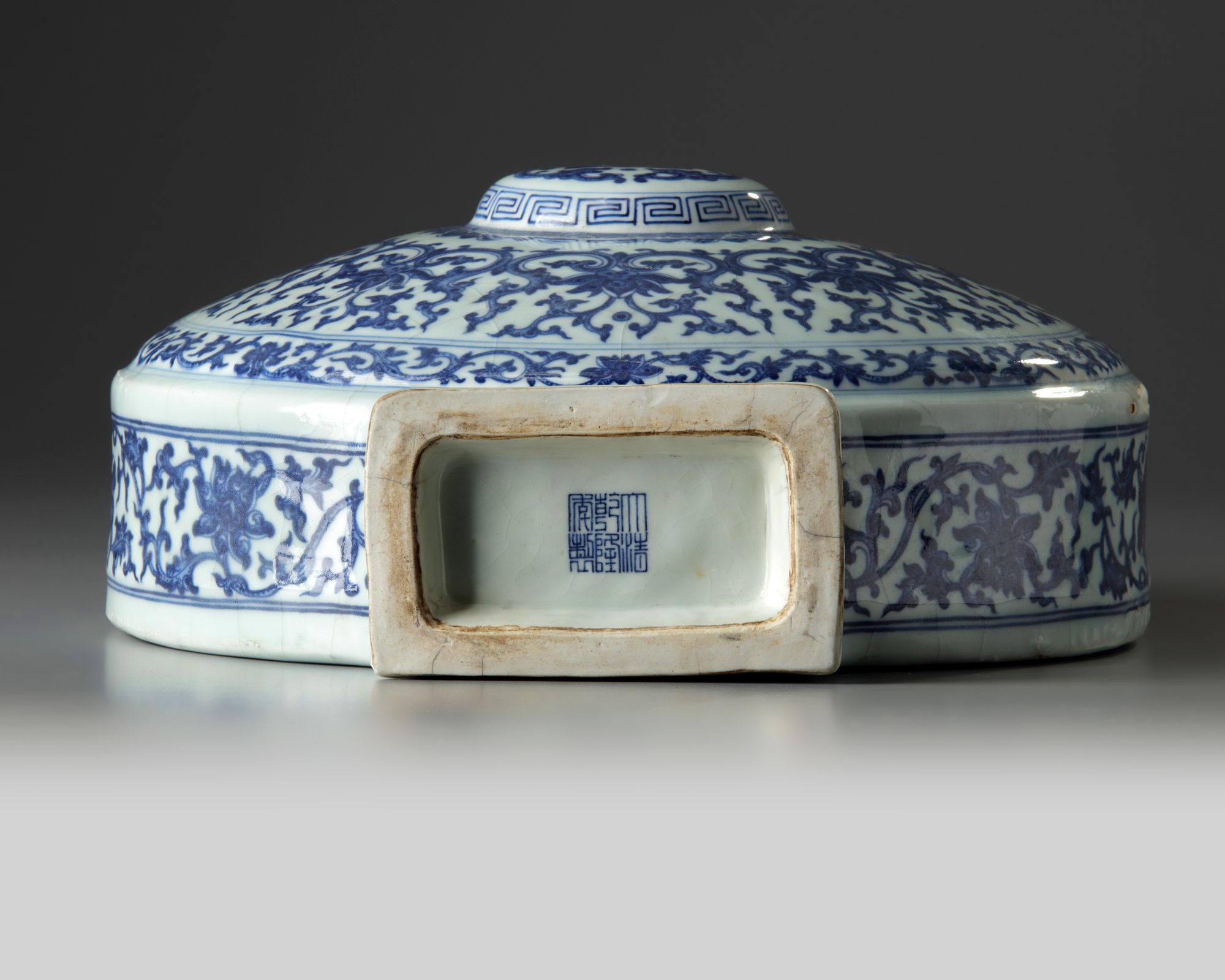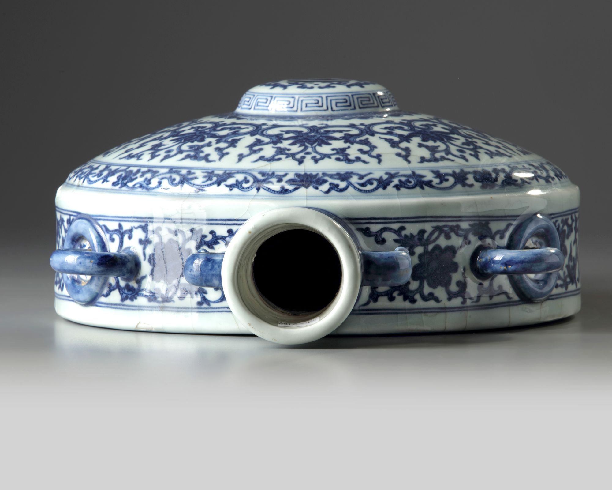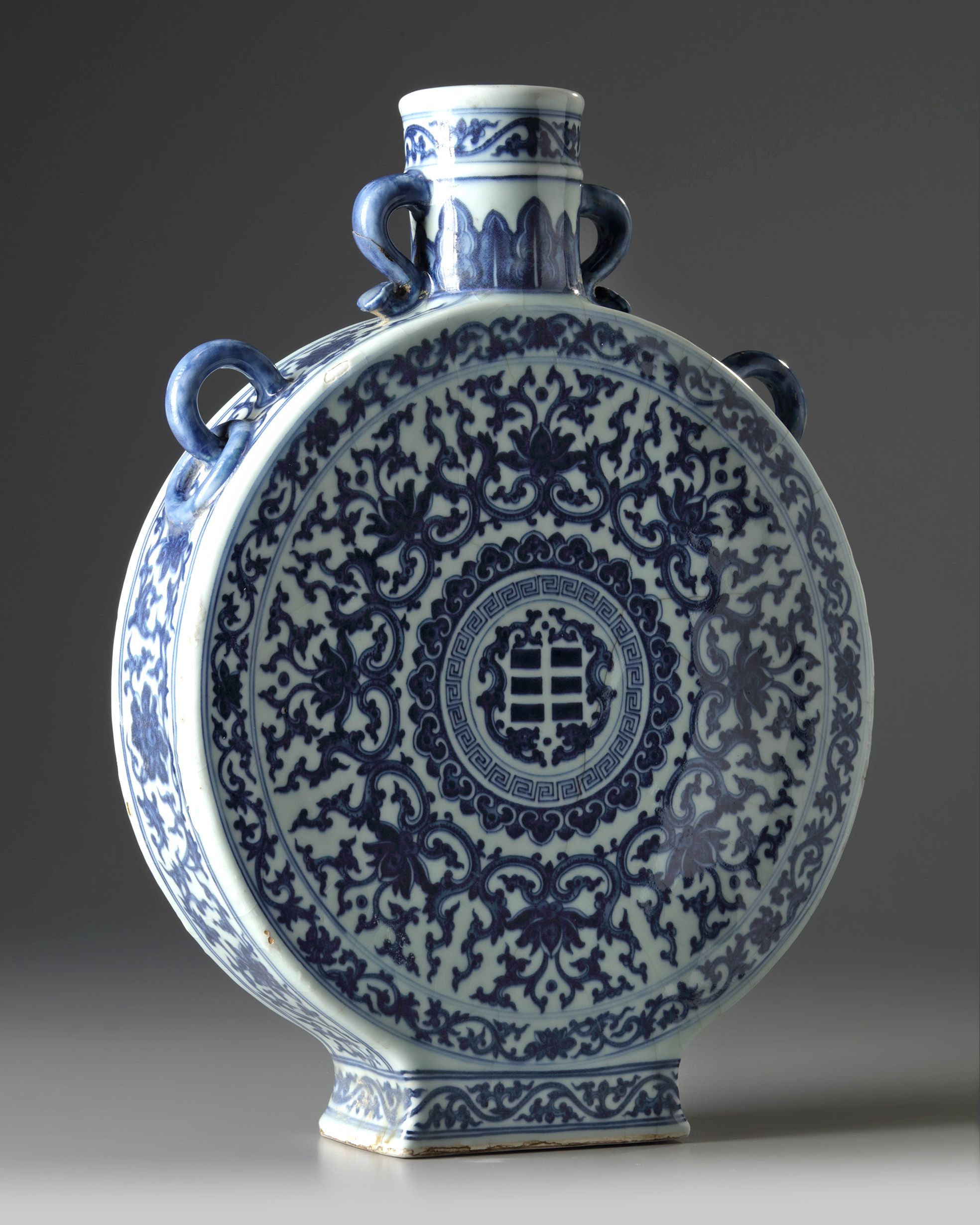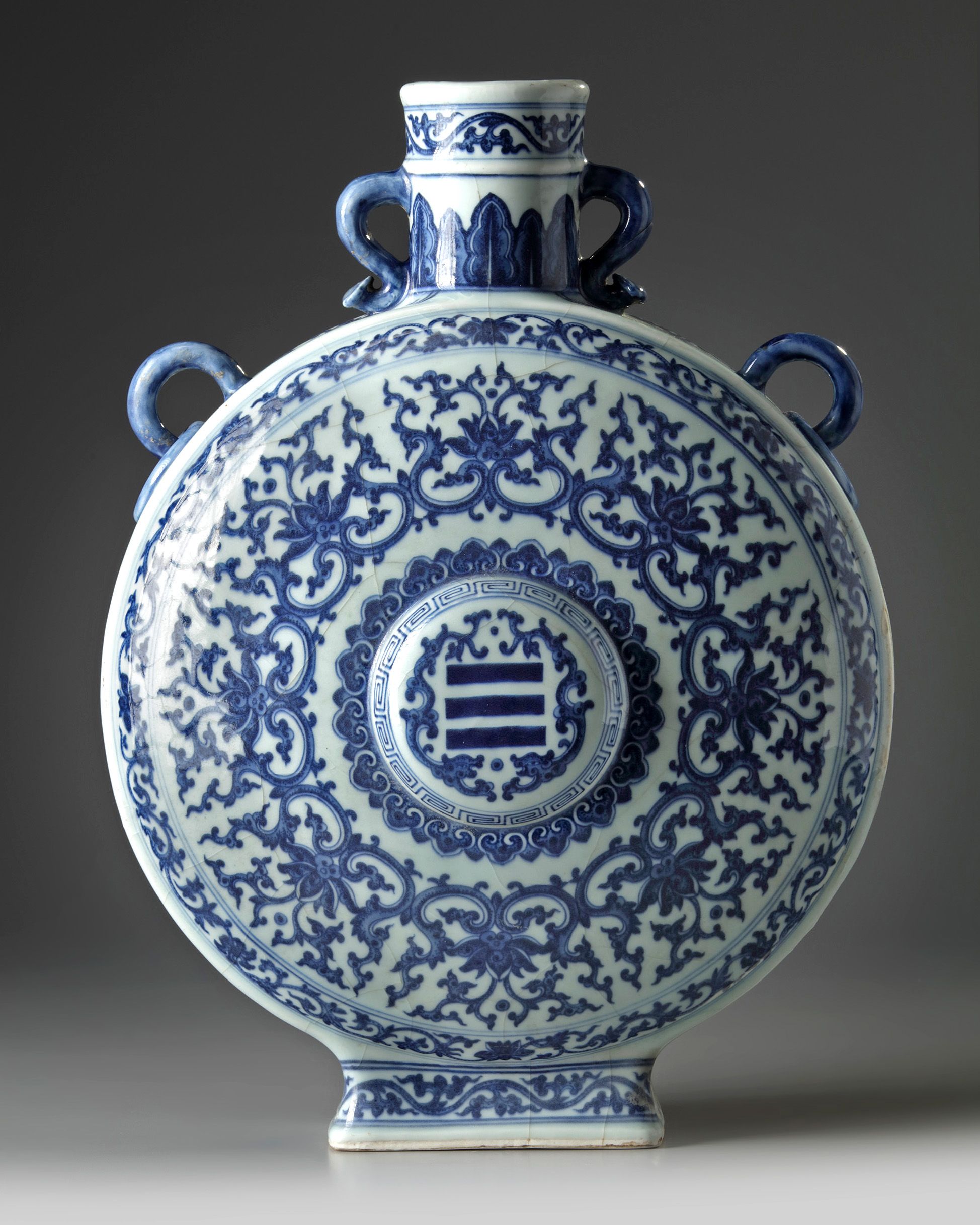The vase is moulded with two s-shaped ruyi-sceptre handles to the neck, and two fixed ring handles to the shoulders, the domed front section is decorated with a raised roundel enclosing 'qian', one of the Eight Daoist Symbols meaning 'heaven', surrounded by two registers of lotus bands. The sides are similarly decorated, and the neck is encircled by a stiff leaf band. The design is repeated on the flattened reverse, with the central roundel enclosing the symbol 'kun', for earth. The base with an apocryphal Qianlong mark.