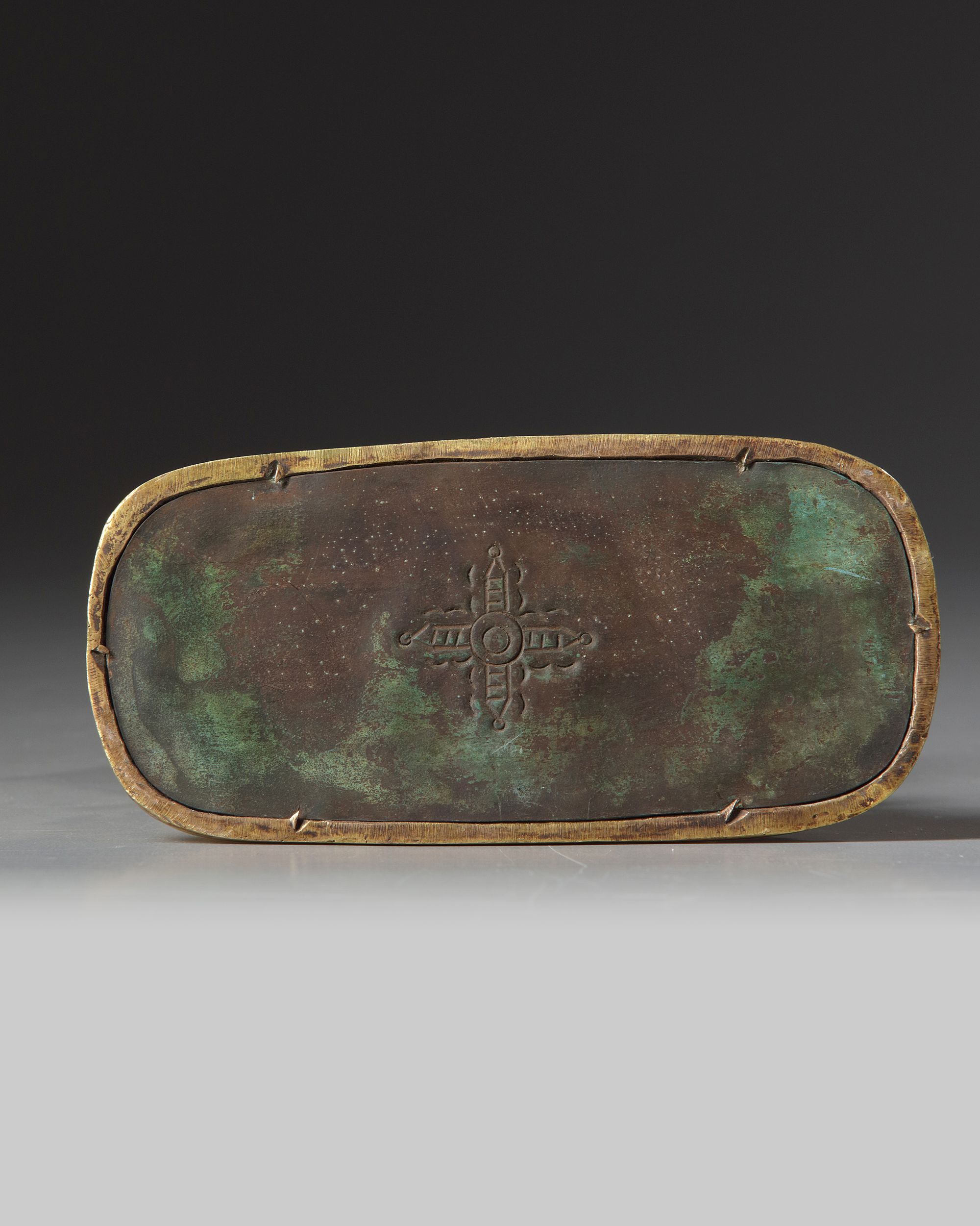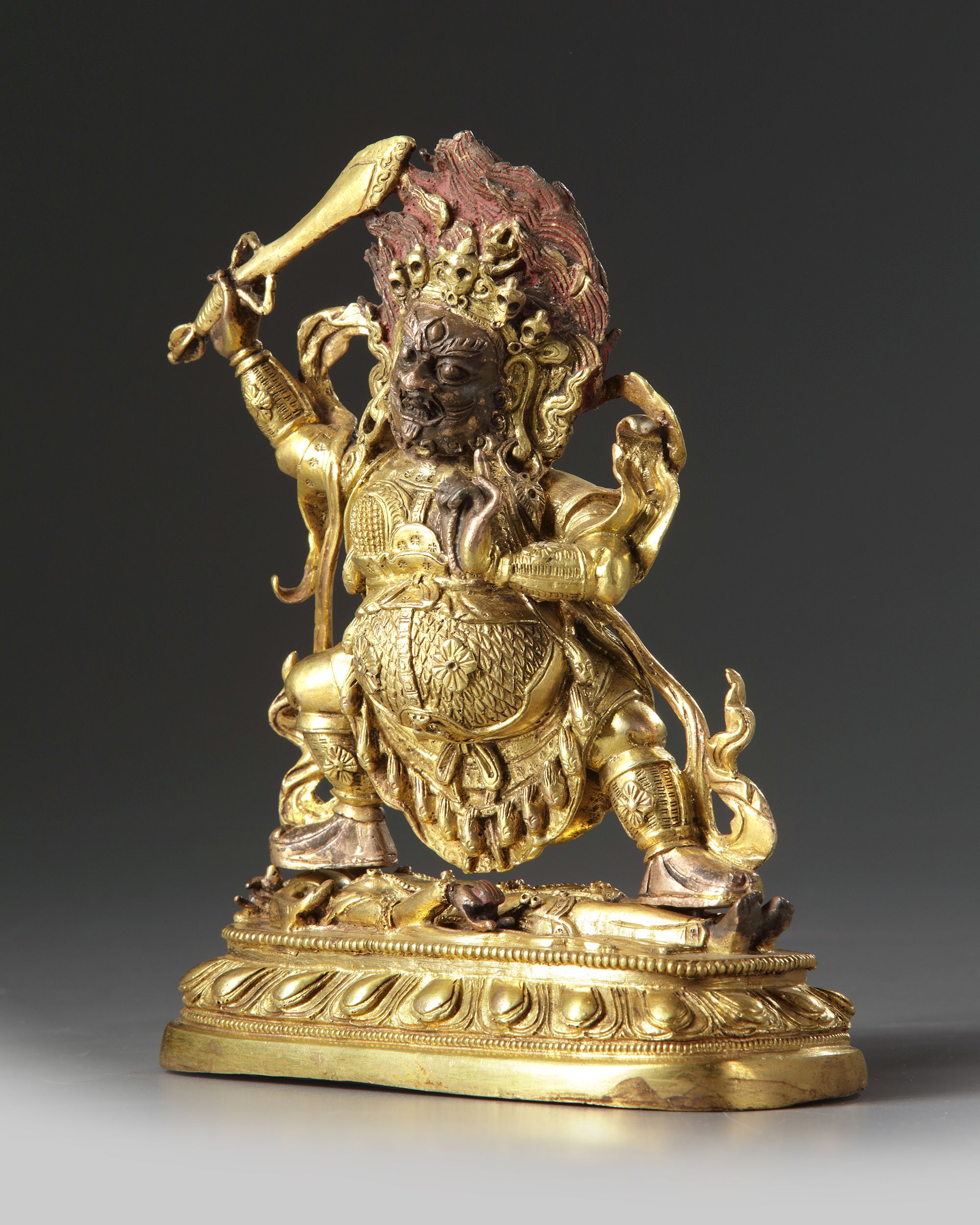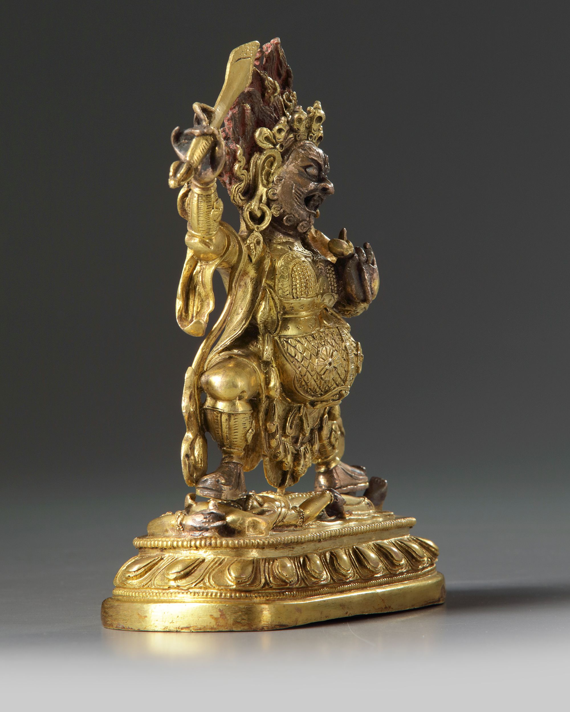 Striding in alidhasana on a prostrate figure of Ganapati over a lotus base and his right hand brandishing a sword, the left holding a stem of a lotus, wearing a tiger skin around his waist. The ferocious face with bared fangs, bulging eyes, and flaming brows surmounted by a tiara centered by a kirttimukha, the hair in flames supporting a vajra. The base is sealed with a plate inscribed with a double vajra.