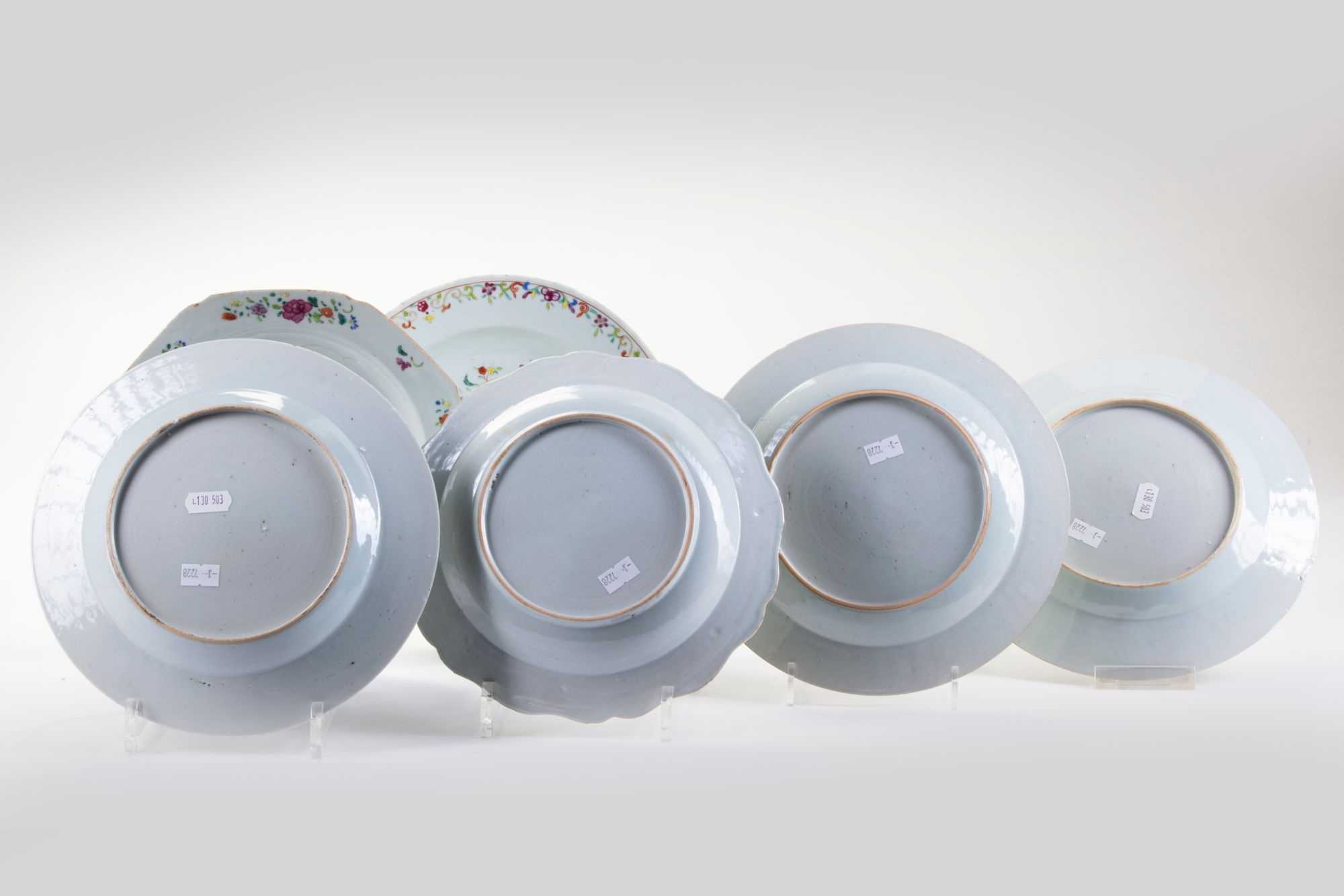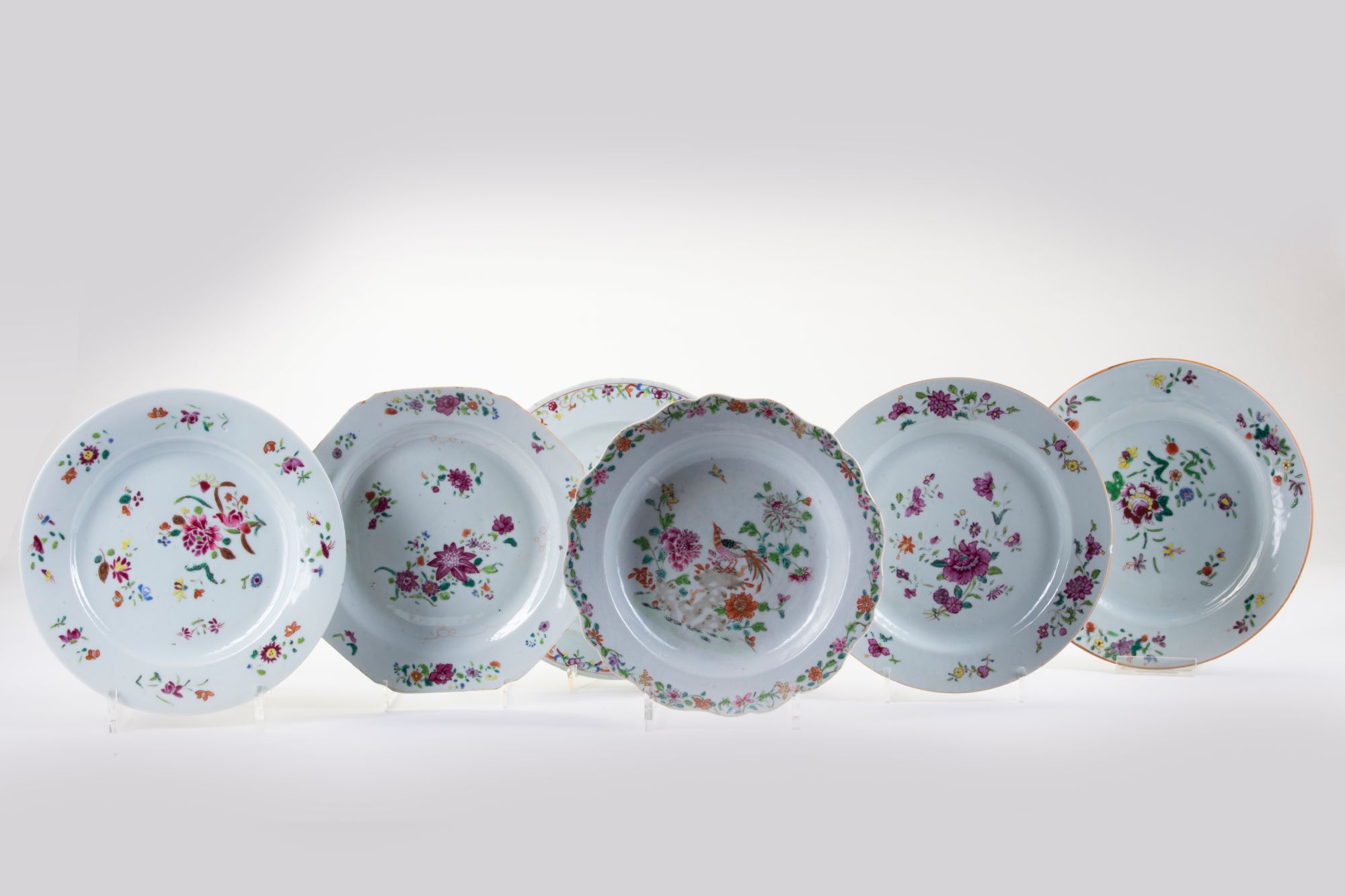 All dishes decorated with floral sprays, one dish with floral sprays and a pheasant upon rock work. 22 cm diameter.