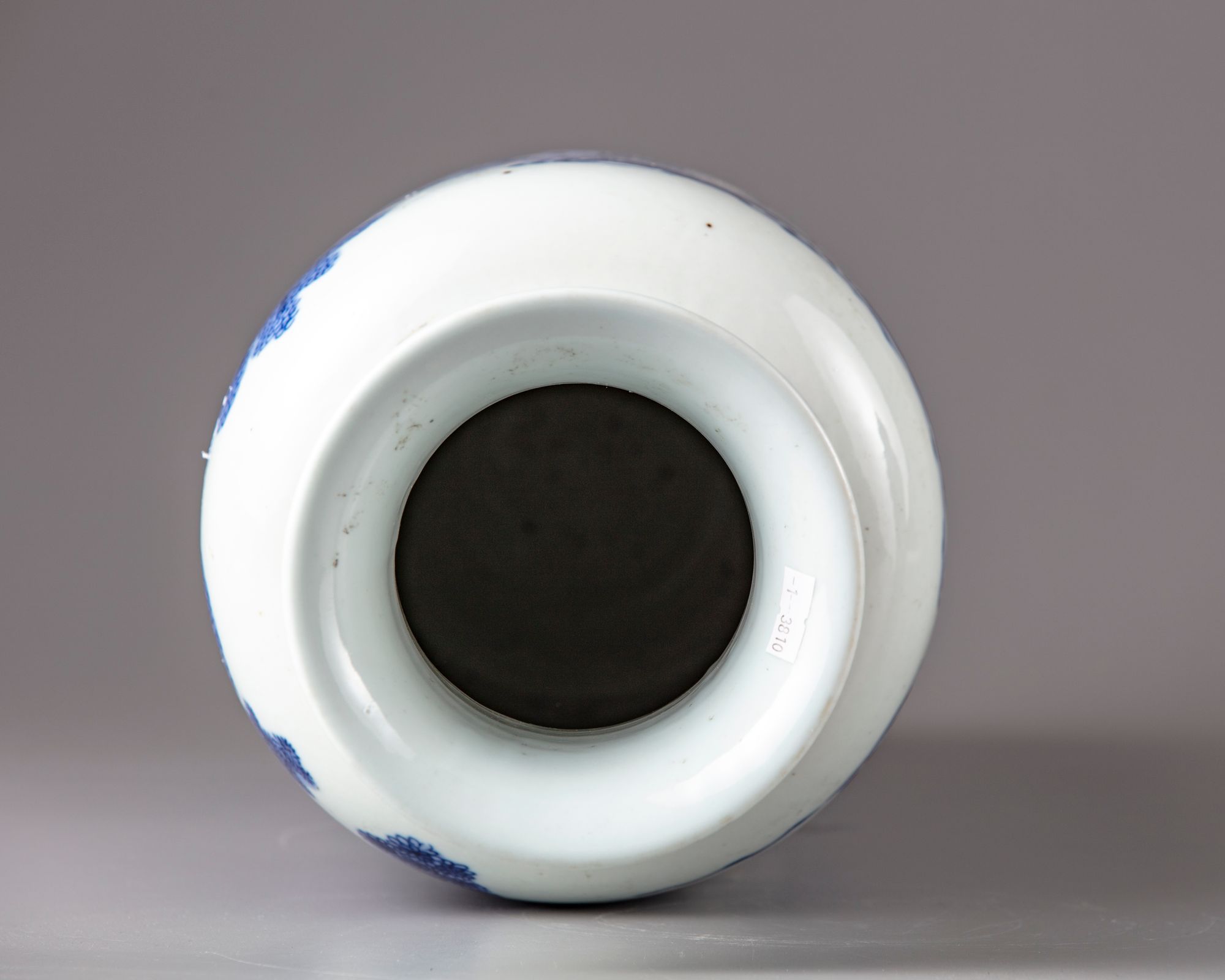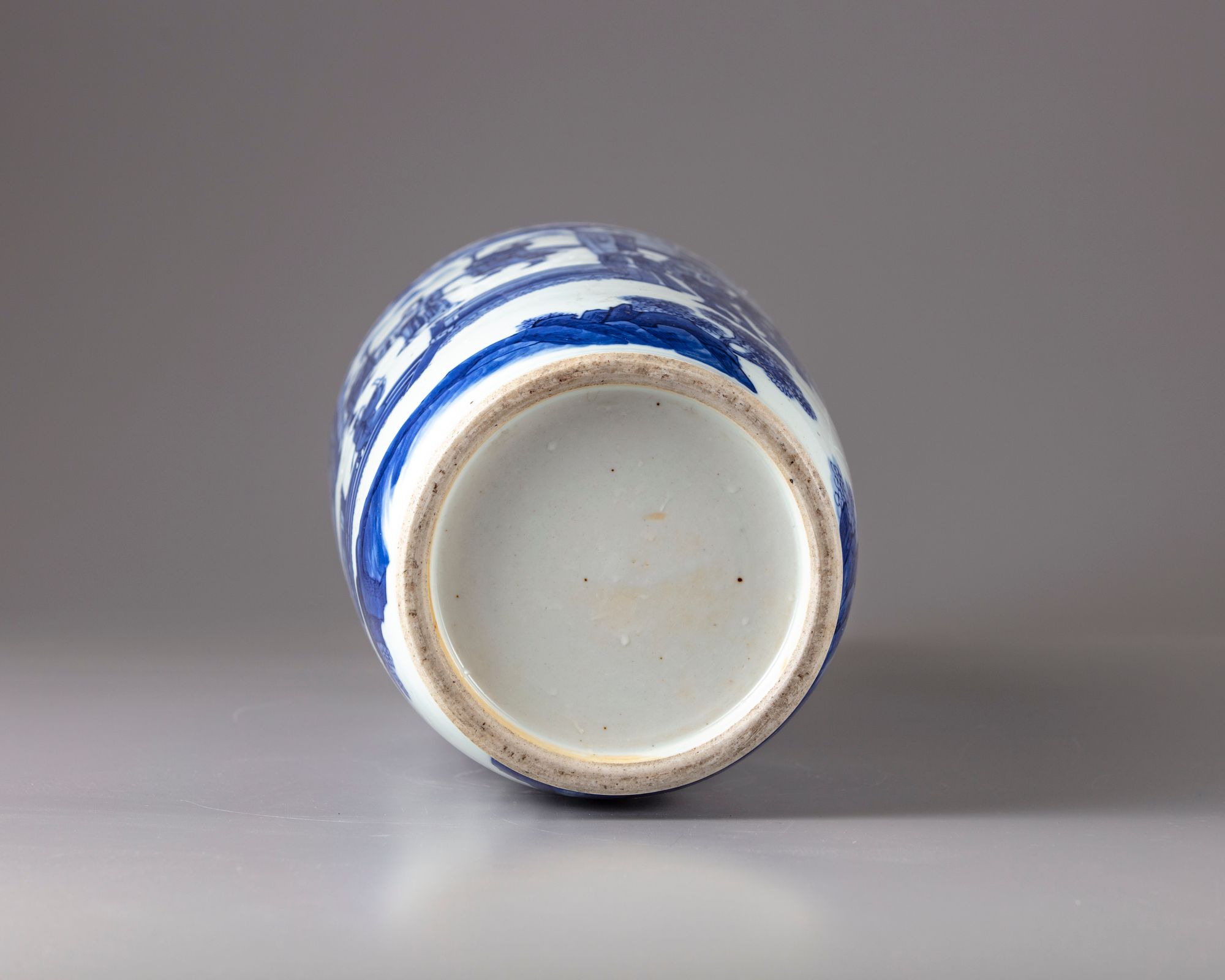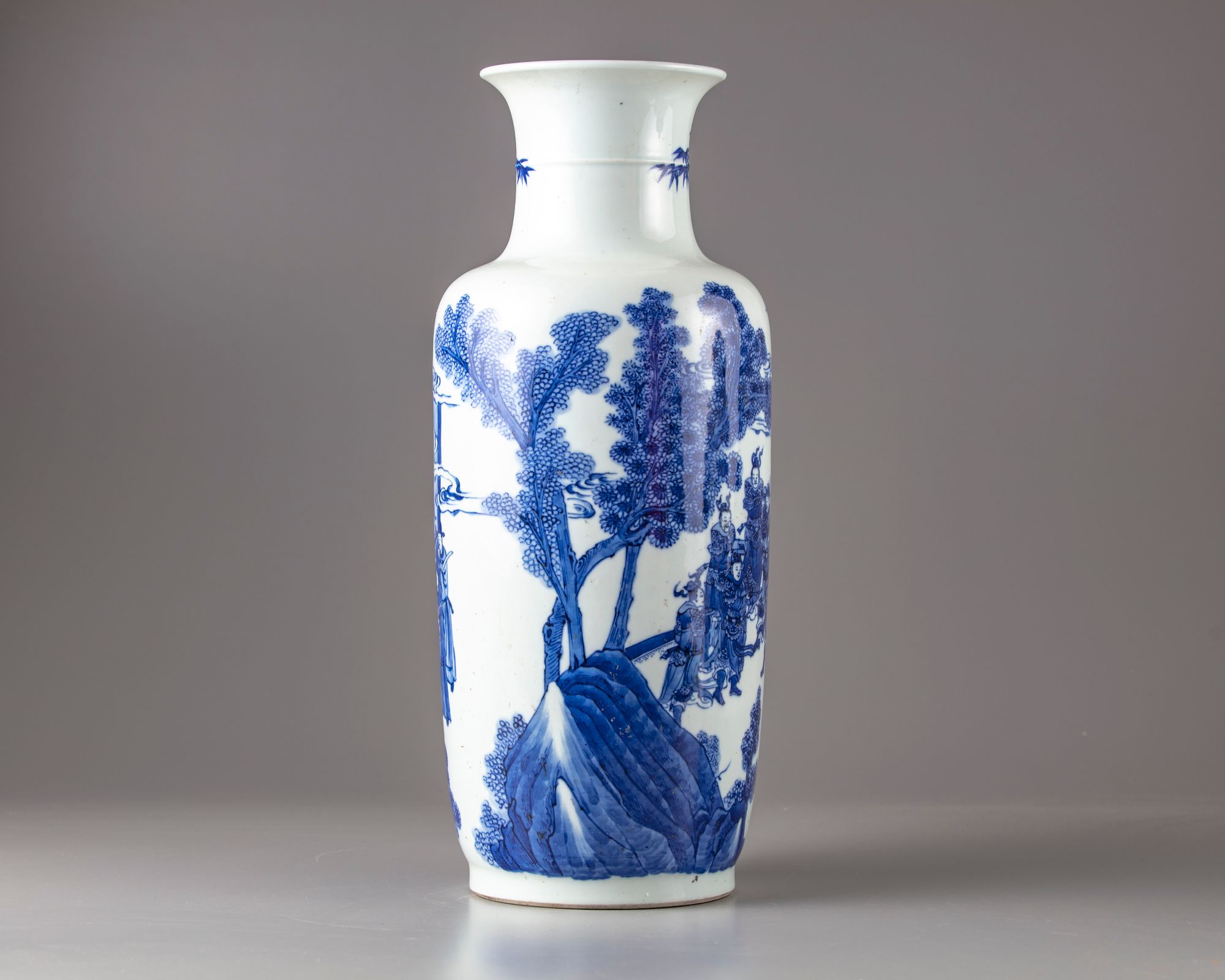 The rouleau vase is decorated in cobalt blue with a continuous scene of a dignitary figure with his servants and attendants,The reverse with large blossoming cherry trees .