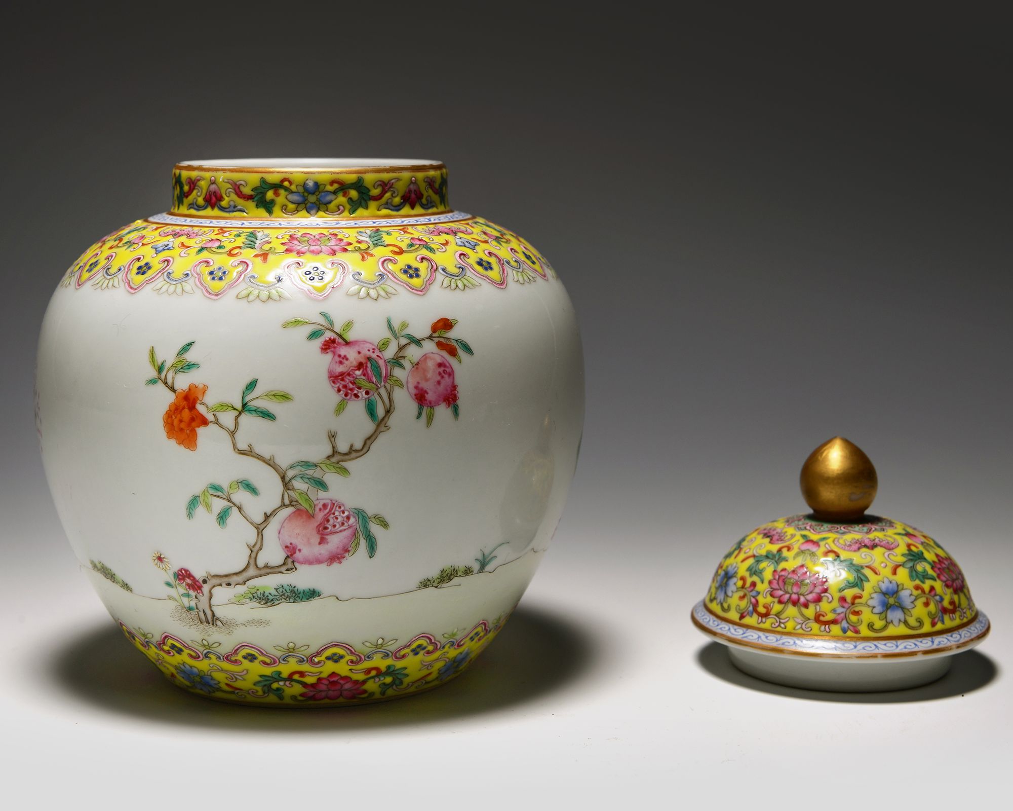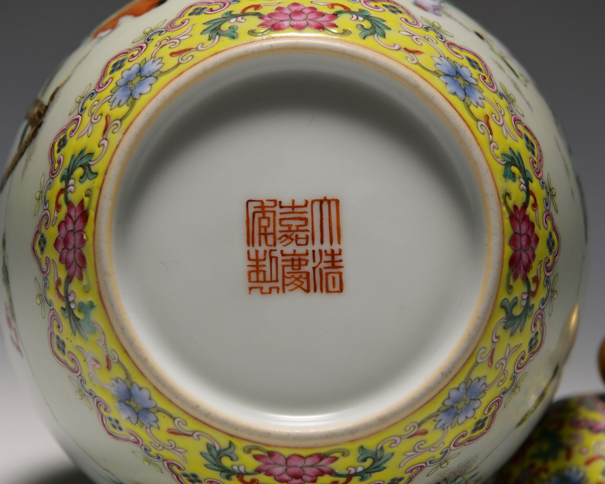 A Chinese porcelain jar decorated with an elegant lady with kids at play in al andscape. All set between a band of ruyi heads anf flower scrolls on a yellow ground. The bottom with a Chinese Jiaqing seal mark.
