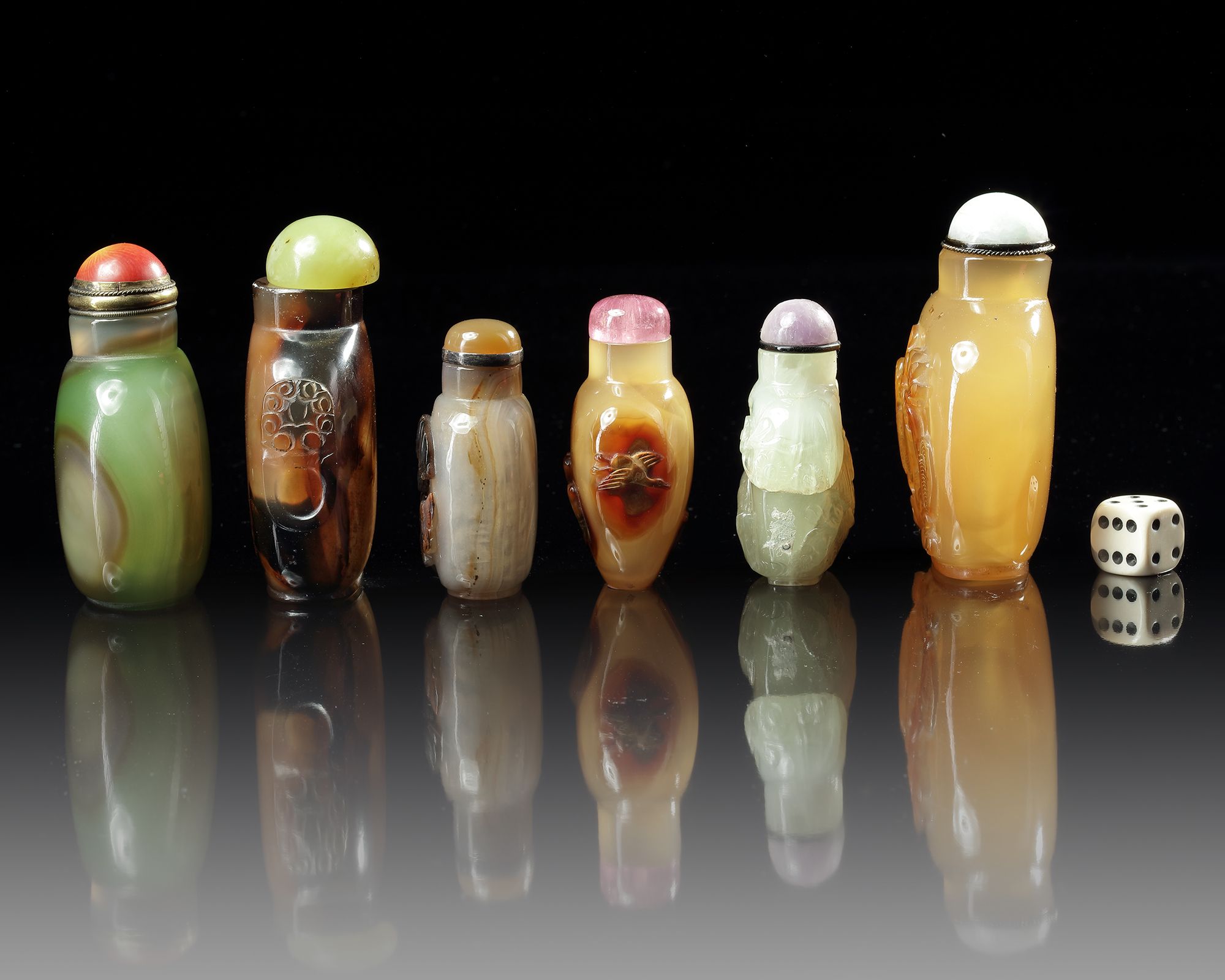 A group of agate and jade snuff bottles, some carved with animals or figures.