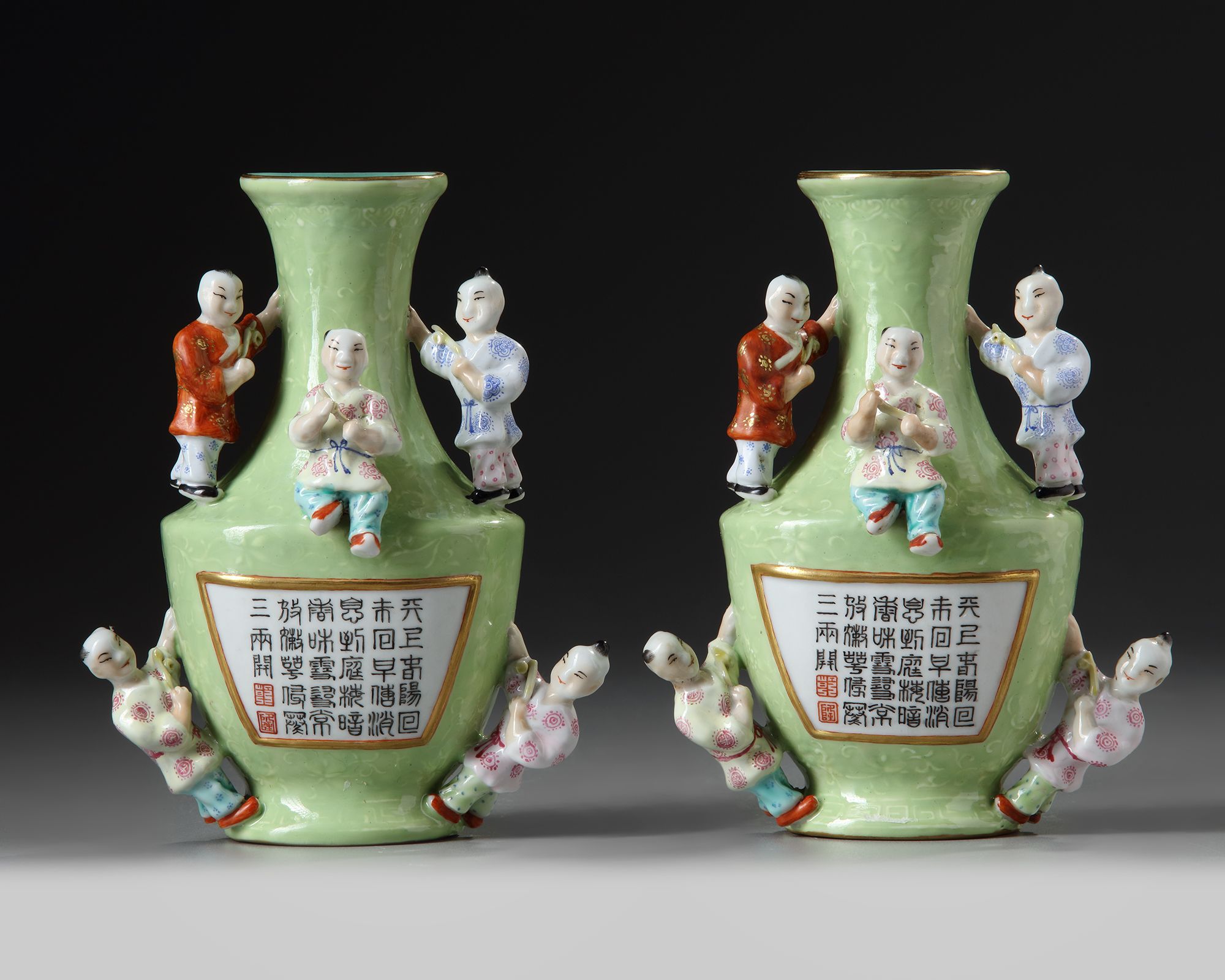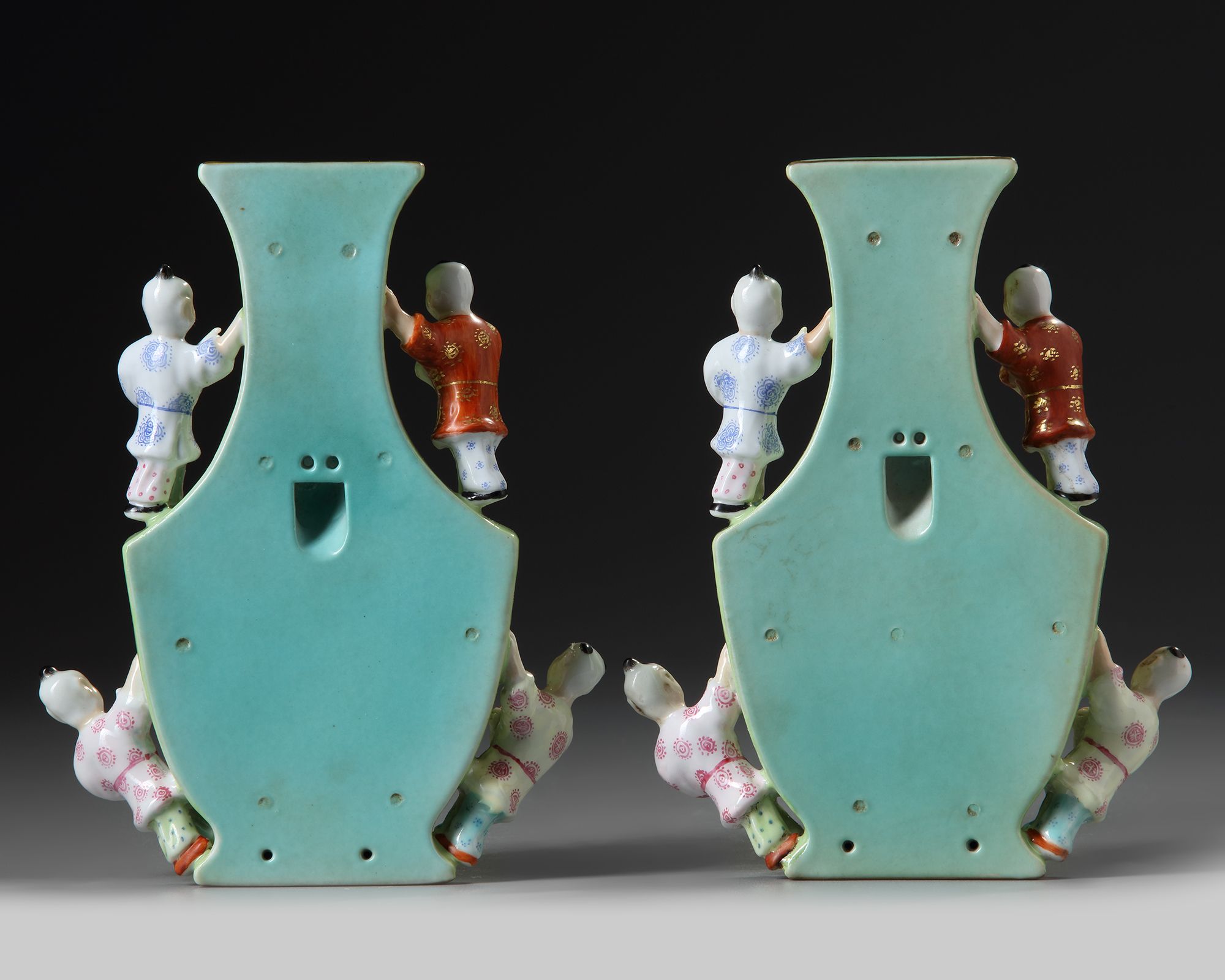 A PAIR OF CHINESE FAMILLE ROSE BOYS WALL VASES,19TH-20TH CENTURY