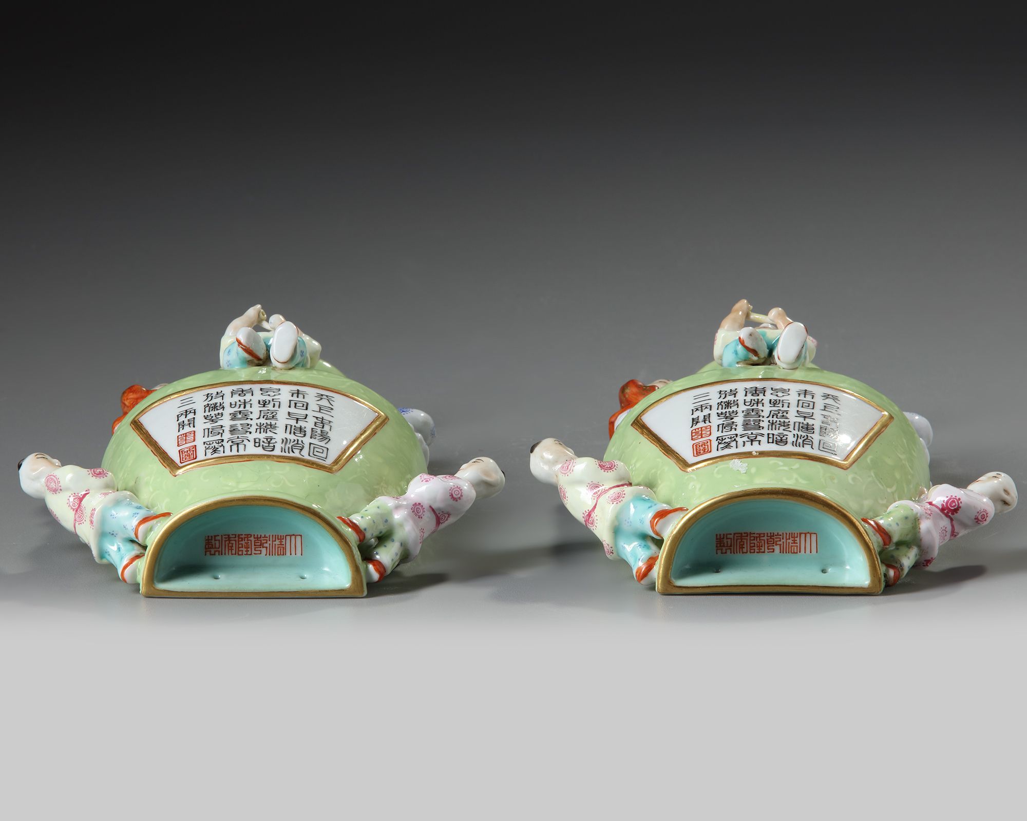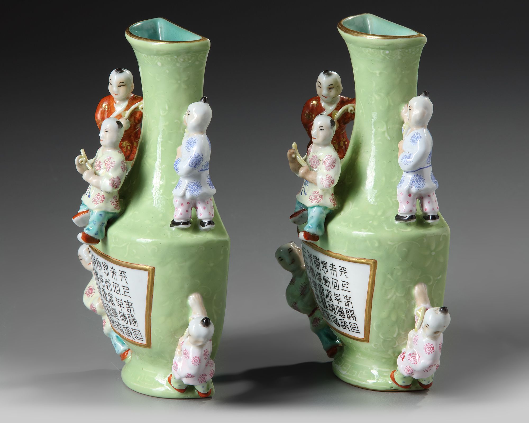 Each vase is stylised with five boys, decorated with a panel enclosing Chinese poems.