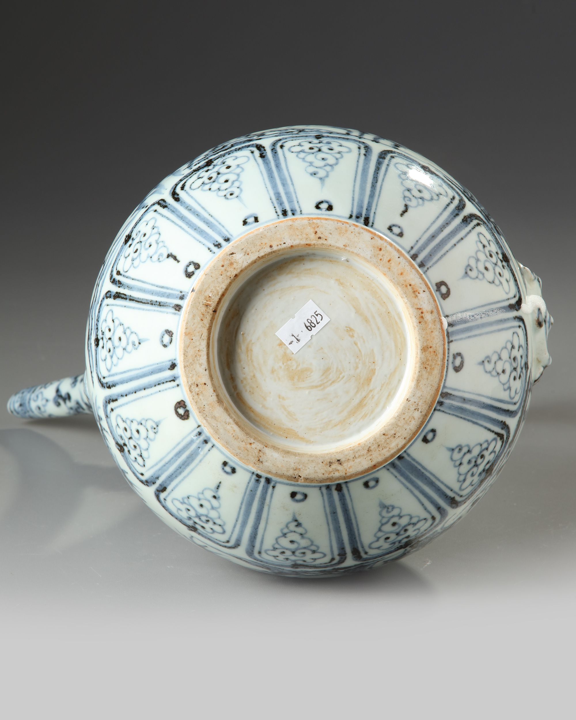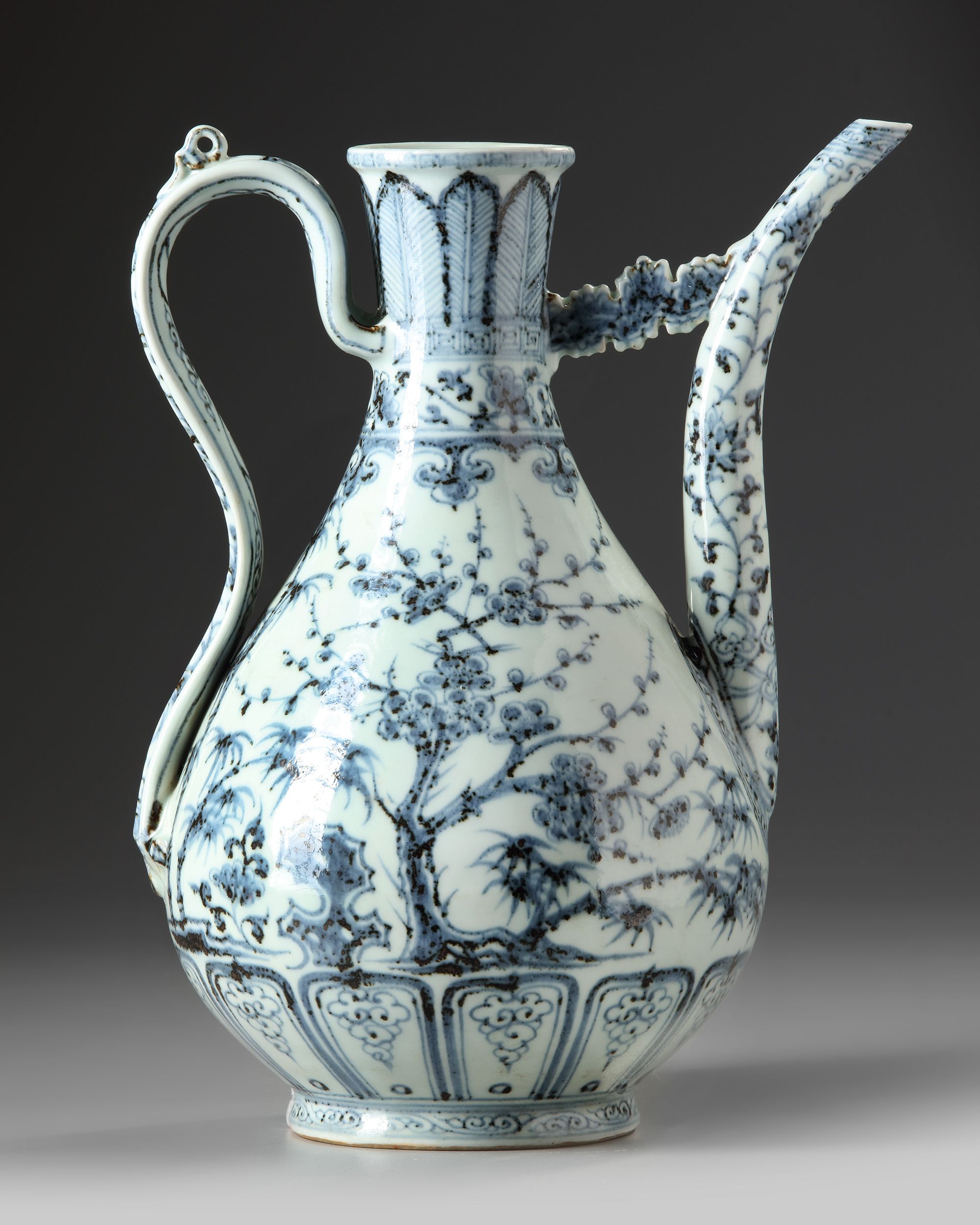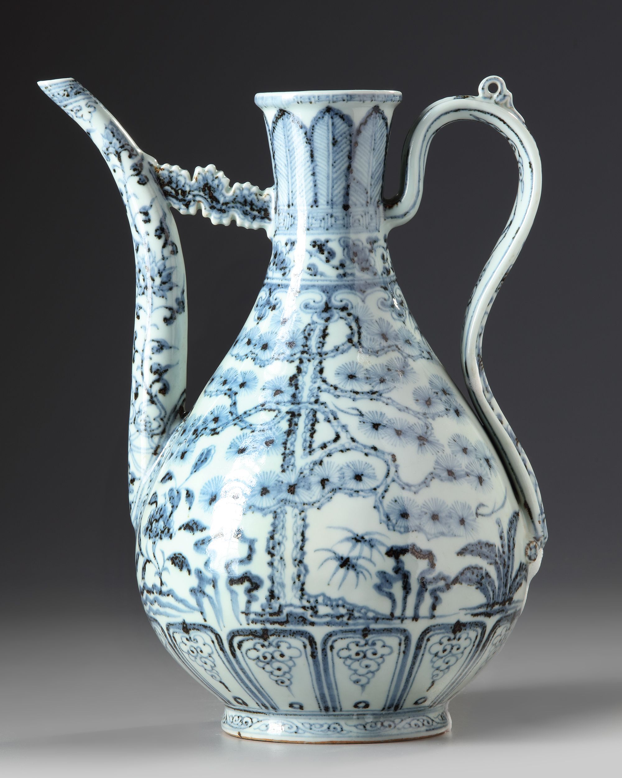 The pear-shaped body is superbly potted with an elegant spout, joined to the neck with a cloud-shaped strut opposite a ridged loop handle above three moulded bosses simulating studs holding the handle in place, finely painted in attractive vibrant tones of cobalt to each sides of the body with pine, bamboo and prom know as the three friends of winter amongst rocks, with plantain leaves to the base and stiff leaves to the neck. 32 cm high.