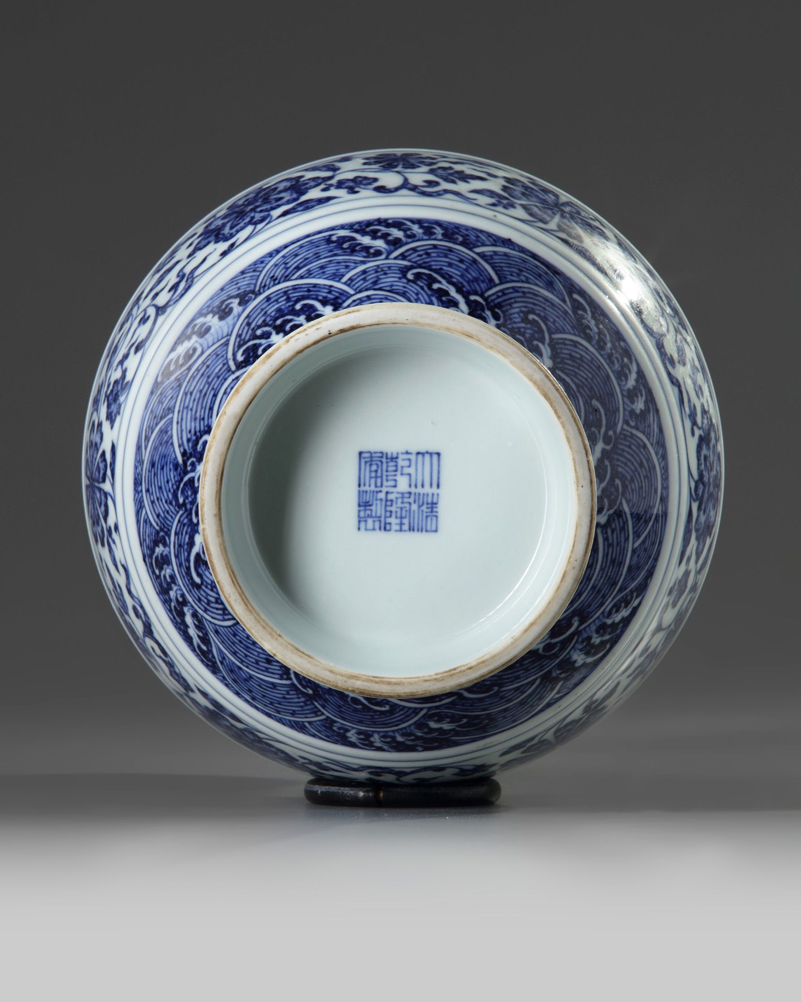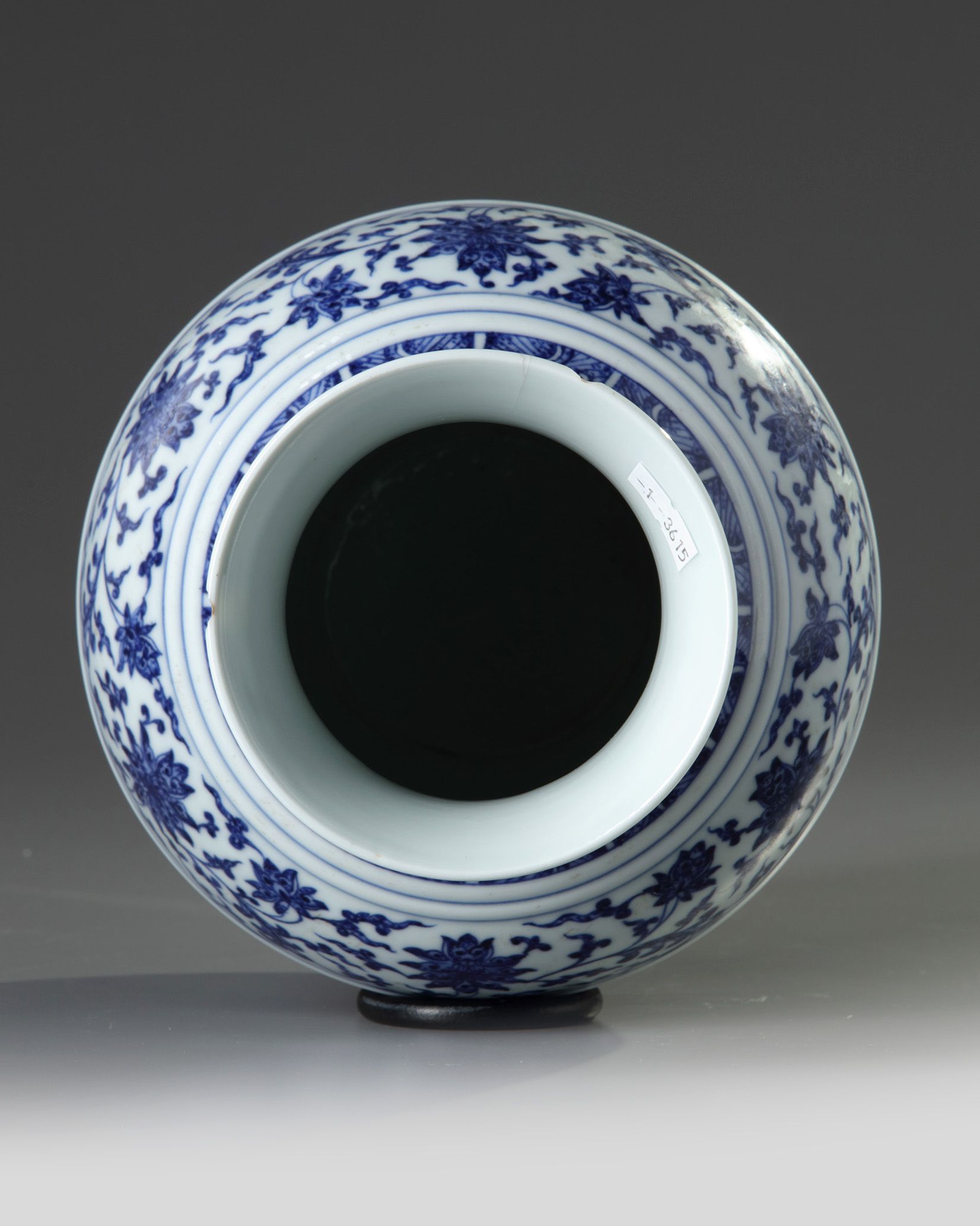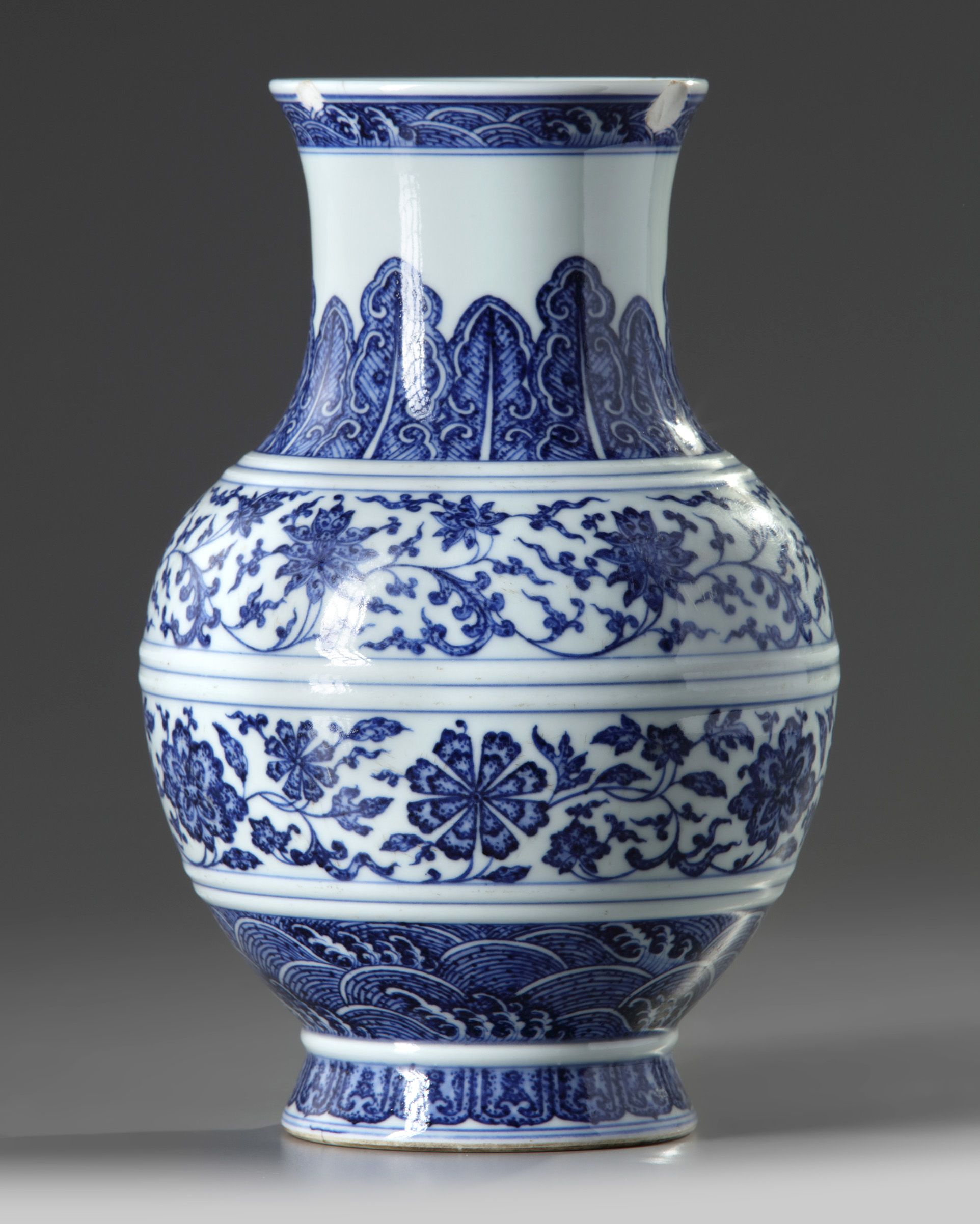 The vase is decorated in several registers, with two scrolling floral bands to the globular body separated by a raised rib, below a band of stiff leaves at the neck and between wave band to the foot and rim. The base with an apocryphal Qianlong mark.