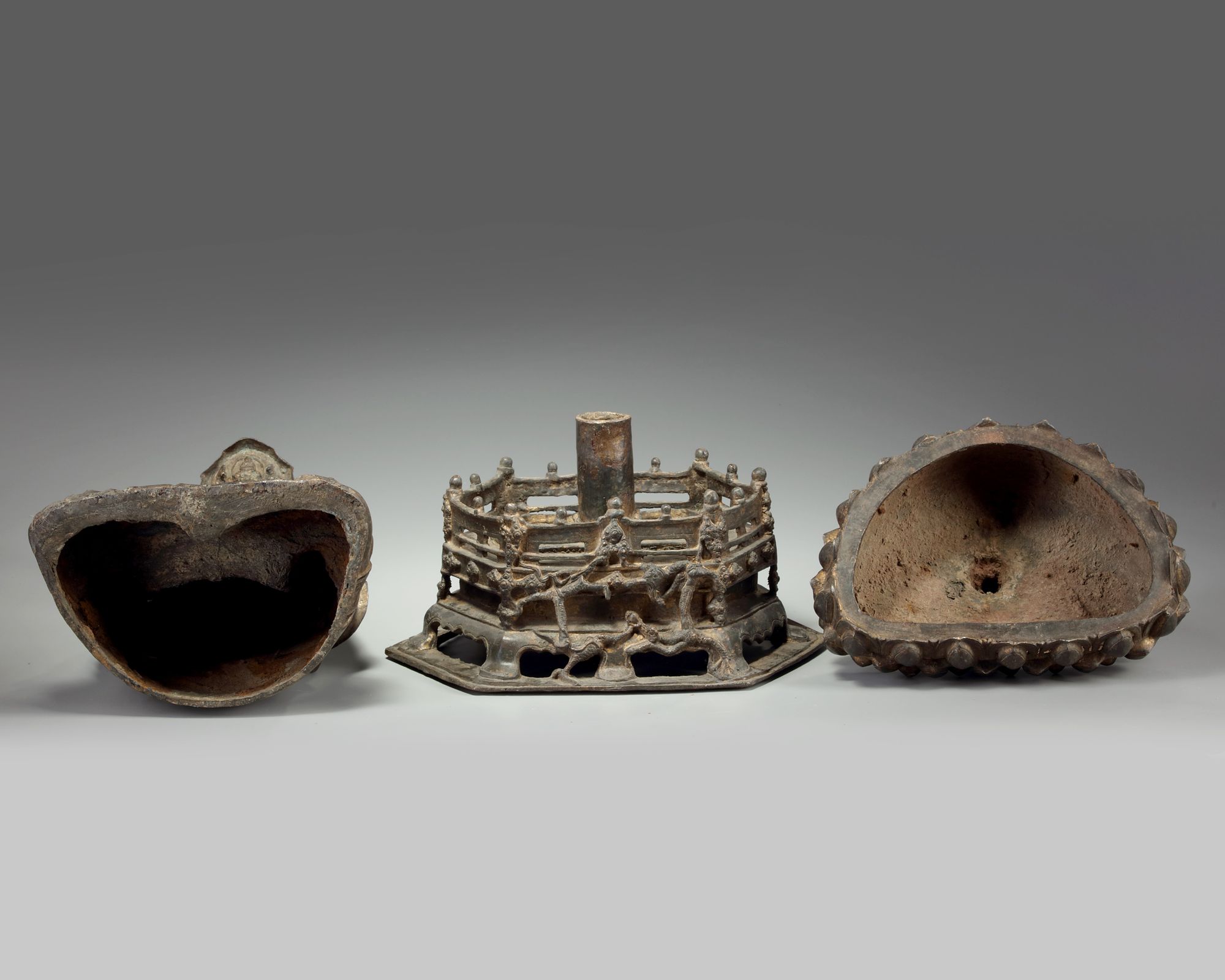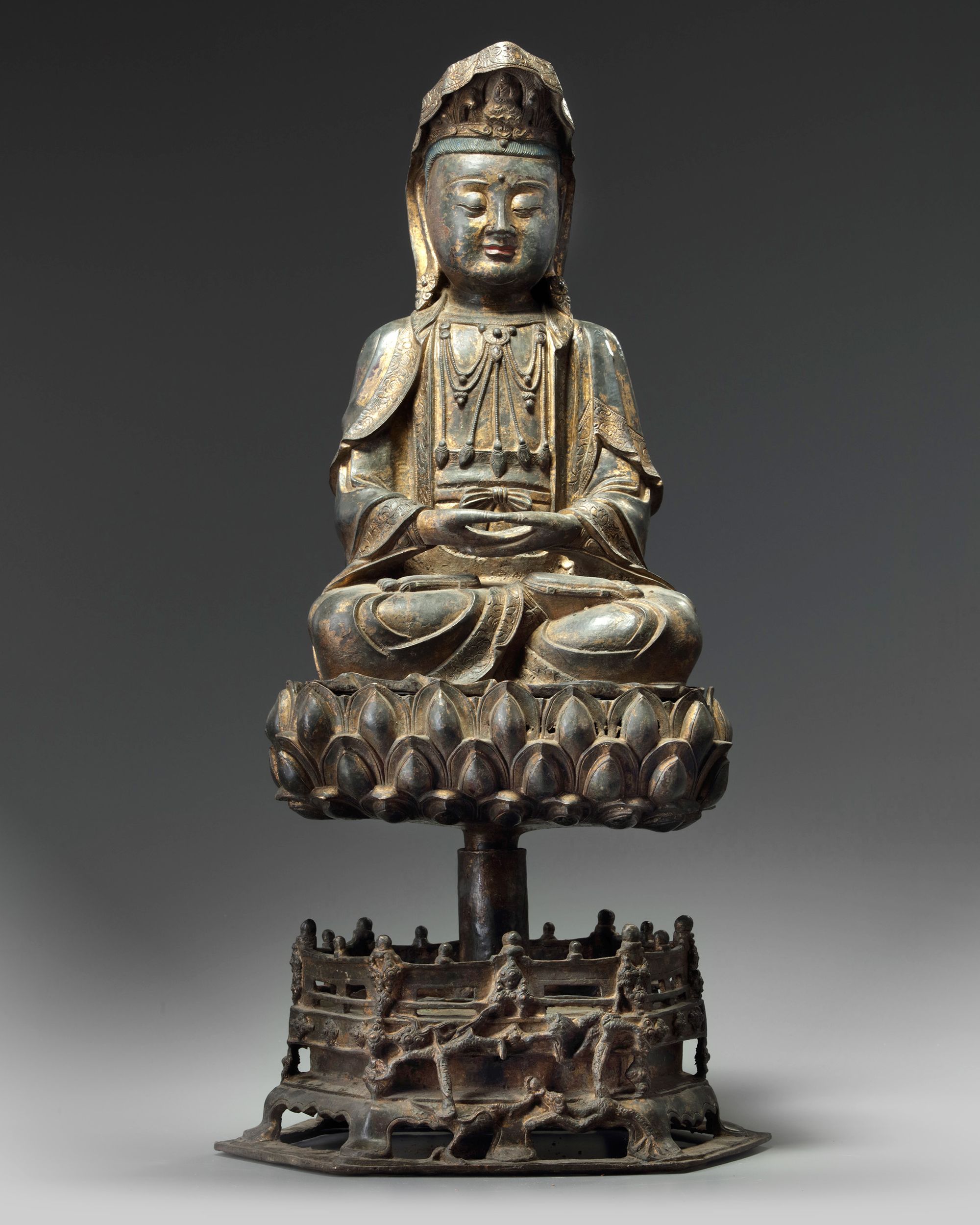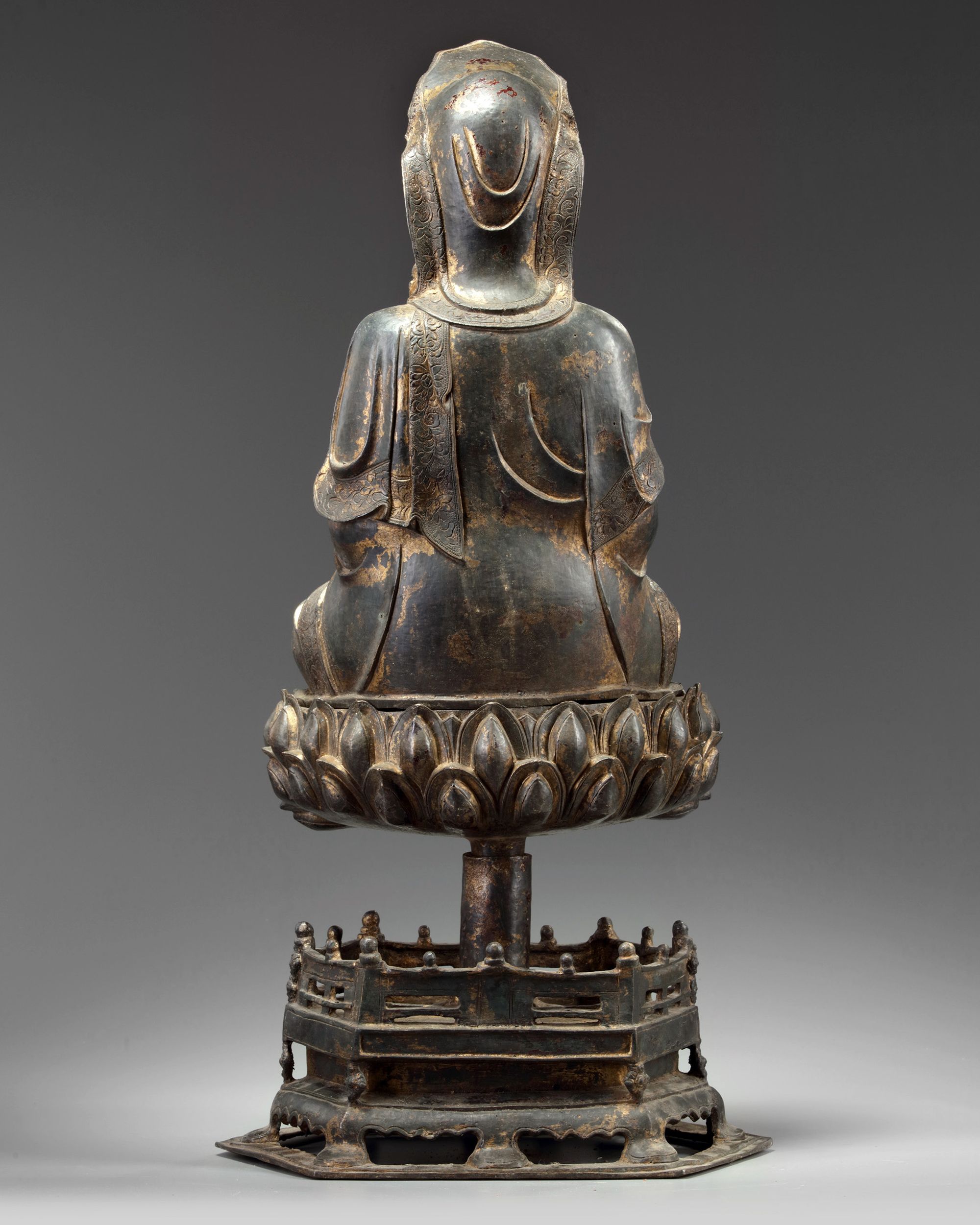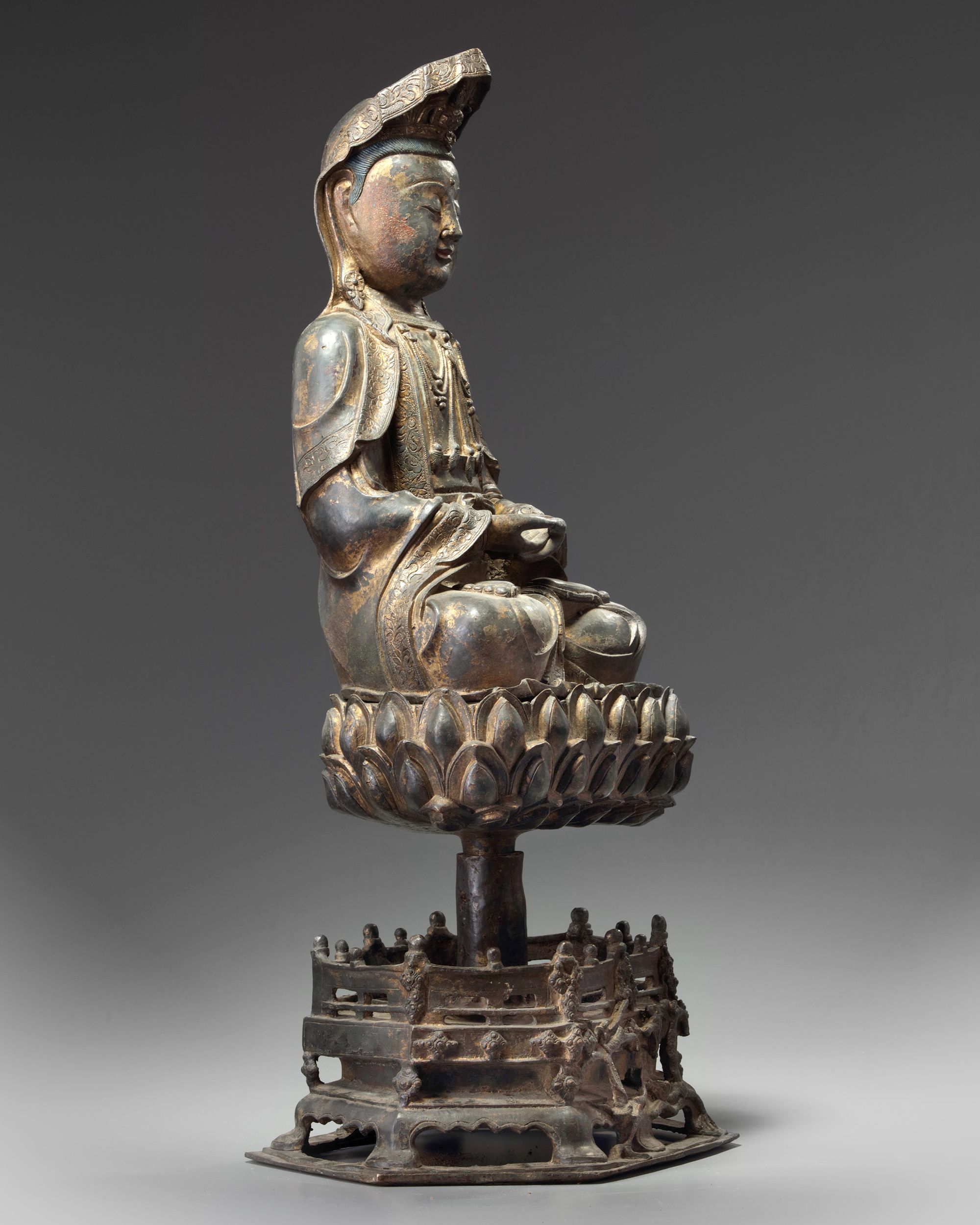 The bodhisattva is seated in dhyanamudra on a lotus base supported on a galleried hexagonal plinth. She has downcast eyes and a benevolent expression. Her hair is finely detailed and upswept into a top knot beneath the robes, that are loosely draped about the body and open at her bejewelled chest, the hems are finely incised with a scrolling floral border and beaded edge