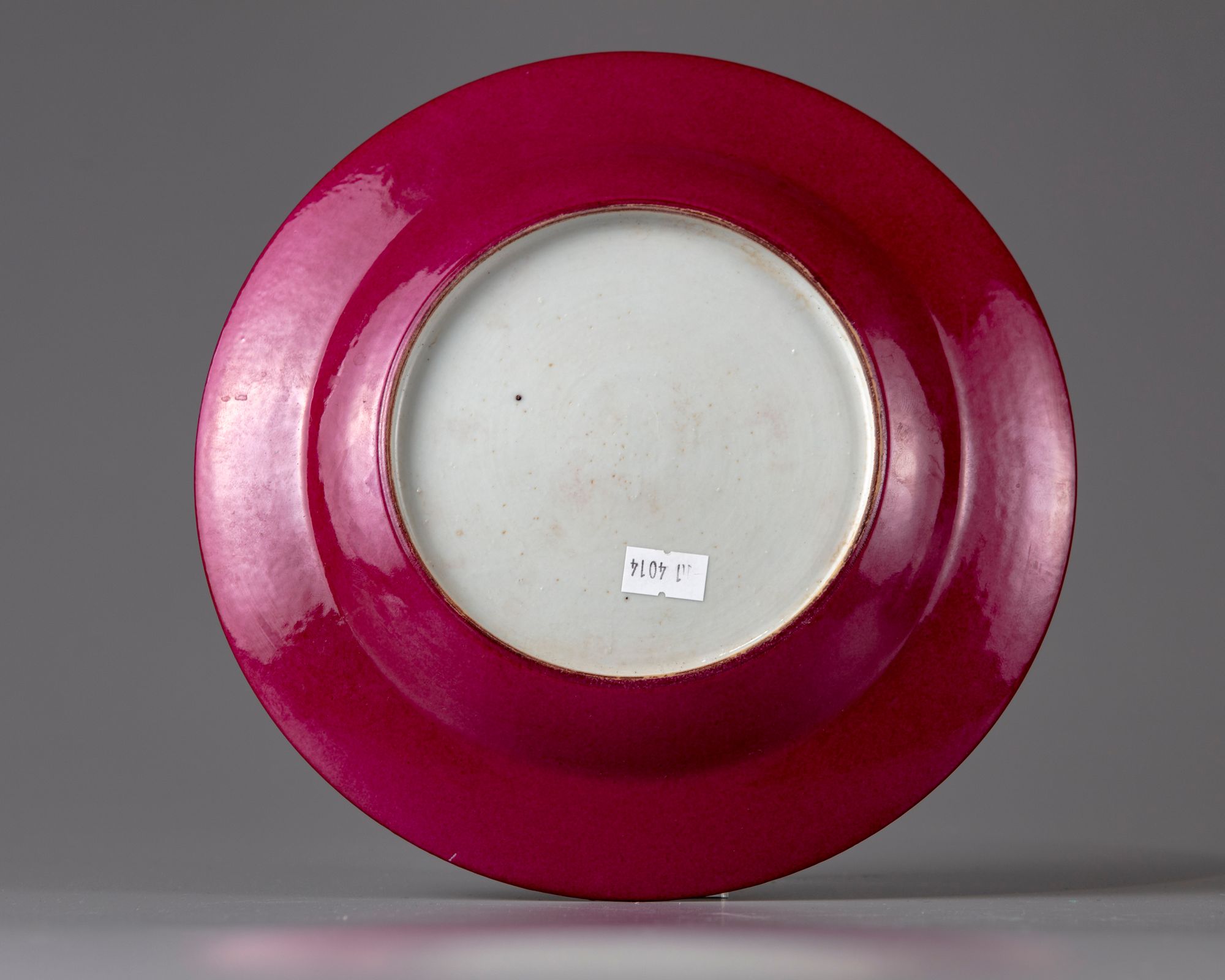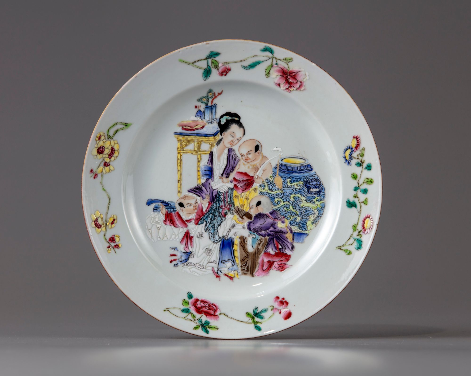 The shallow rounded sides rising to a conical rim, finely and elaborately enamelled with an elegant lady and three boys, one holding a sceptre, one playing a pipe, and the last standing at her feet, beside a bamboo table set with vessels, and a large jar.The sides decorated with peony sprigs and community sunflower branches.The reverse enamelled a deep ruby red