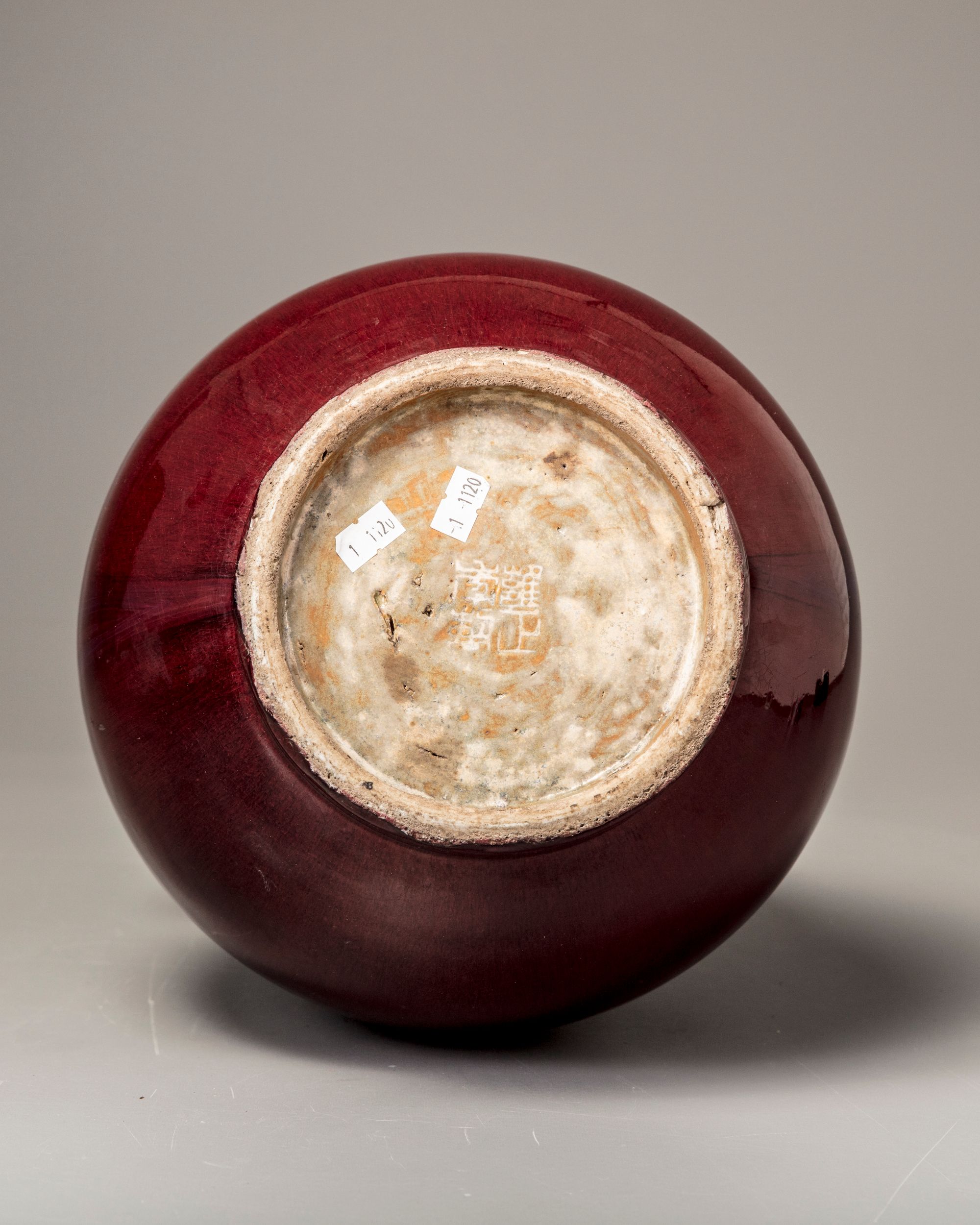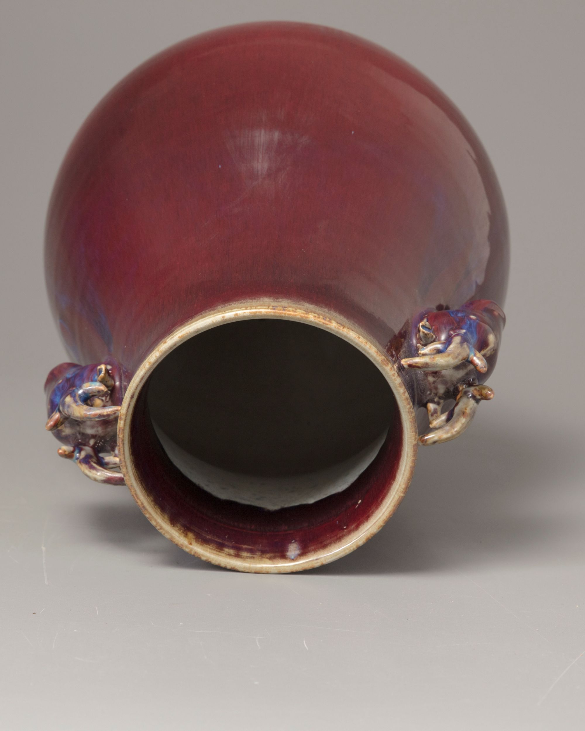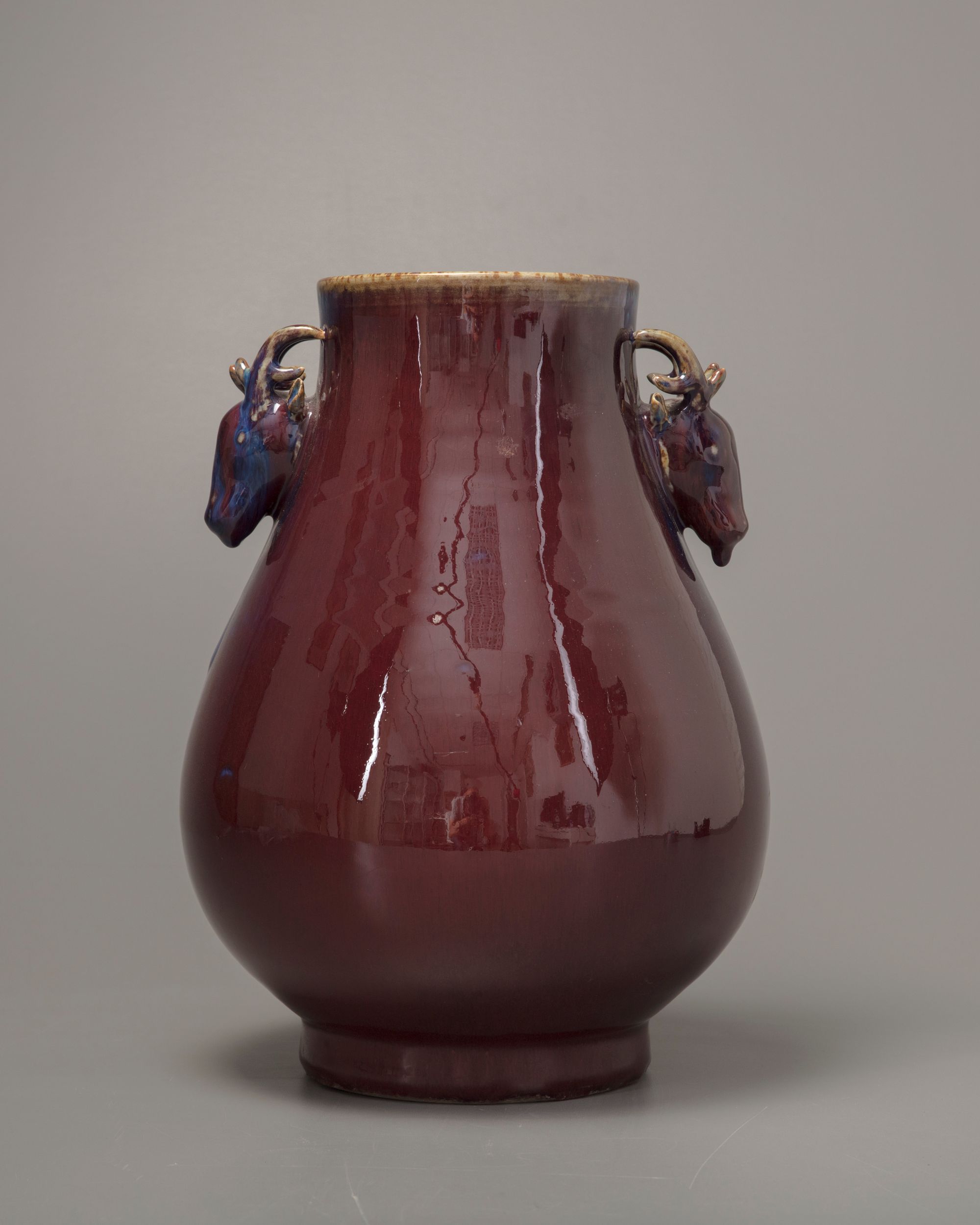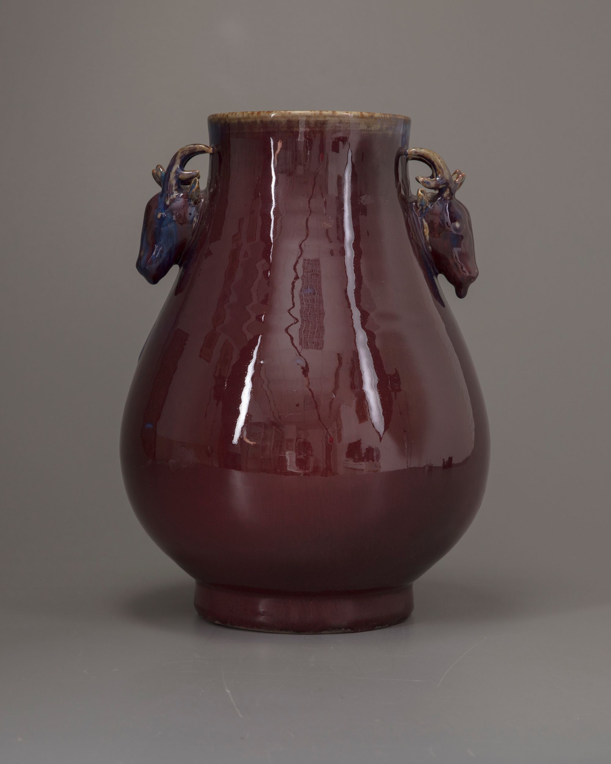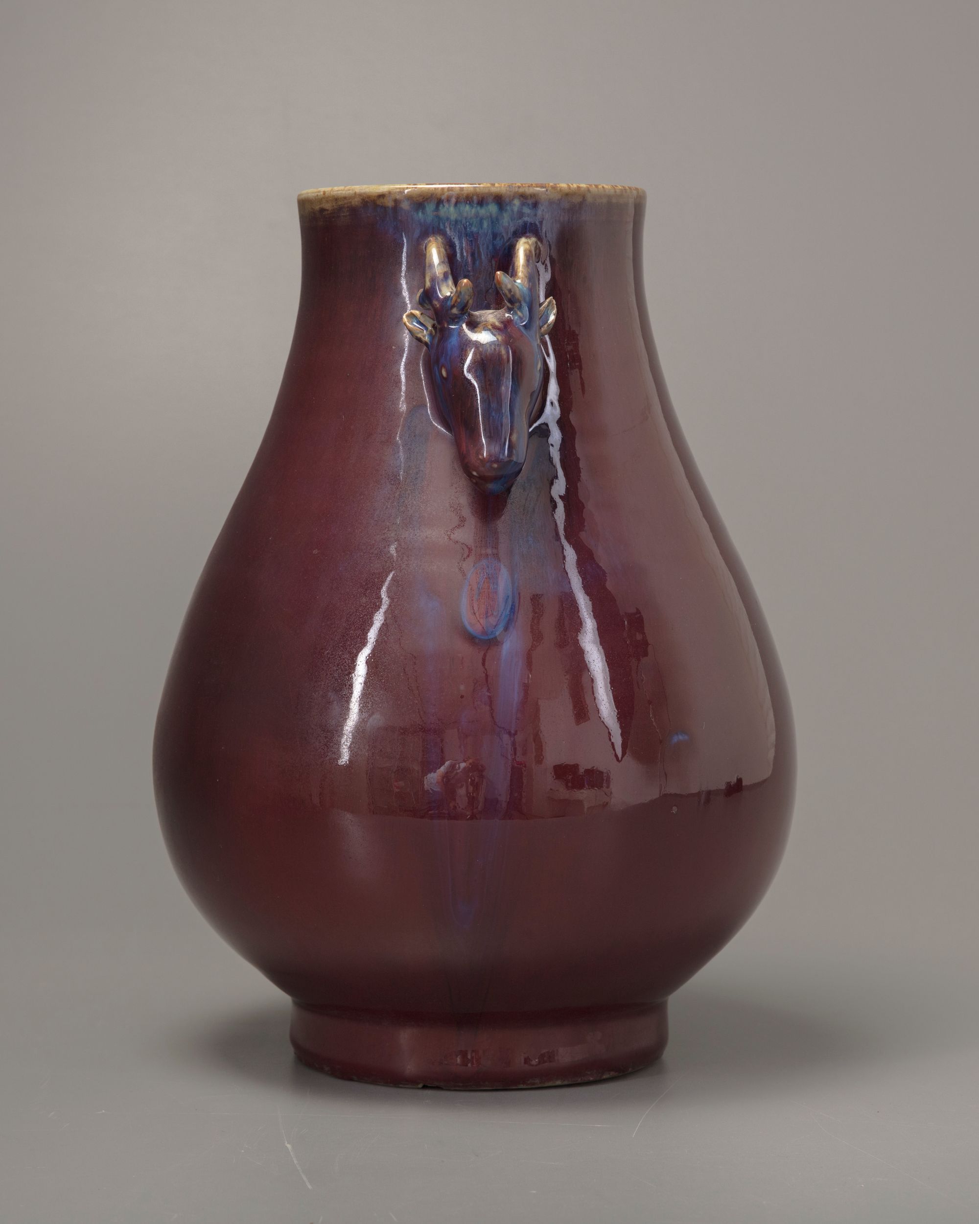 The vase is decorated with two openwork stag-head handles. It is covered with a deep purple and maroon glaze with blue highlights which thins to a crackled mushroom tone at the rim and upper part of the handles. The base with an apocryphal Yongzheng seal mark on a café-au-lait ground.