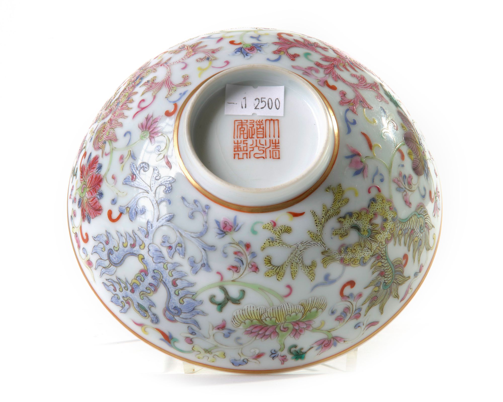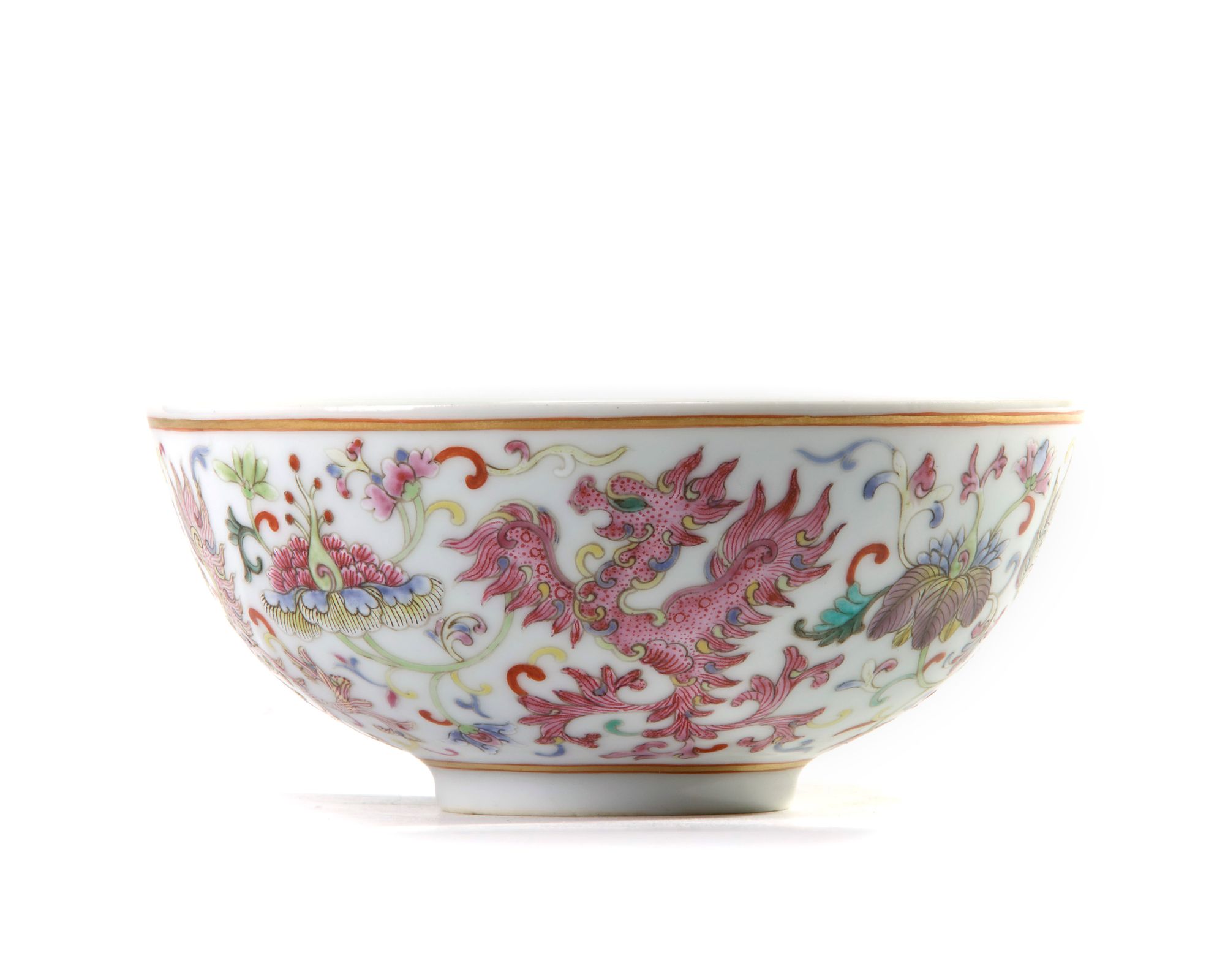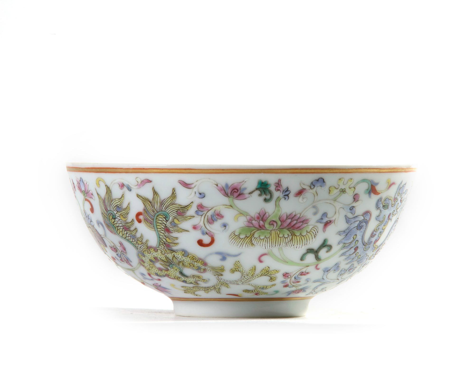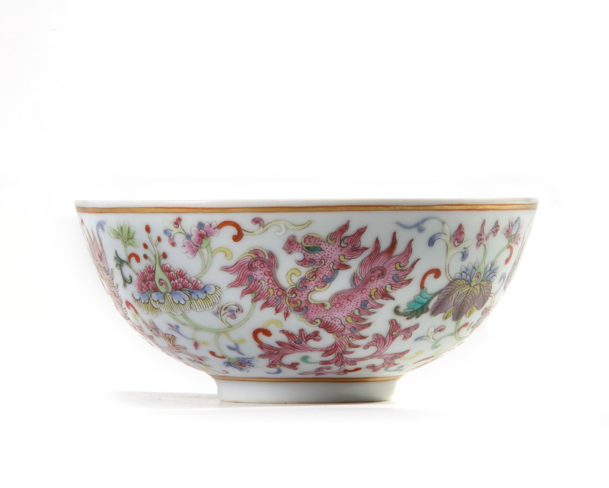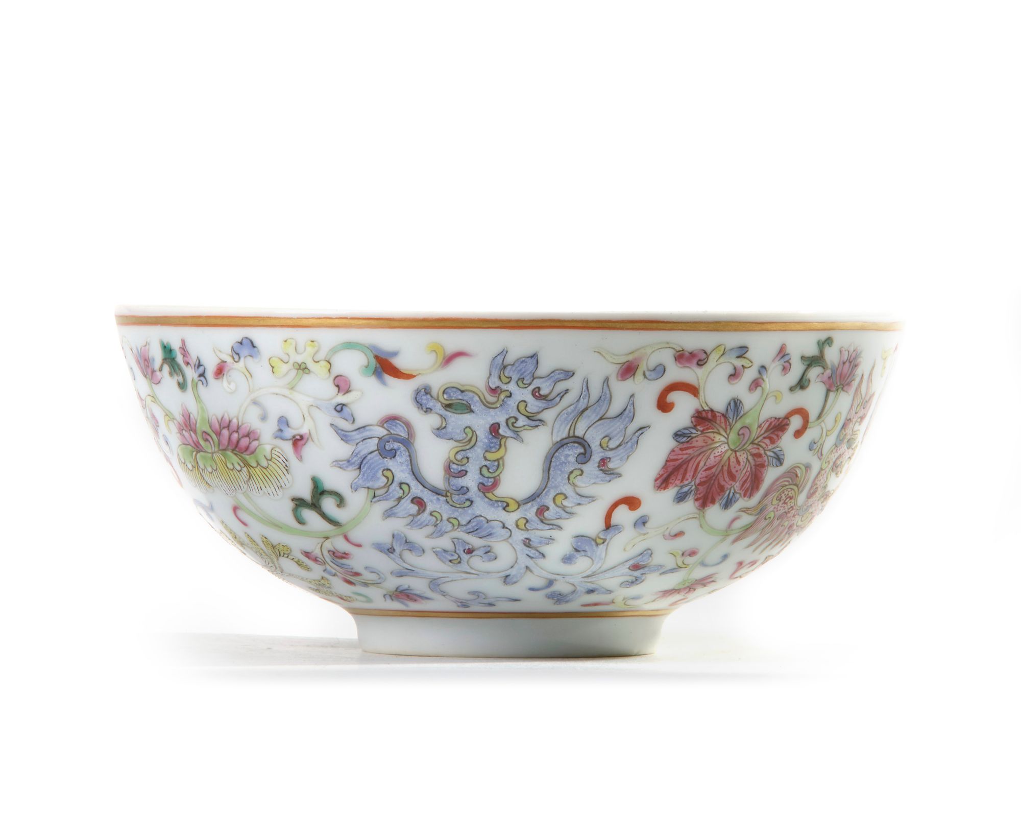 The bowl is decorated to the exterior with four phoenixes in various enamels all in flight between scrolling flowers, between two gilt borders. The base with an apocryphal Daoguang seal mark.
