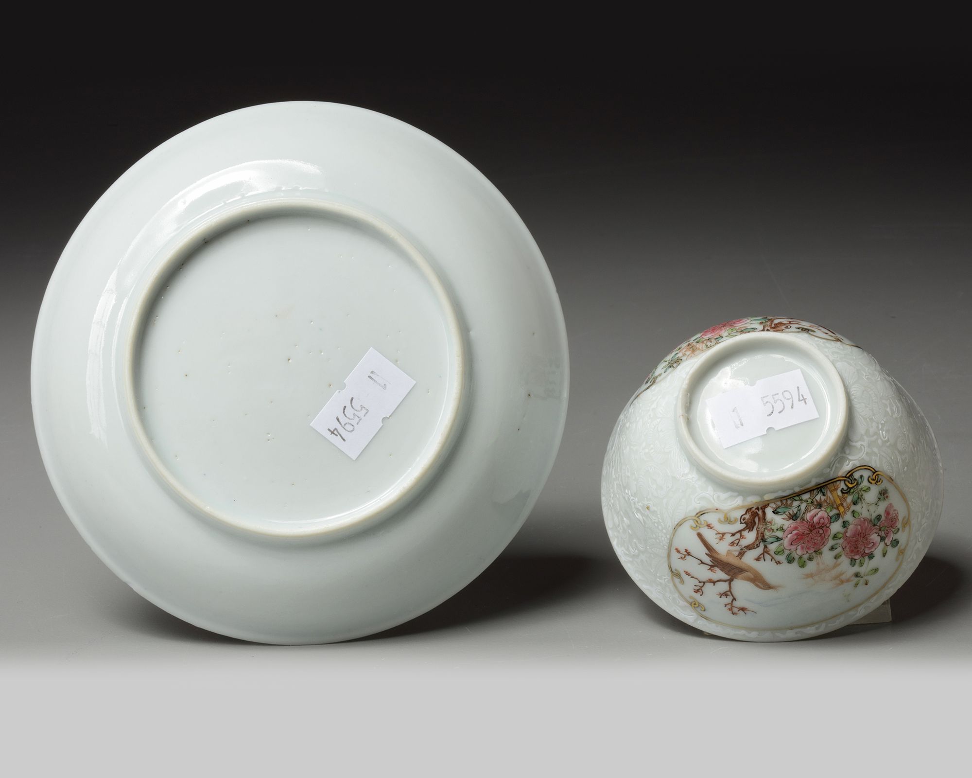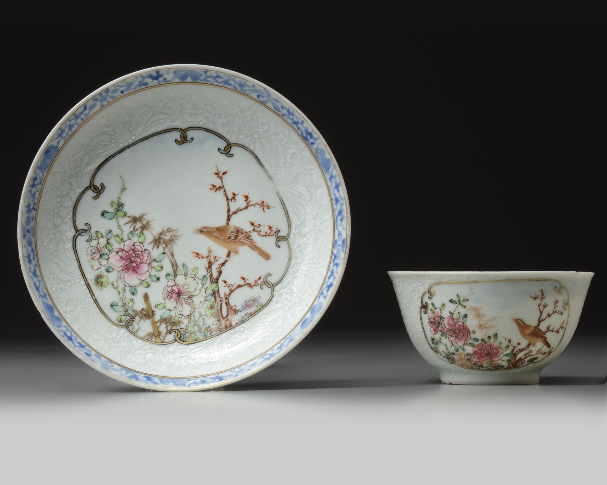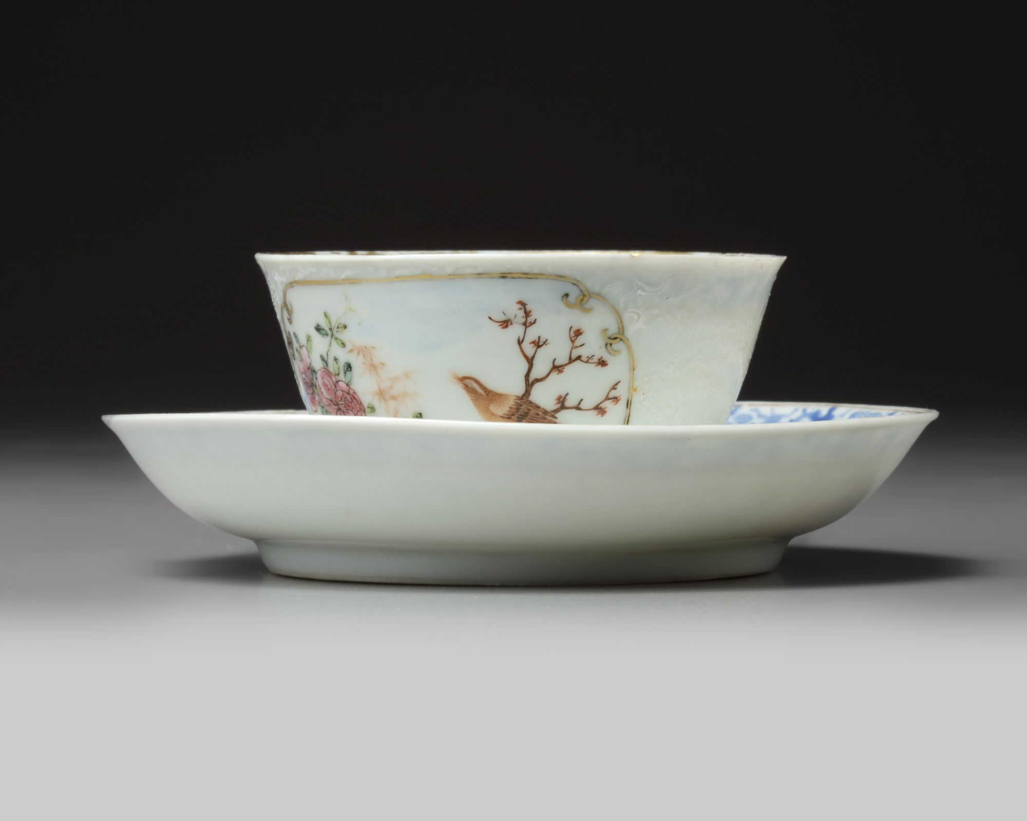 The saucer is decorated with a bird perched on a flowering branch amongst blossoming peonies and bamboo, the panel is surrounded by a floral border executed in bianco sopra bianco, further encircled by a blue enamelled floral band. The cup is similarly decorated.