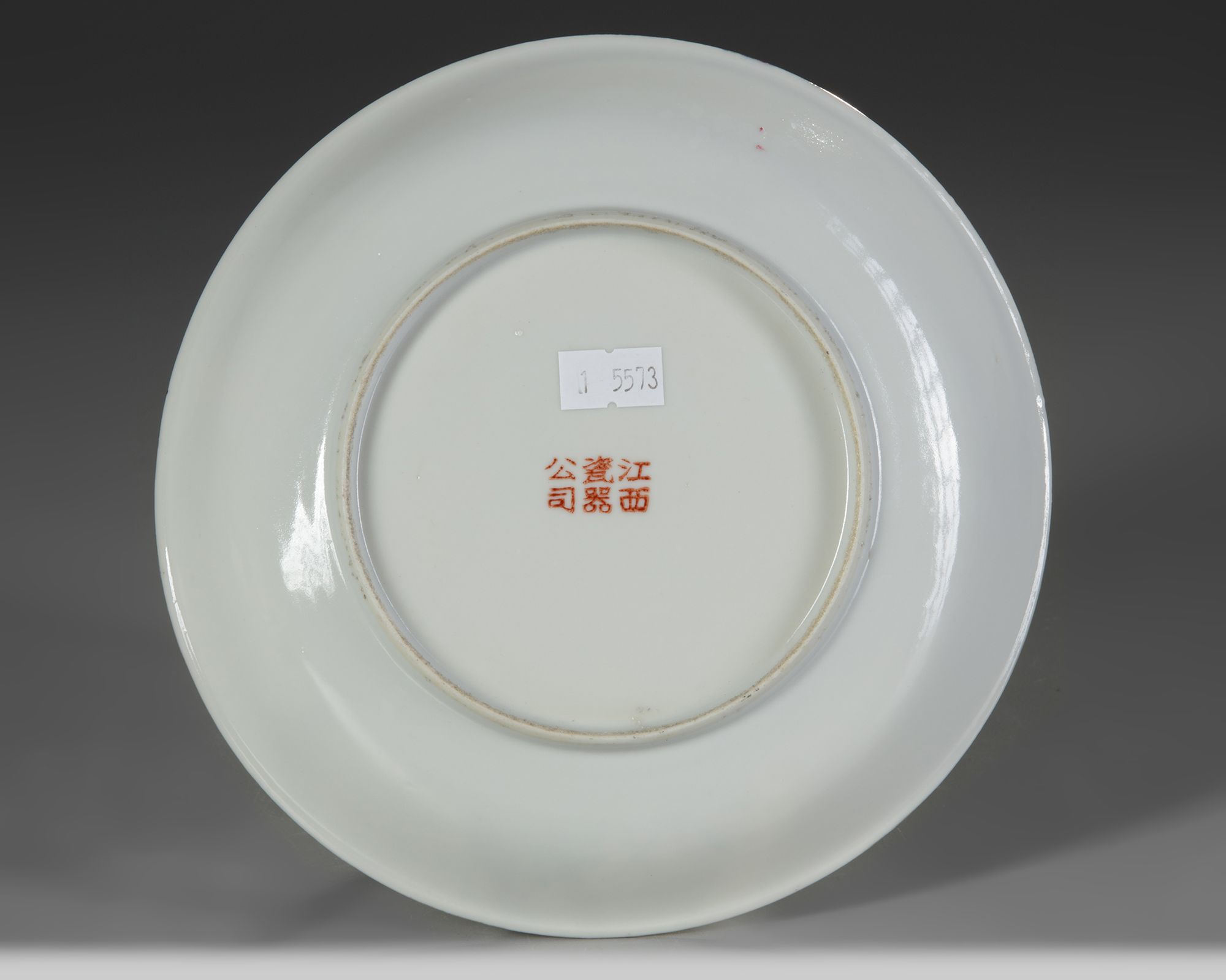 The dish is decorated to the interior with a bird perched on a prunus blossom branch above a flowering chrysanthemum. The dish is inscribed with a four-letter inscription and signed ‘Jiangxi chupin’ (product of Jiangxi). The rim is gilt.