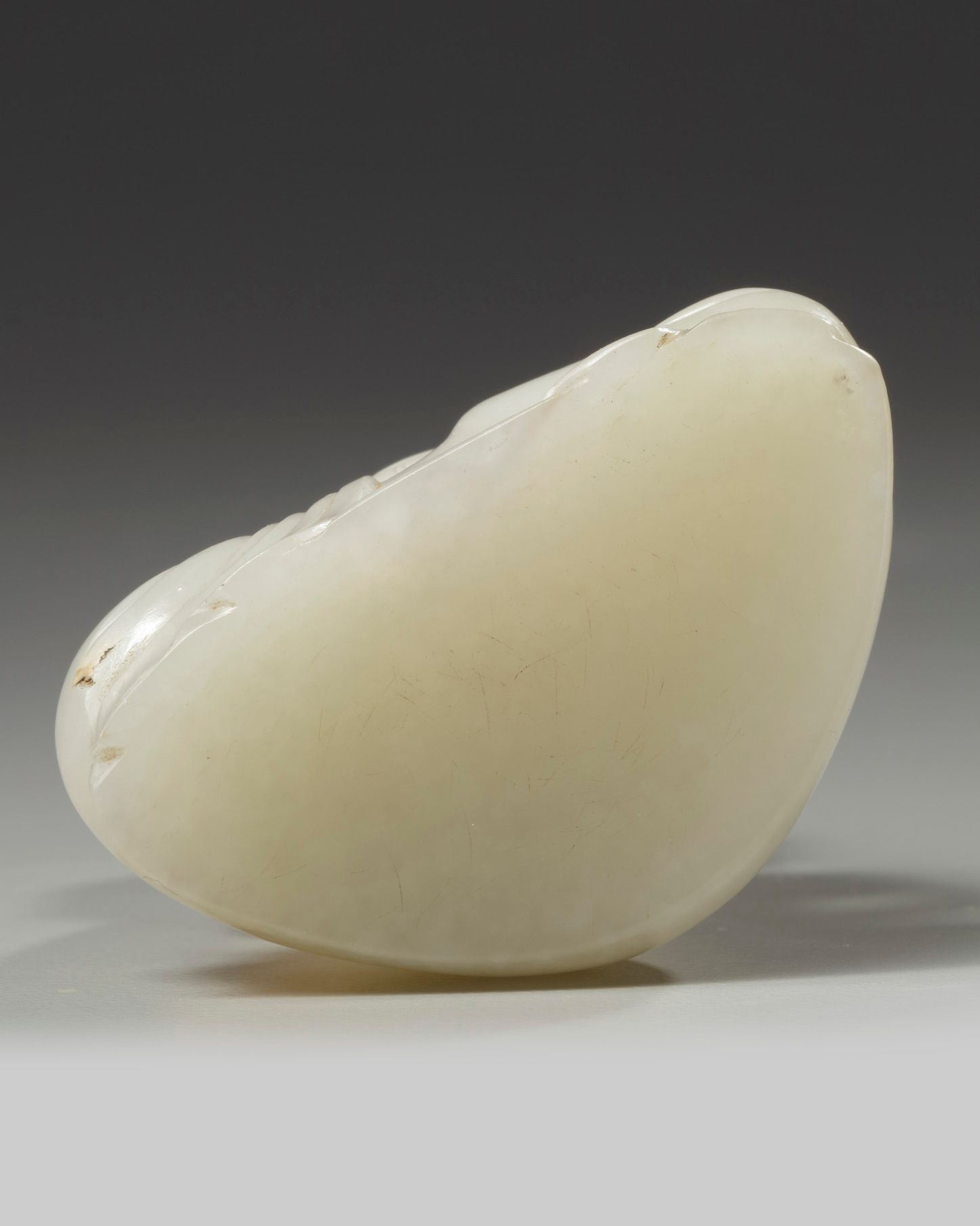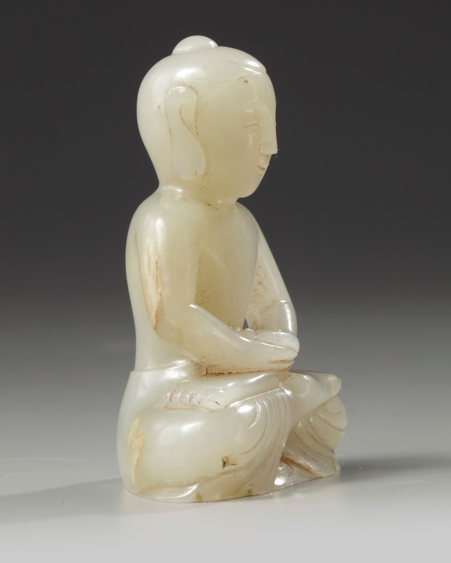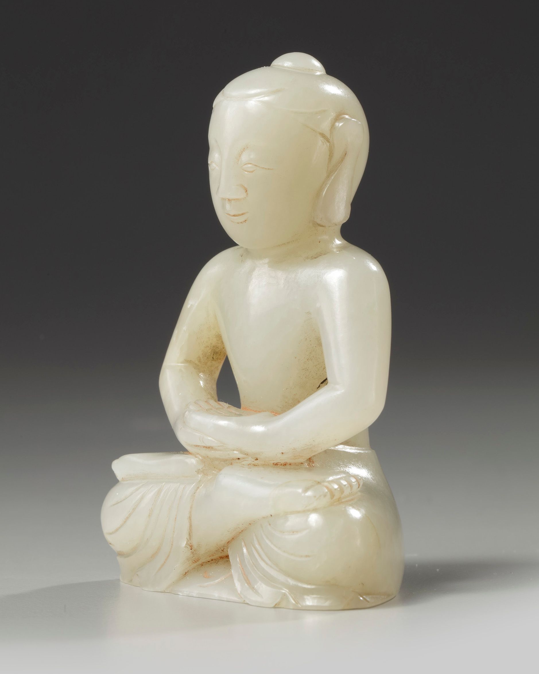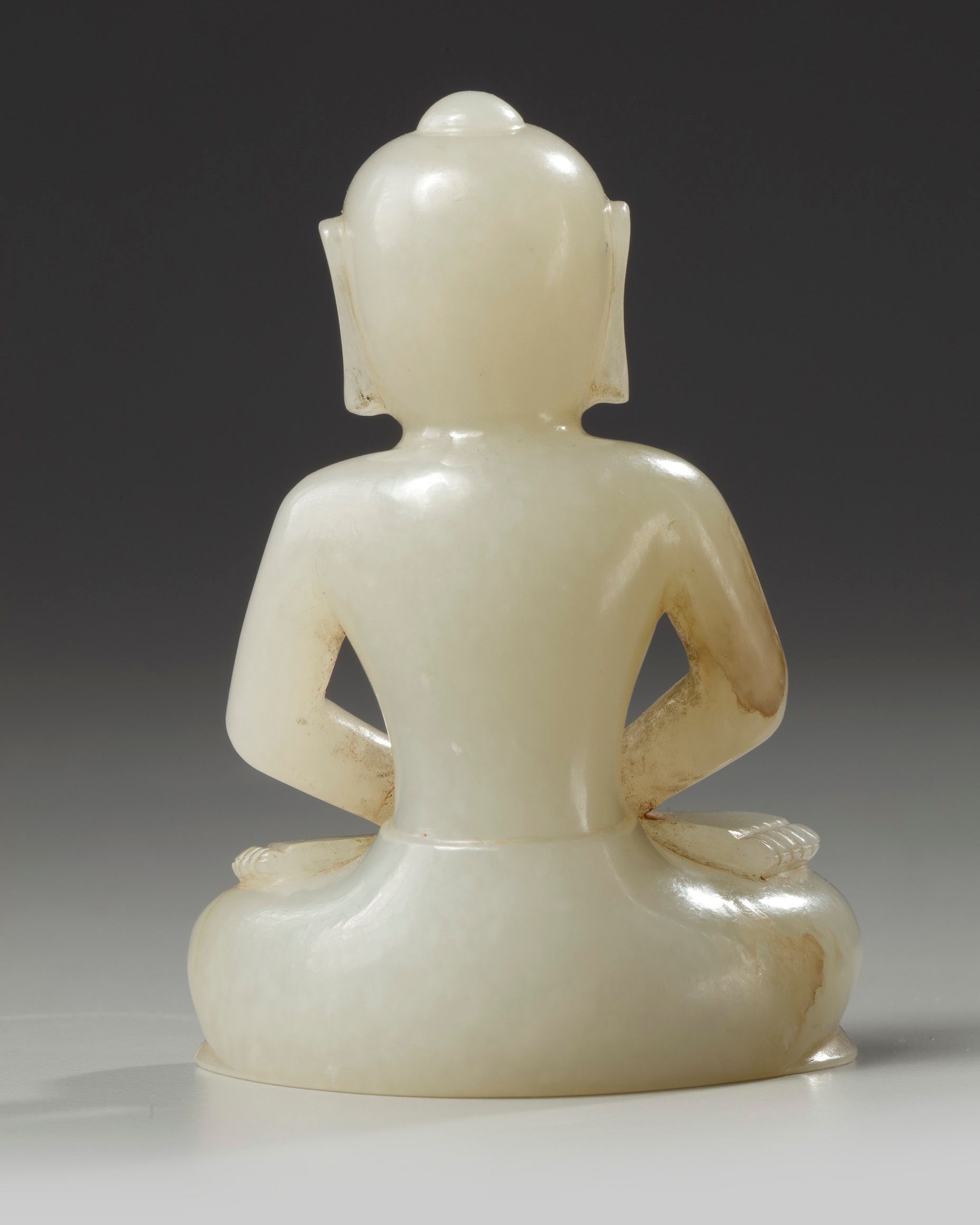 Carved with a smiling face and two pendulous earlobes, the hands in dhyanamudra and legs in padmasana. The stone of an even pale tone.
