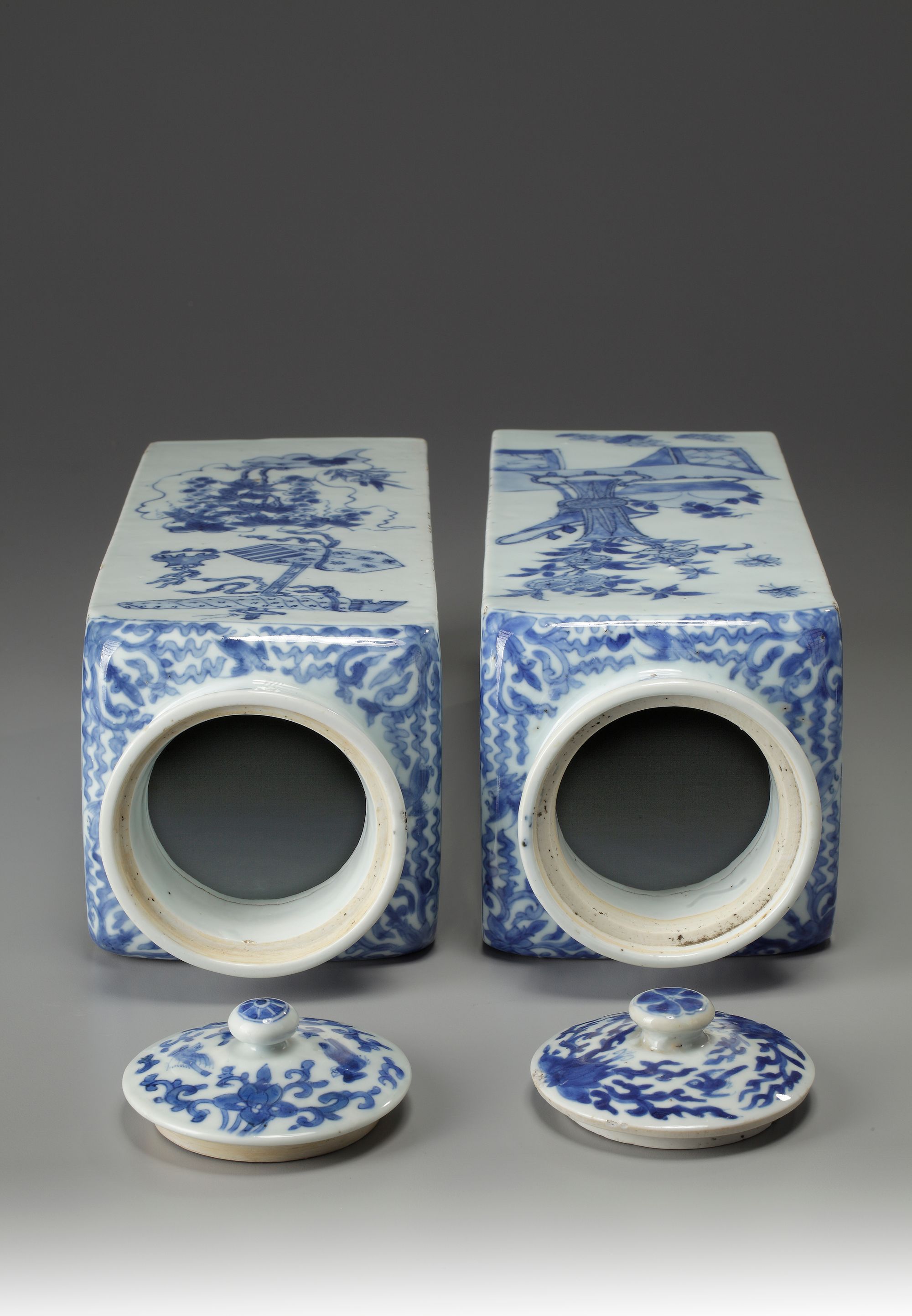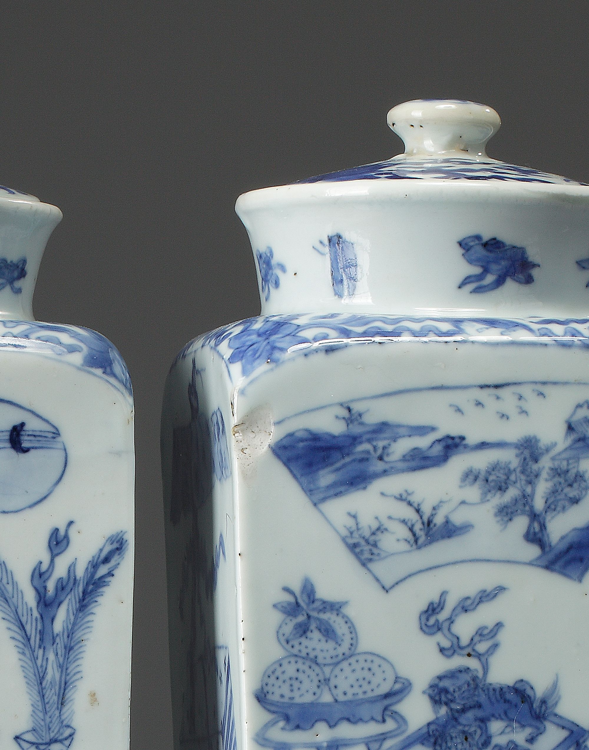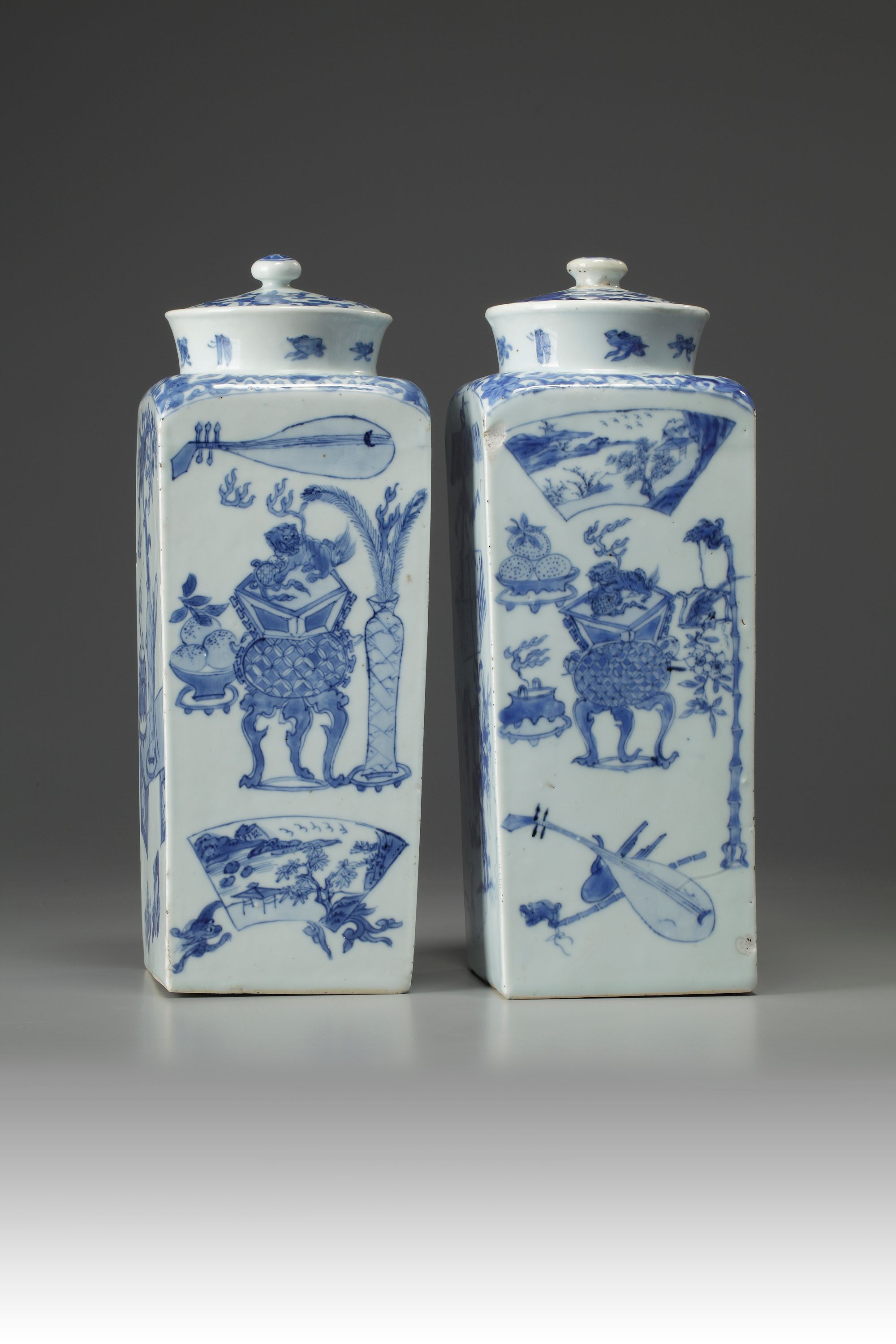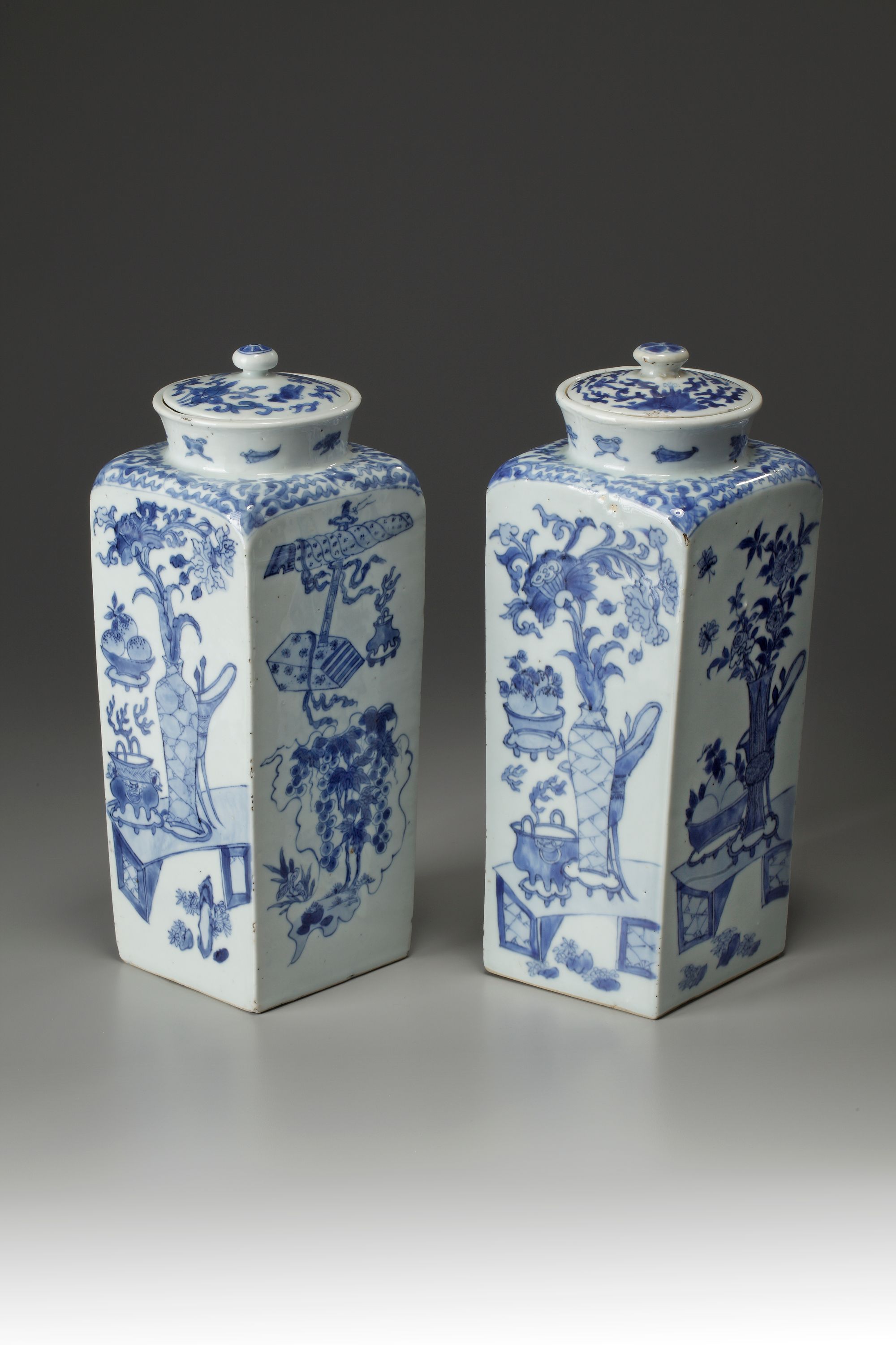 Each side decorated in underglaze blue with precious objects, the shoulders and lids are decorated with floral designs and birds.