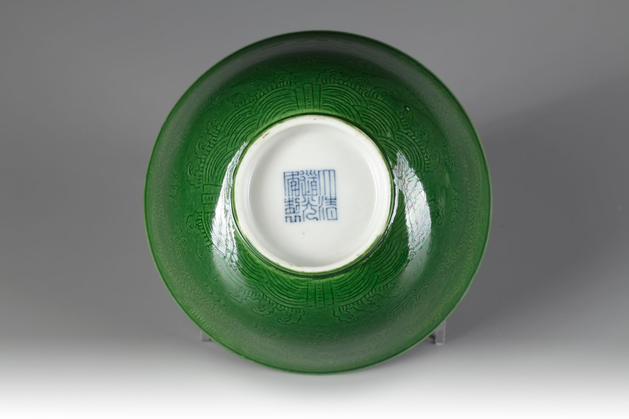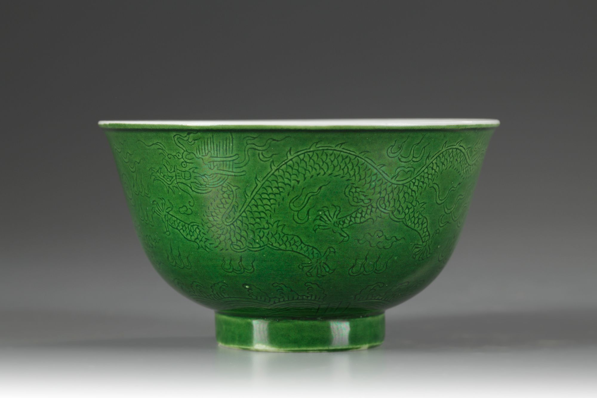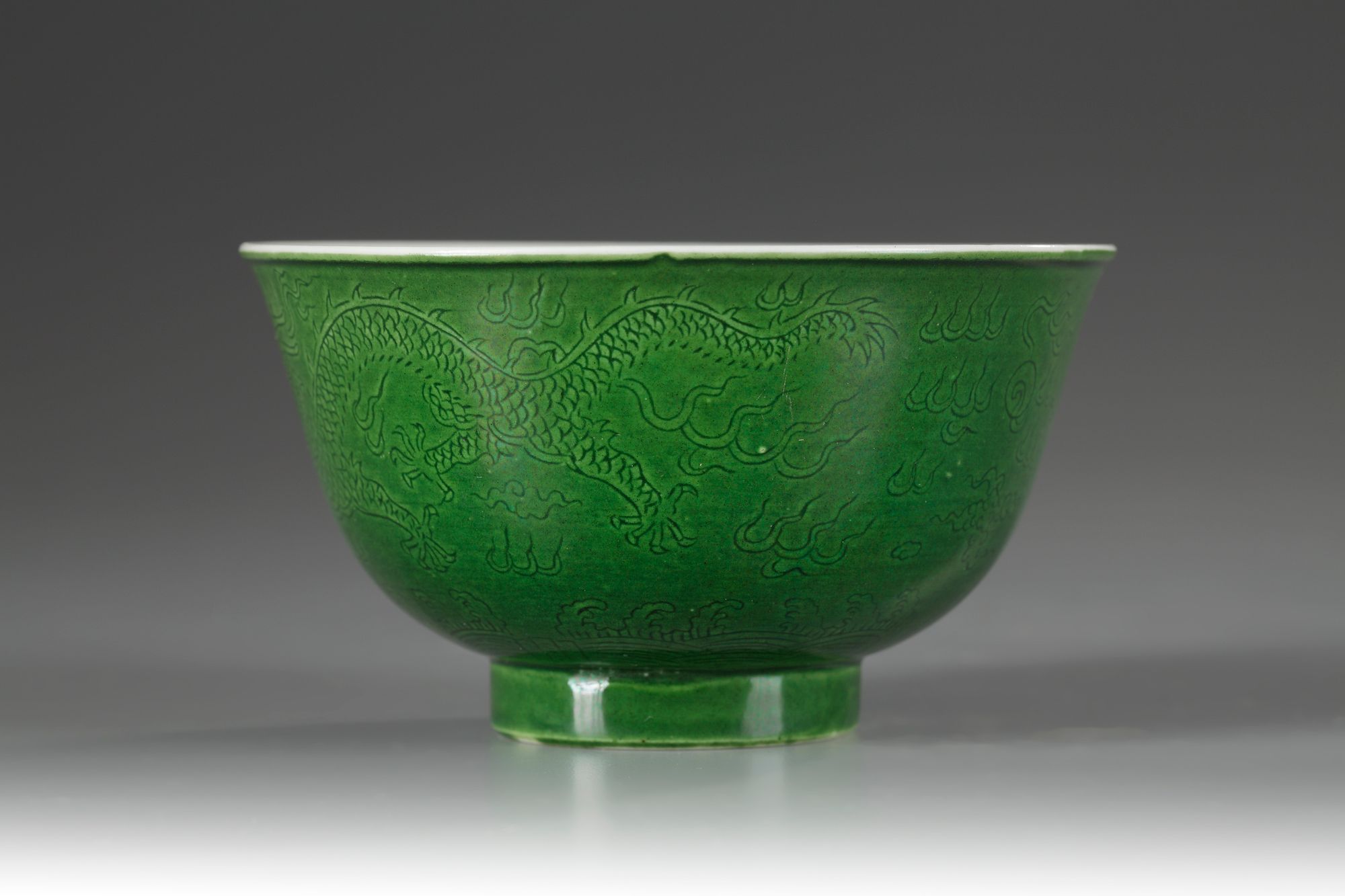 The green glazed exterior decorated with incised dragons chasing the flaming pearl over scrolling waves.