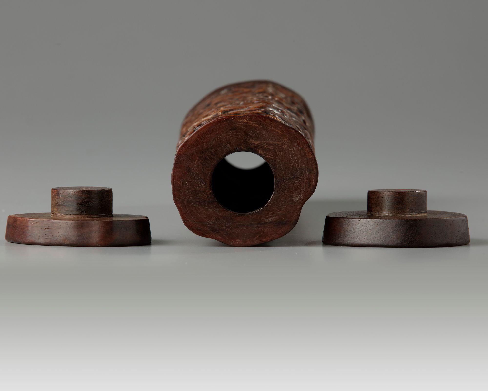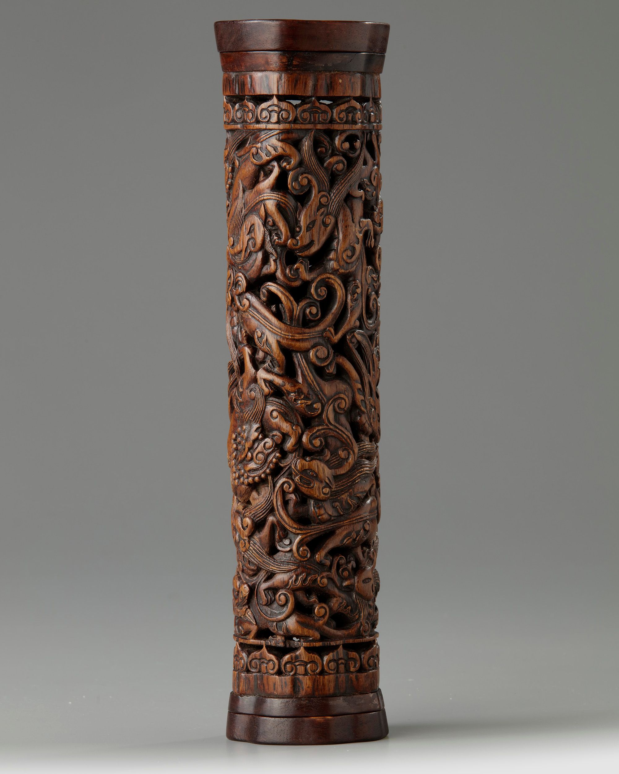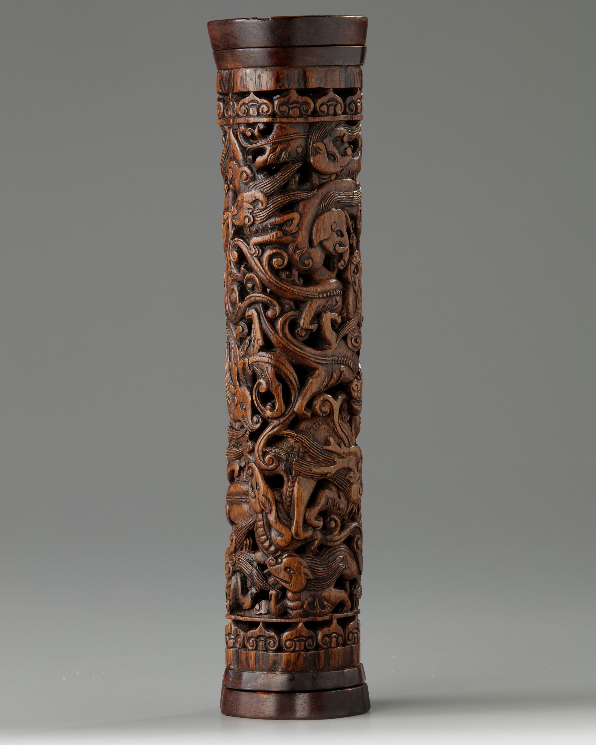 The central section is carved in openwork with a multitude of intertwined mythical and auspicious animals such as elephants, qilin, buddhist lions, and dragons, all between to bands of ruyi heads. The upper and lower section are mounted in wood.