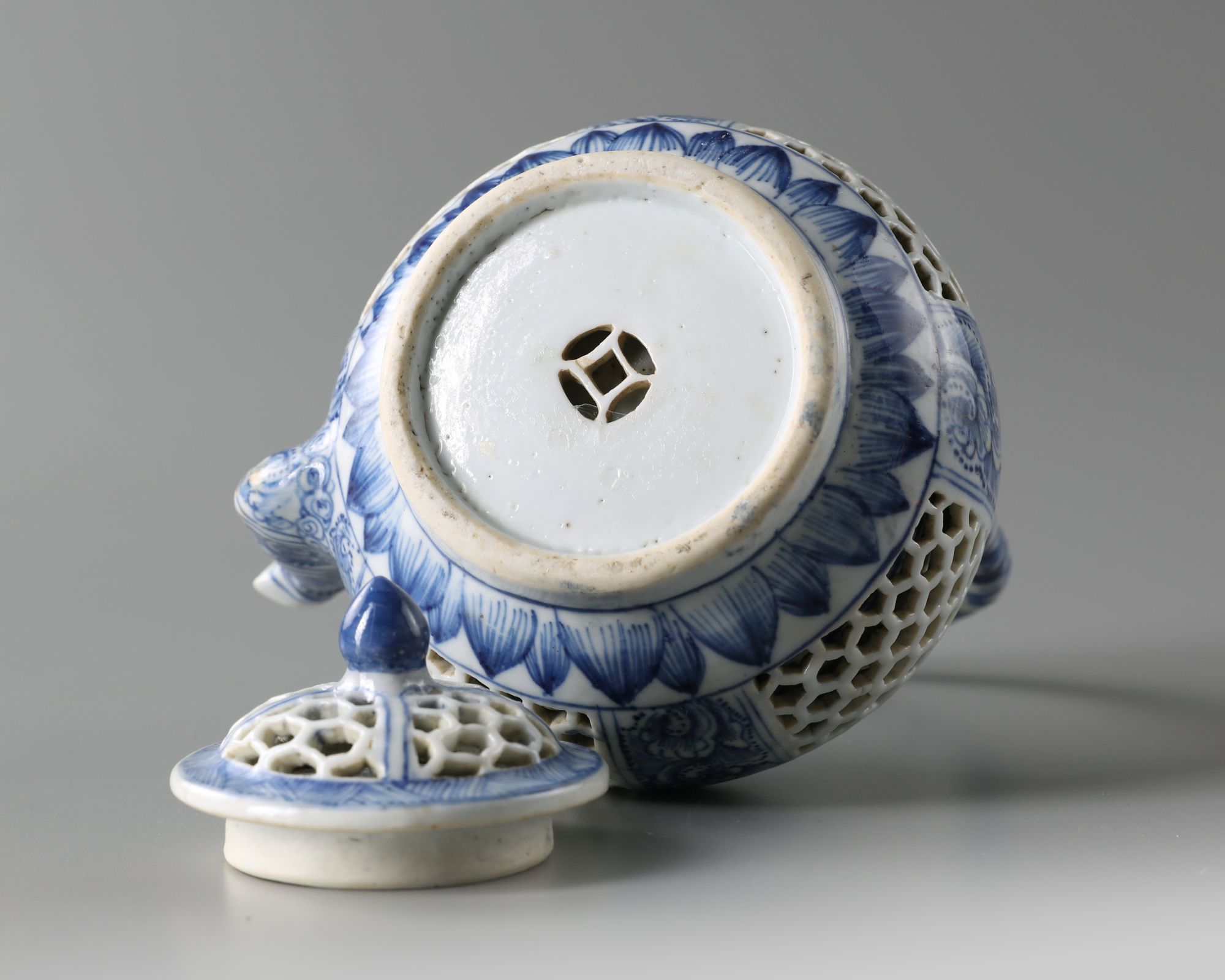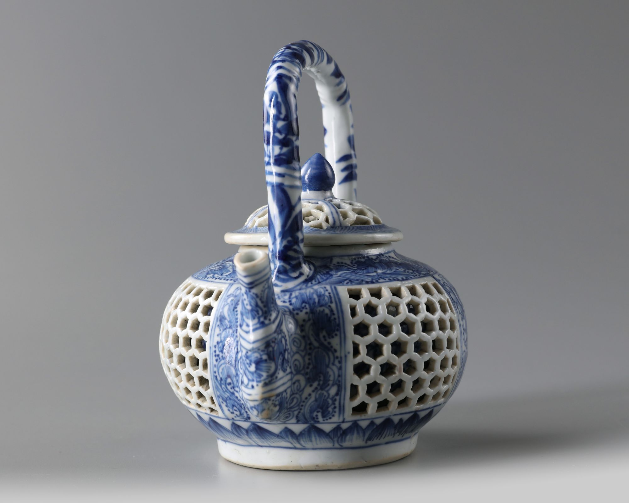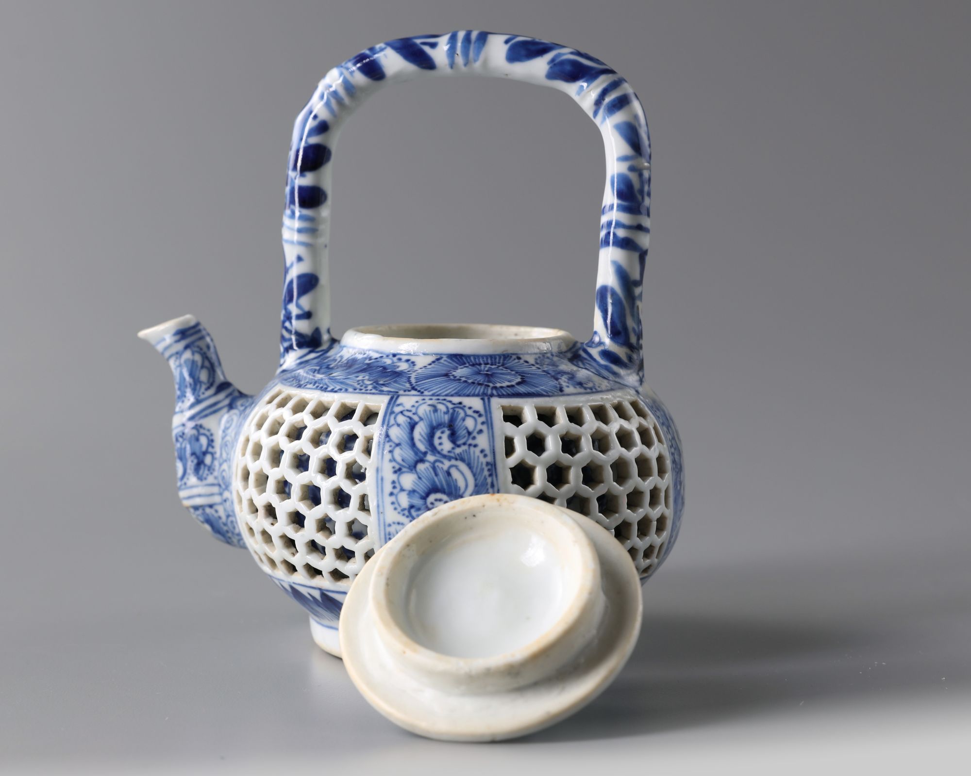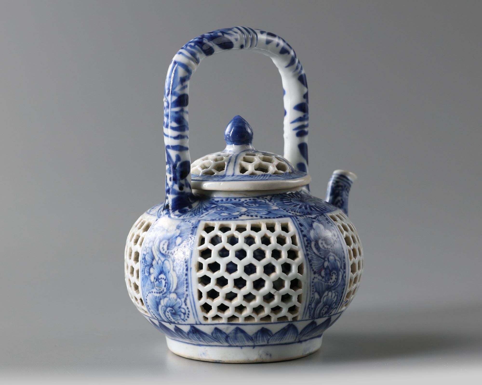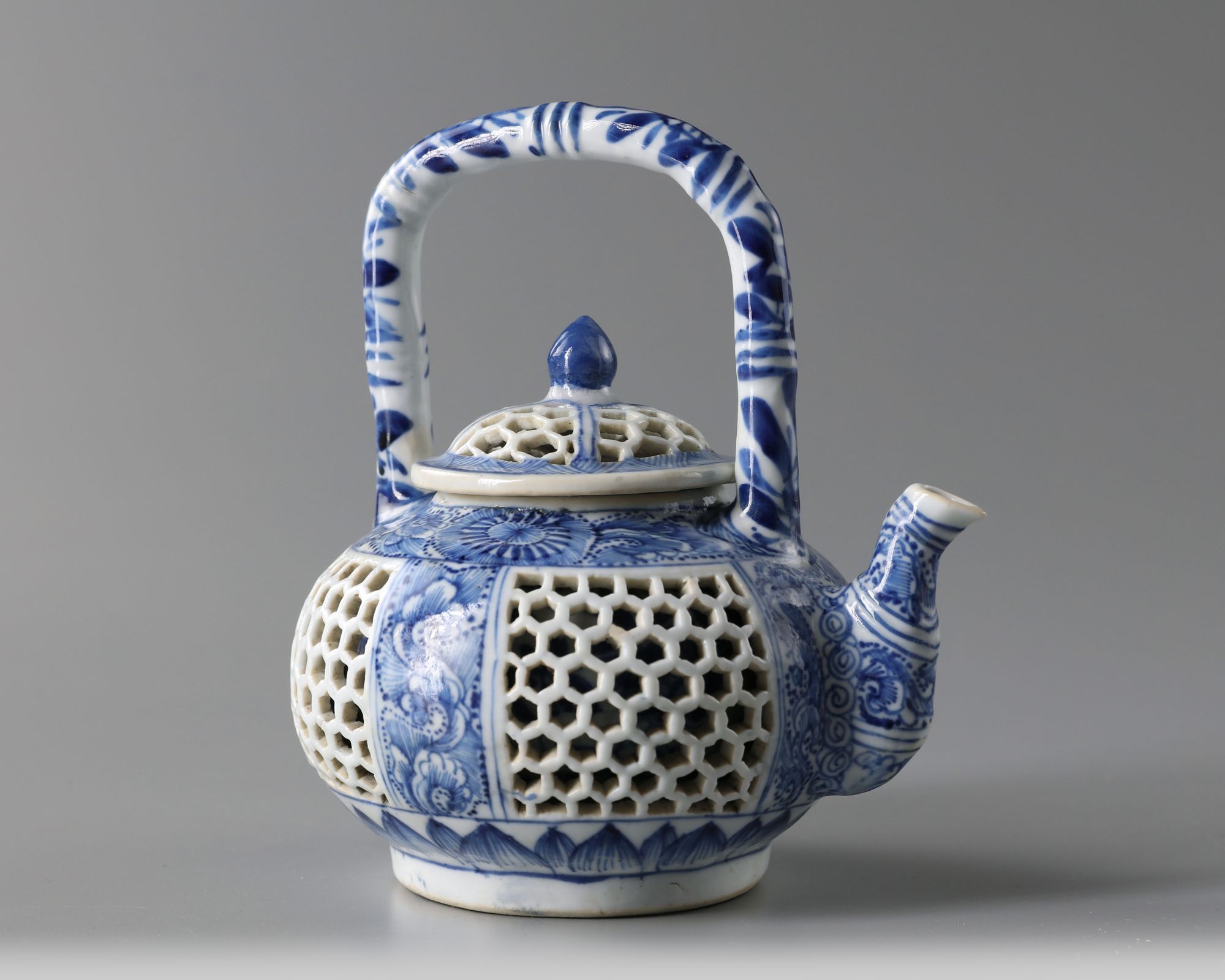 The teapot is of globular shape and arched handle, the double-walled body is finely decorated with hexagonal openwork panels surrouned by a border of plant and floral motifs in pencil style. The inner wall is decorated with further flowers and the base is decorated with an openwork pierced cash symbol. The domed cover is decorated with further pierced panels.